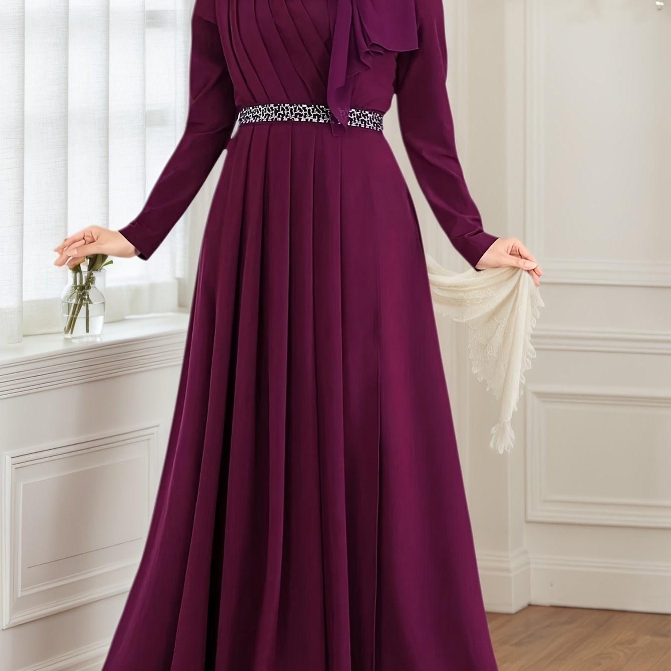 Discover the perfect blend of elegance and comfort with our Women's Elegant Formal Party Wedding Dress. This long sleeve maxi gown features a belted waist for a flattering silhouette, crafted from non-stretchy fabric that's ideal for any formal occasion. Whether you're attending a wedding, a special event, or simply want to make a statement, this sophisticated and stylish outfit is designed to impress.