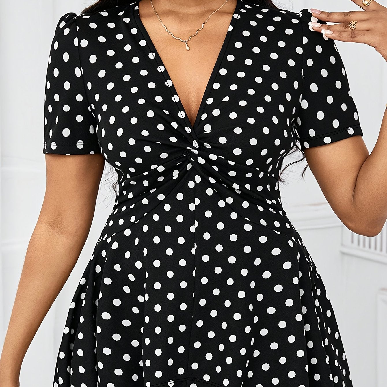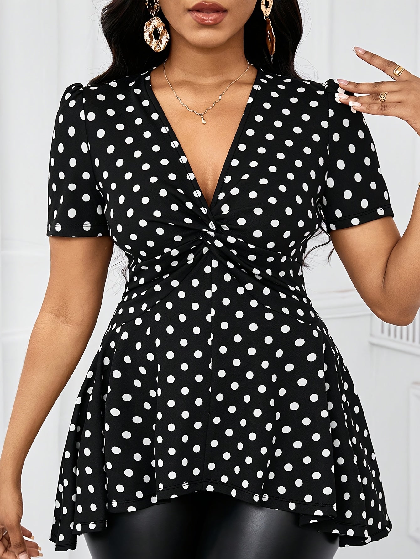 Women’s Black Polka Dot T-Shirt - Elegant Twist Front for All Seasons