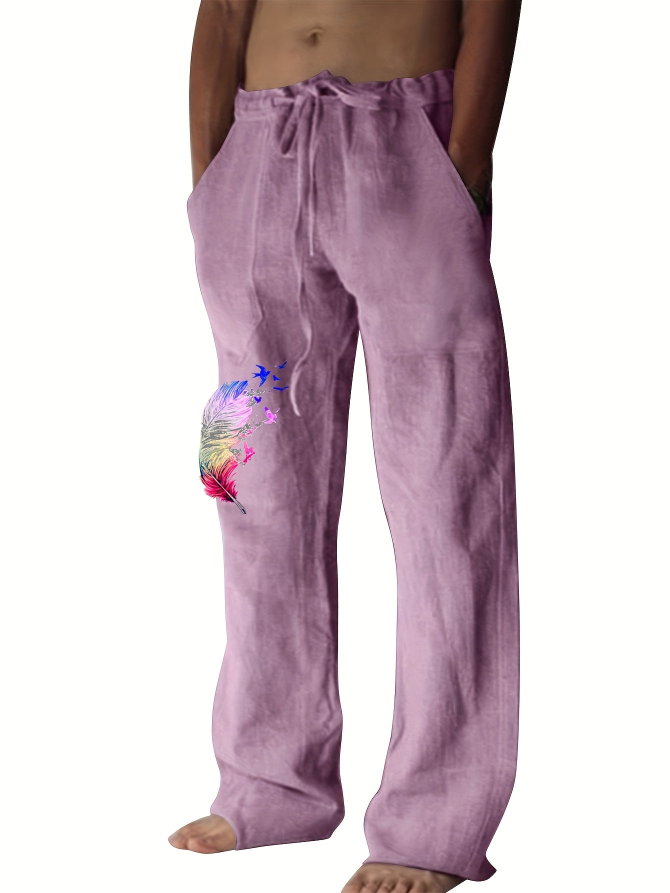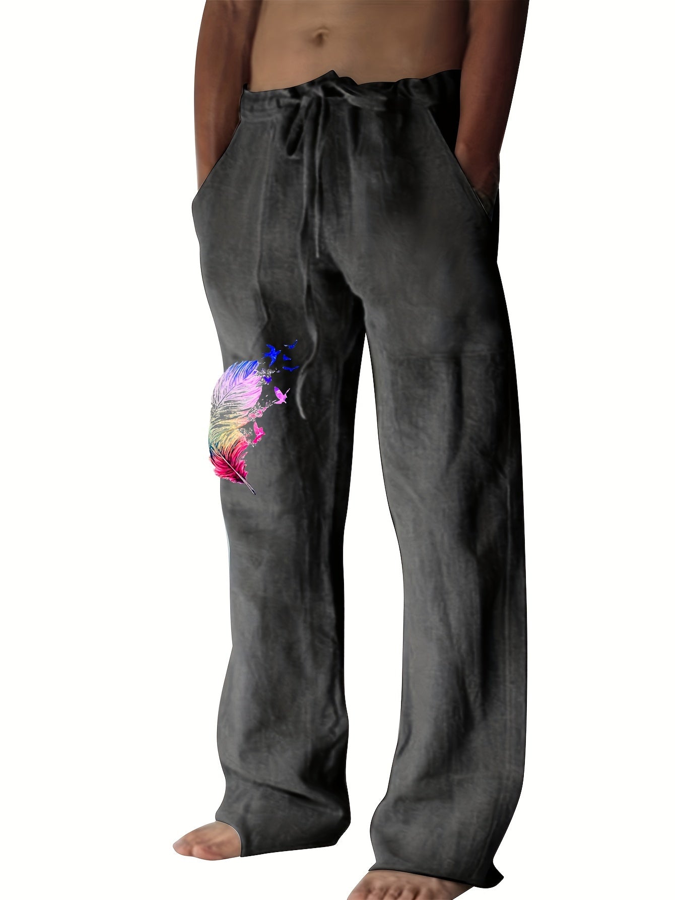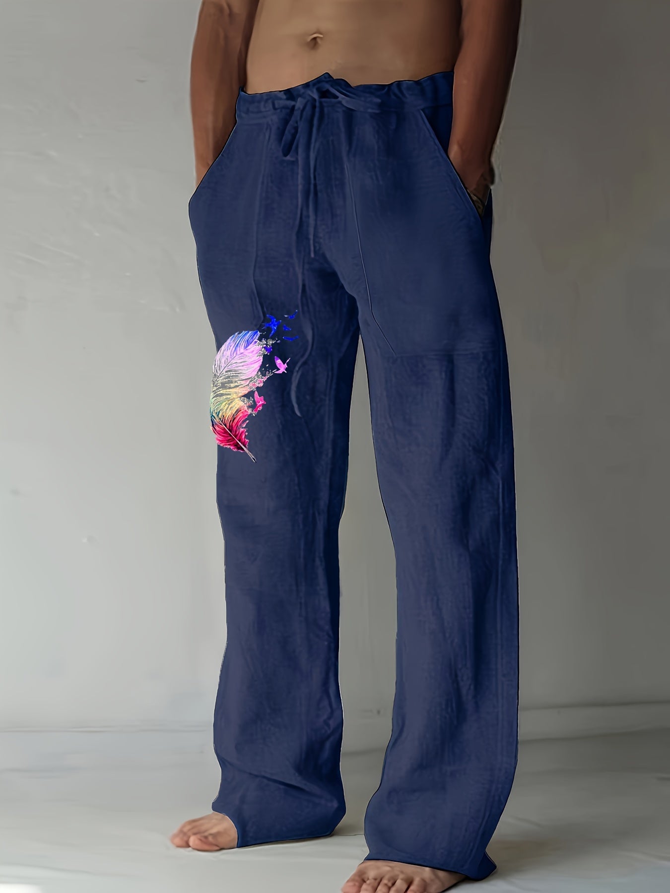 Men's Abstract Feather Print Wide-Leg Pants - Cotton Casual Style