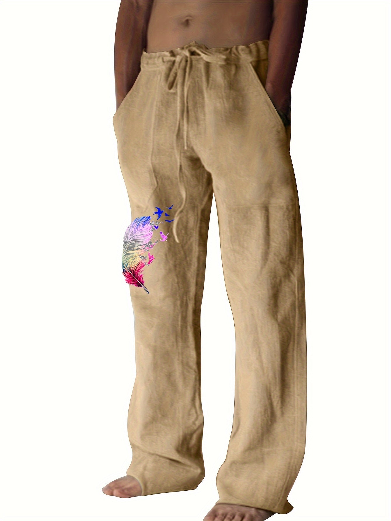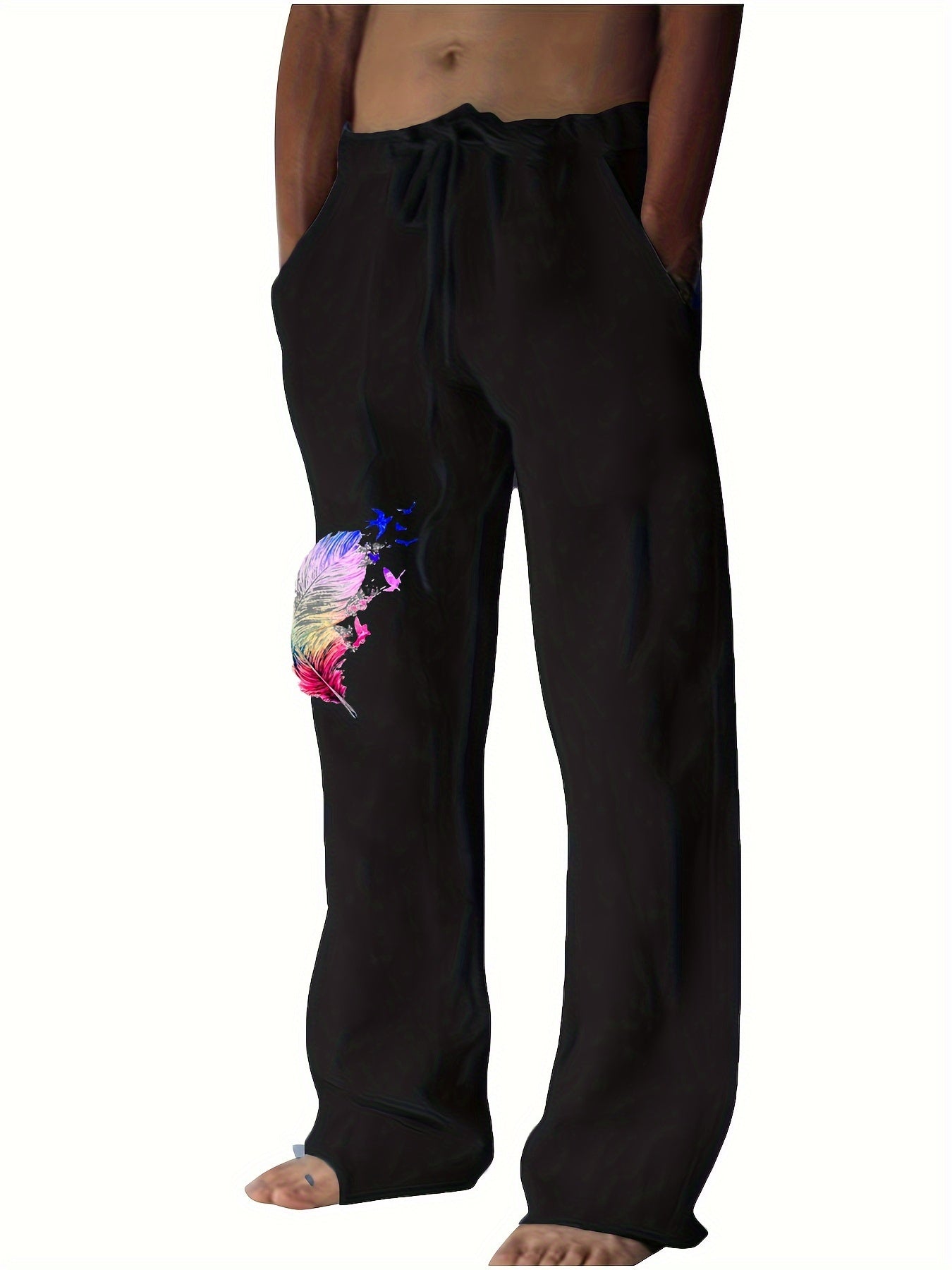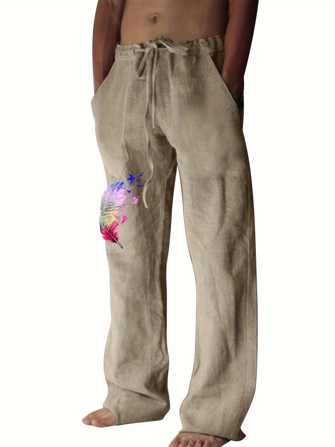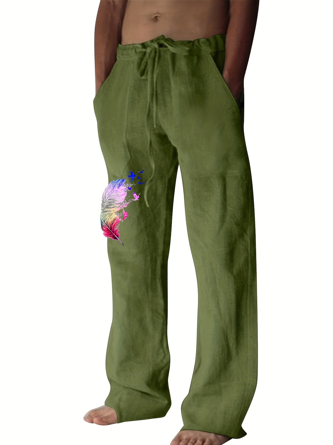 Men's Abstract Feather Print Wide-Leg Pants - Cotton Casual Style