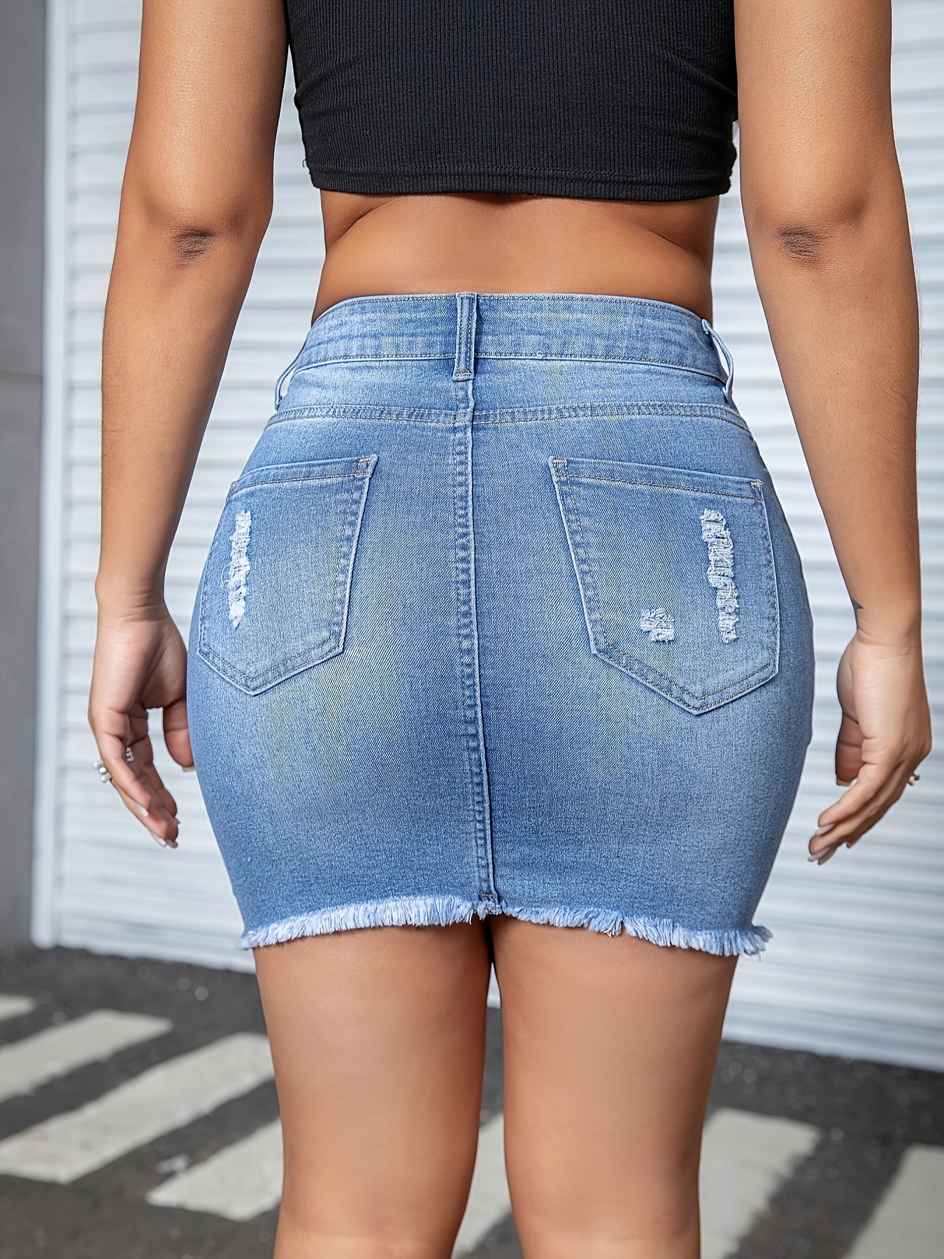 Introducing our Women's High-Waisted Distressed Denim Mini Skirt in Light Blue, a perfect blend of style and comfort. Made from 70% cotton with medium stretch, this skirt is designed for a flattering fit that accentuates your curves while offering versatile wear for various seasons.