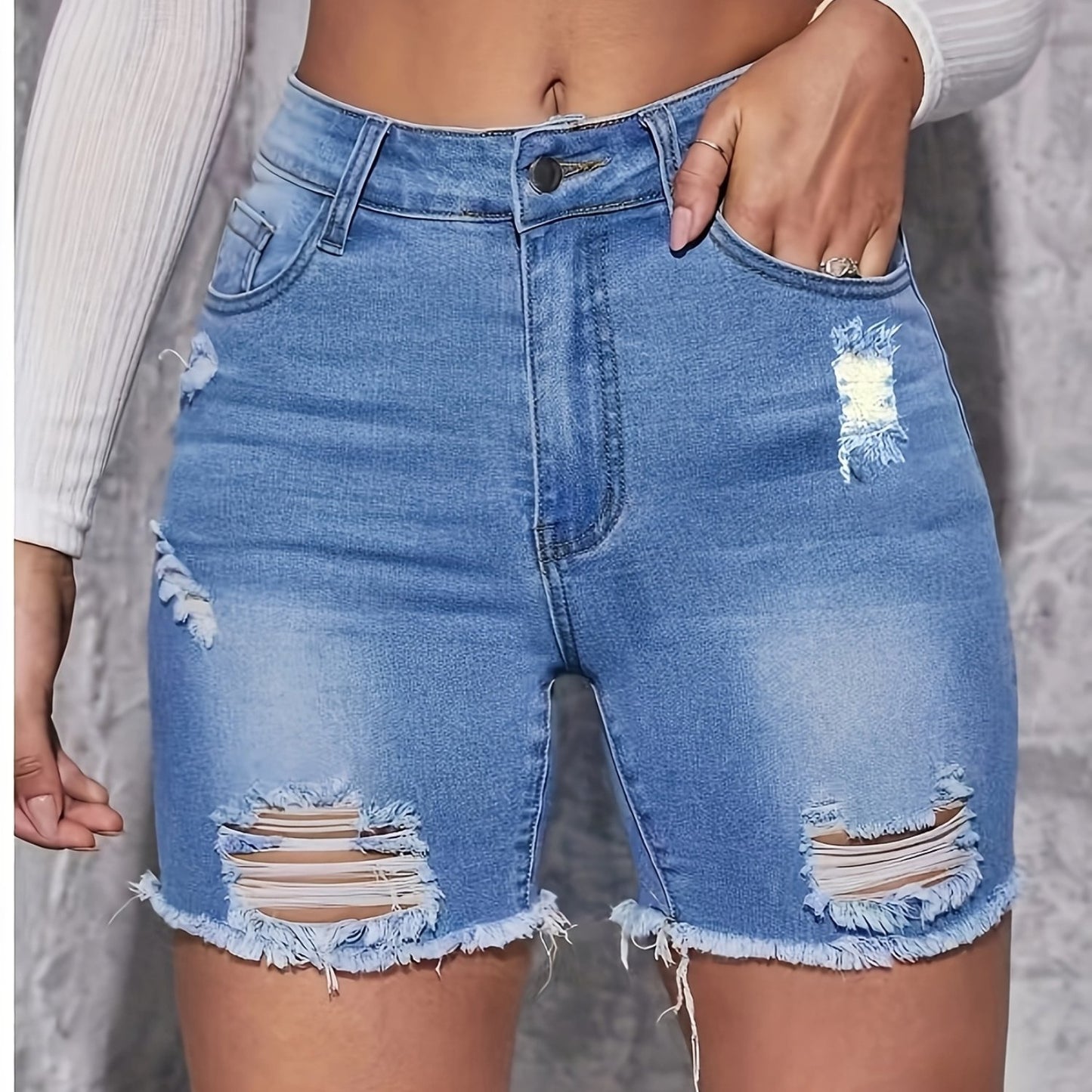 Discover effortless style and comfort with our Women’s High-Waisted Denim Shorts. Crafted from a durable medium stretch polyester blend, these shorts feature a casual solid color design and a trendy raw hem, making them a perfect addition to your summer wardrobe.