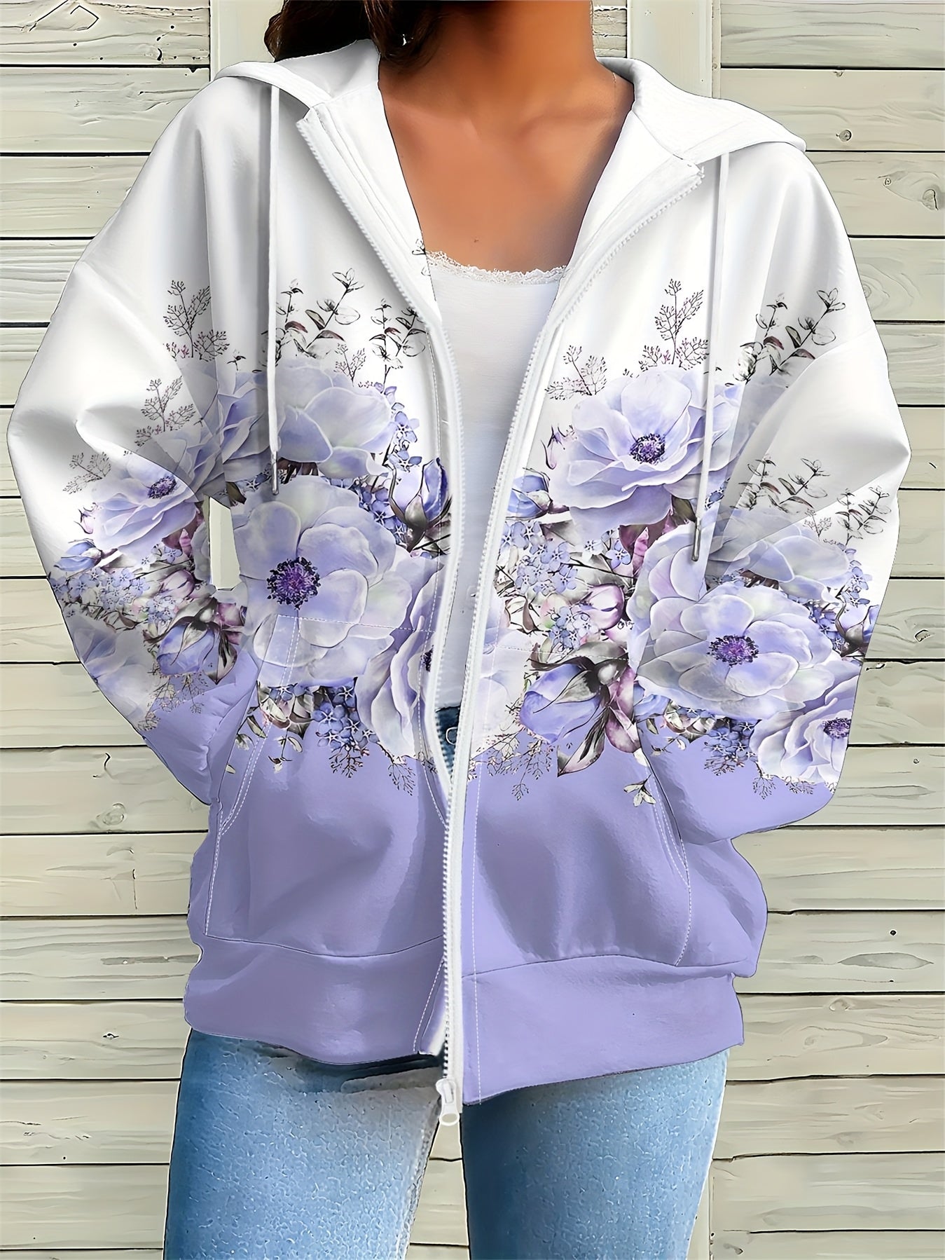 Women's Floral Print Hooded Zip-Up Jacket - Lightweight & Casual