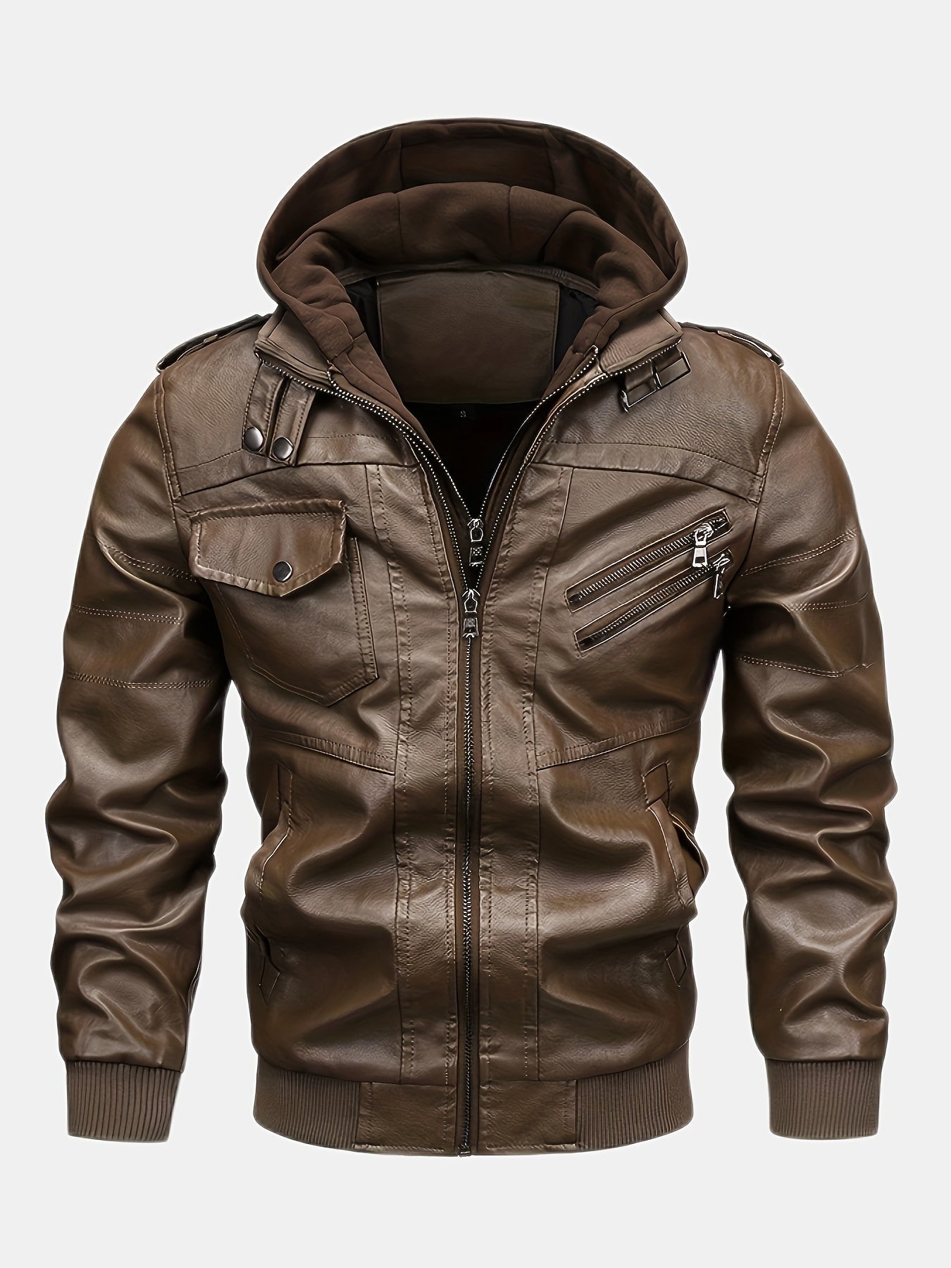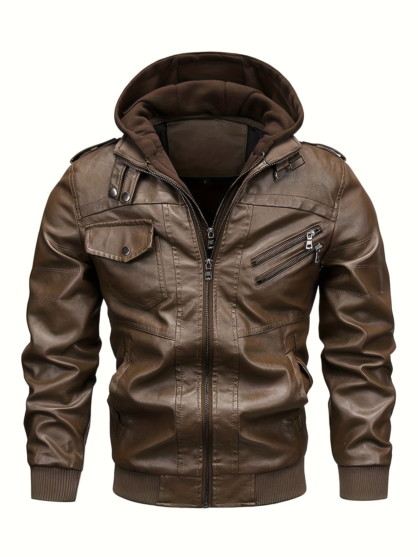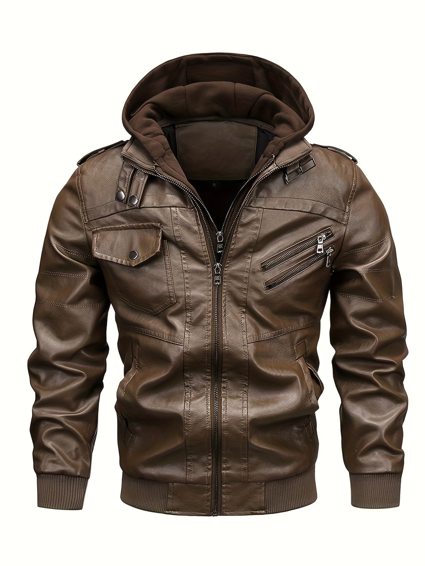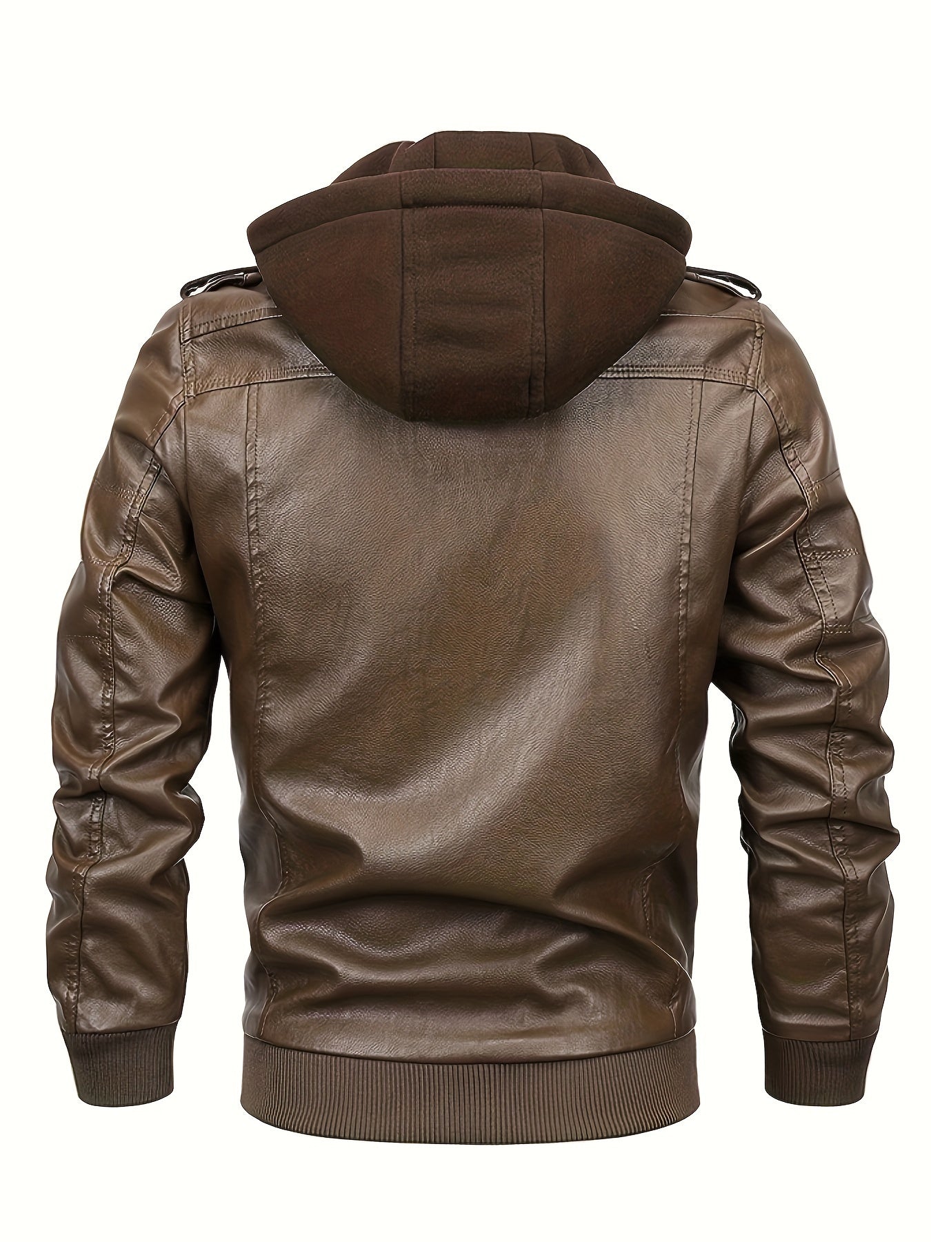 Men's Hooded Motorcycle Faux Leather Jacket - Casual, Zip-Up, Brown