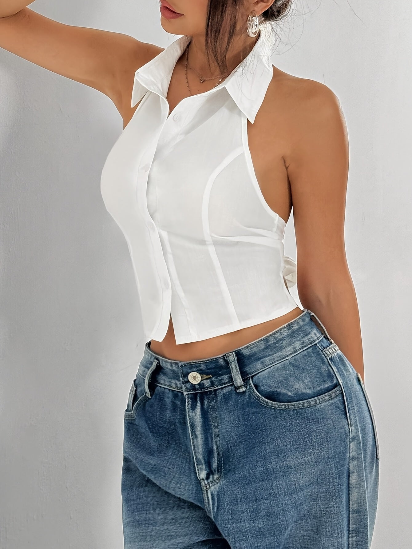 Elevate your wardrobe with the Women's Ice-Blue Butterfly Collar Blouse, designed for elegance and comfort. Made from 100% high-quality polyester, this sleeveless blouse features a stunning lapel collar, making it perfect for casual outings or nights out during the spring and summer seasons.