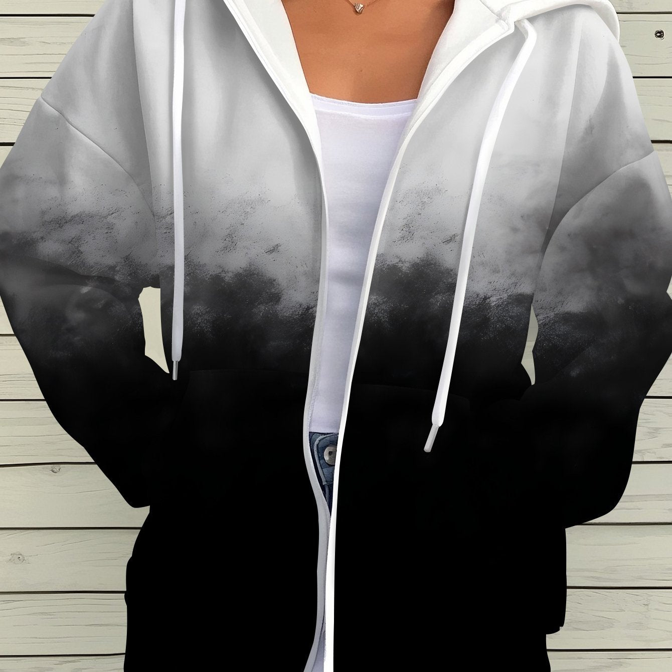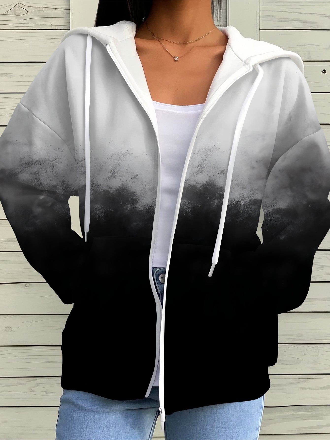 Women's Black White Gradient Zipper Hoodie - Chic Casual Outerwear