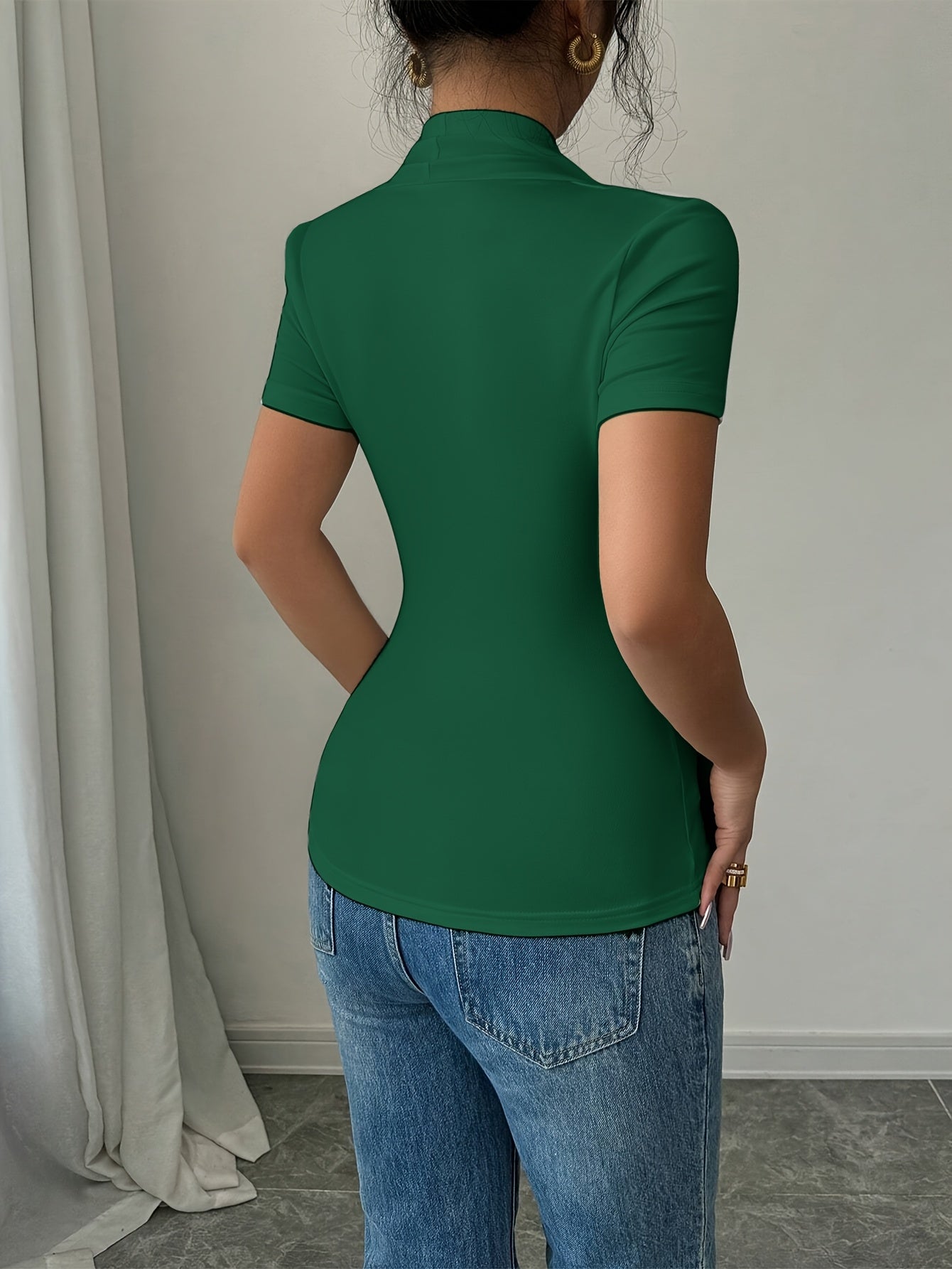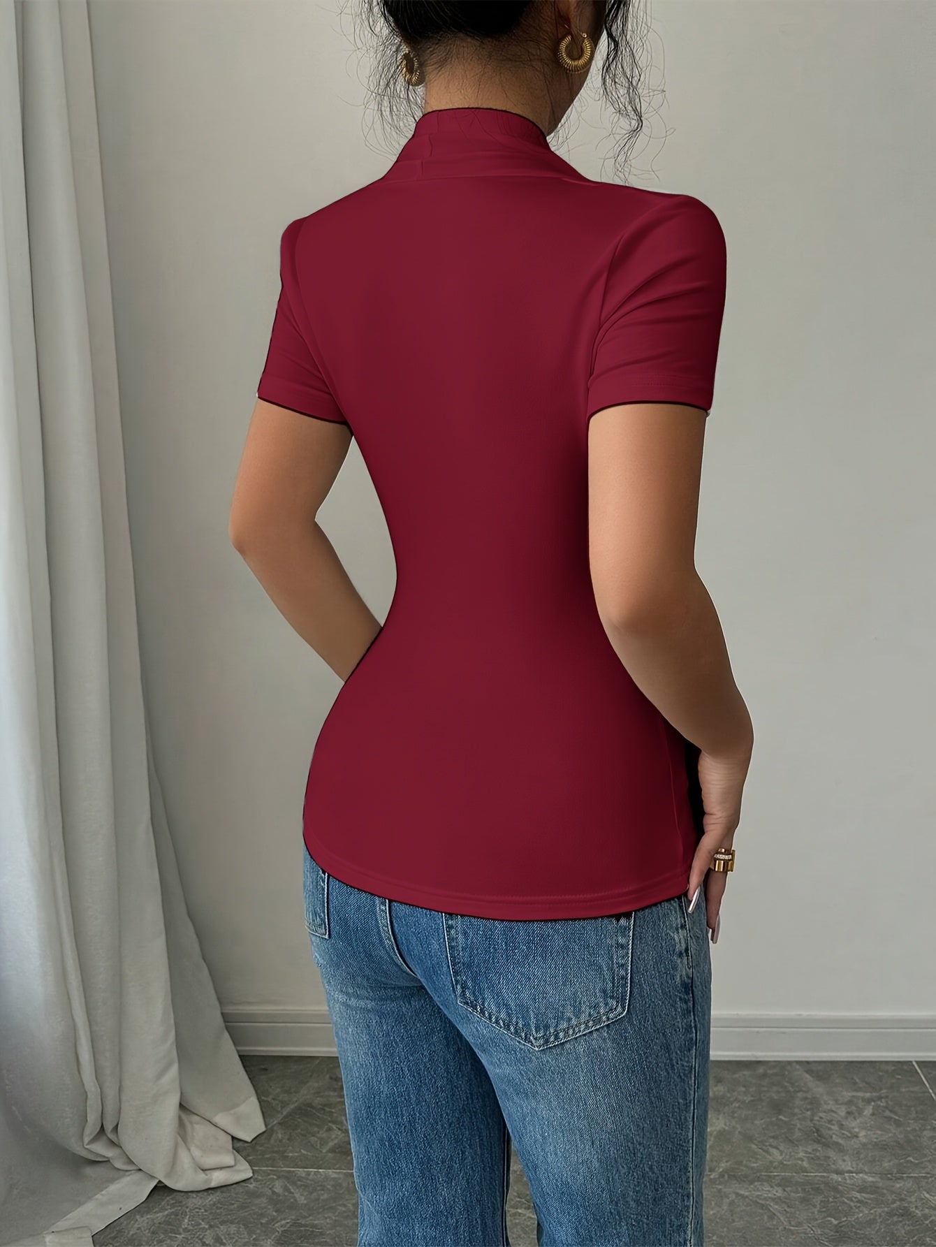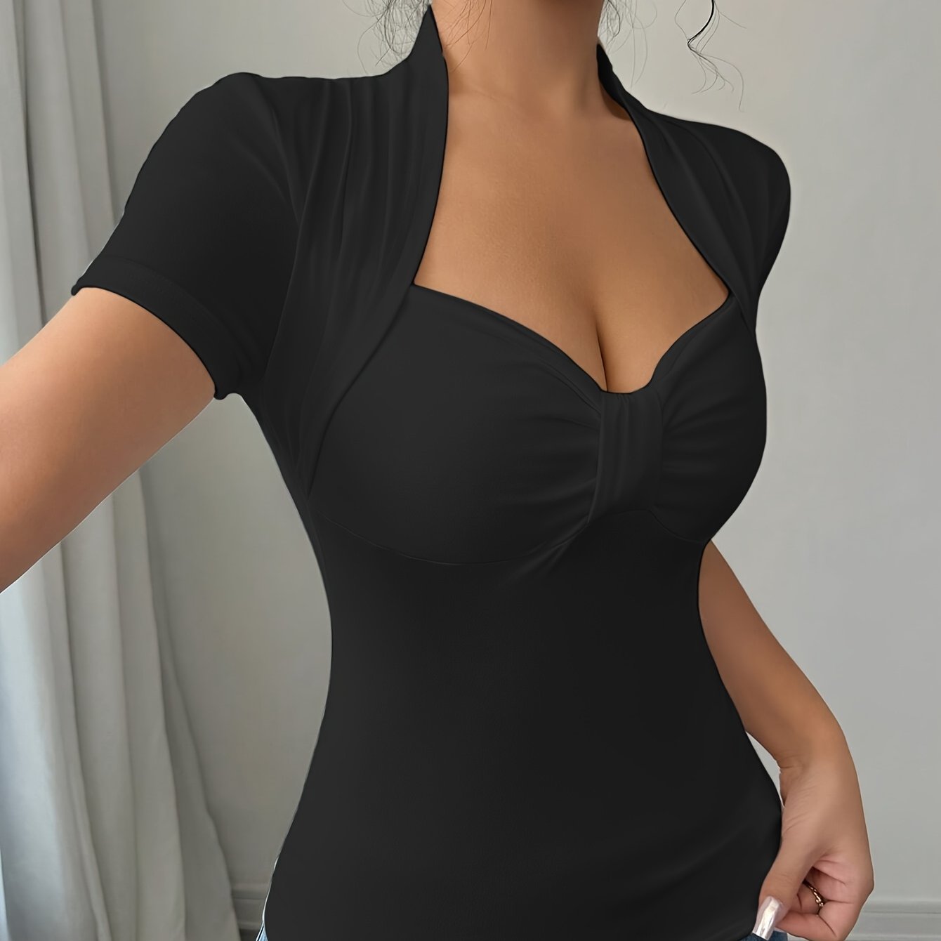 Elevate your casual wardrobe with our Women's Elegant V-Neck T-Shirt, designed for all seasons. This short-sleeve top features beautiful ruched detailing, ensuring both comfort and style. Crafted from high-quality 95% polyester, it promises a perfect fit with high elasticity.