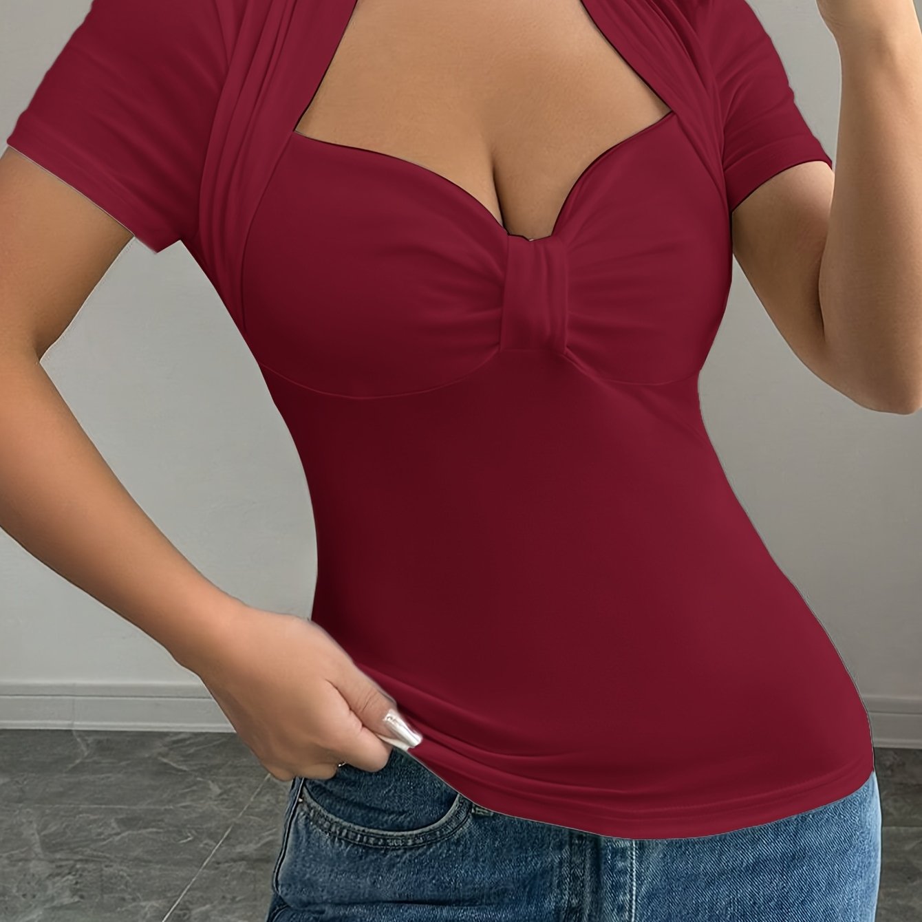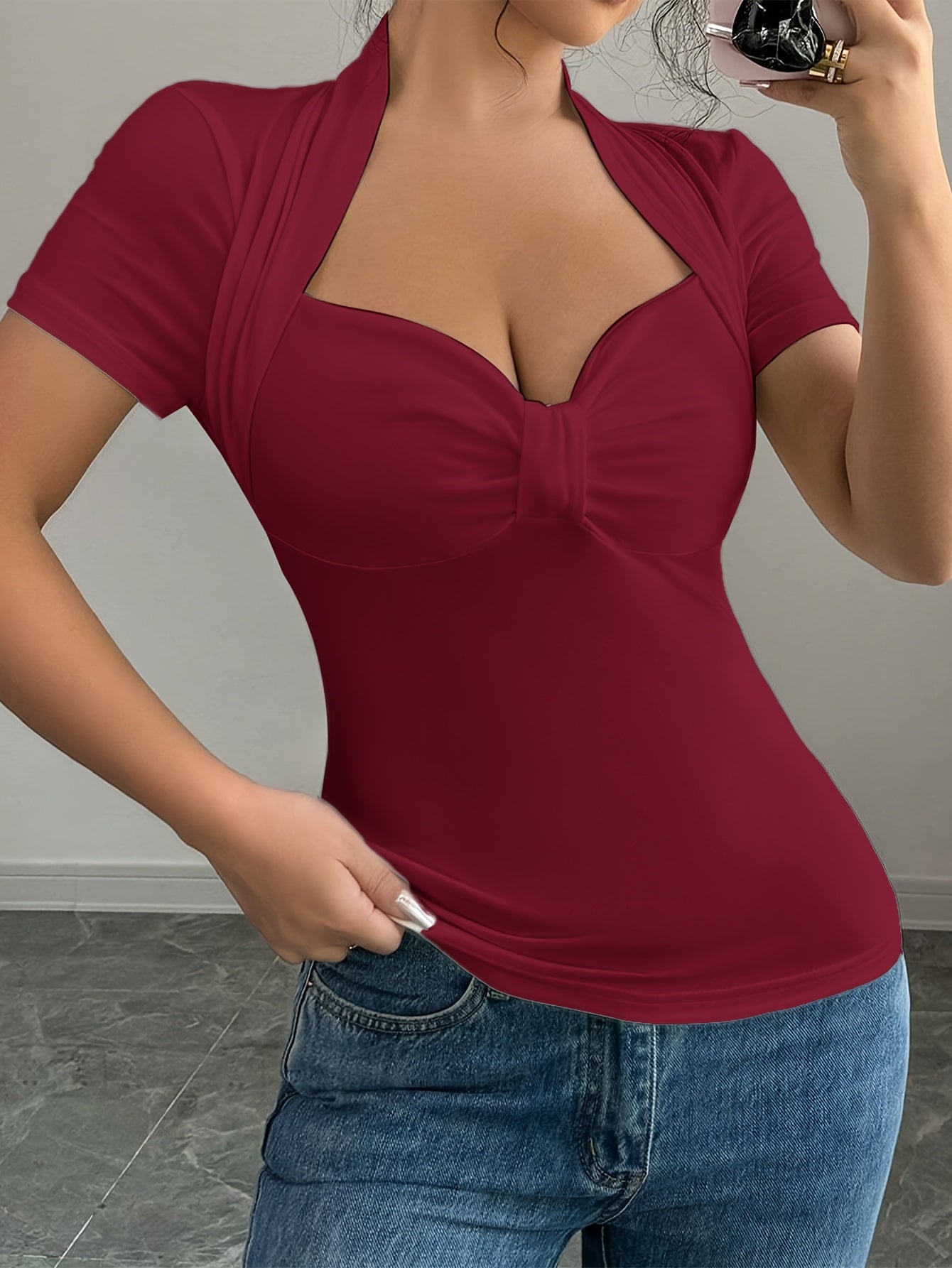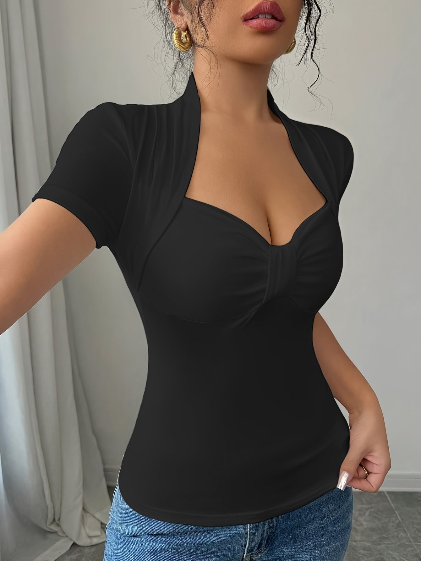 Women's Elegant V-Neck T-Shirt - Short Sleeve, Ruched Detail Top