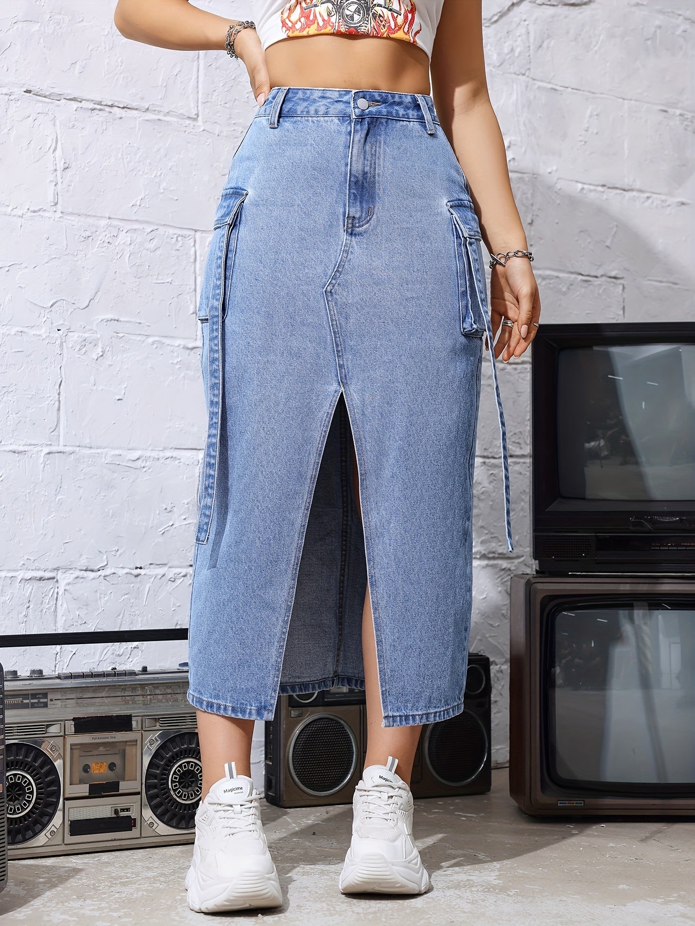 Women's Light Washed Blue Maxi Denim Skirt - Cargo Side Flap Style