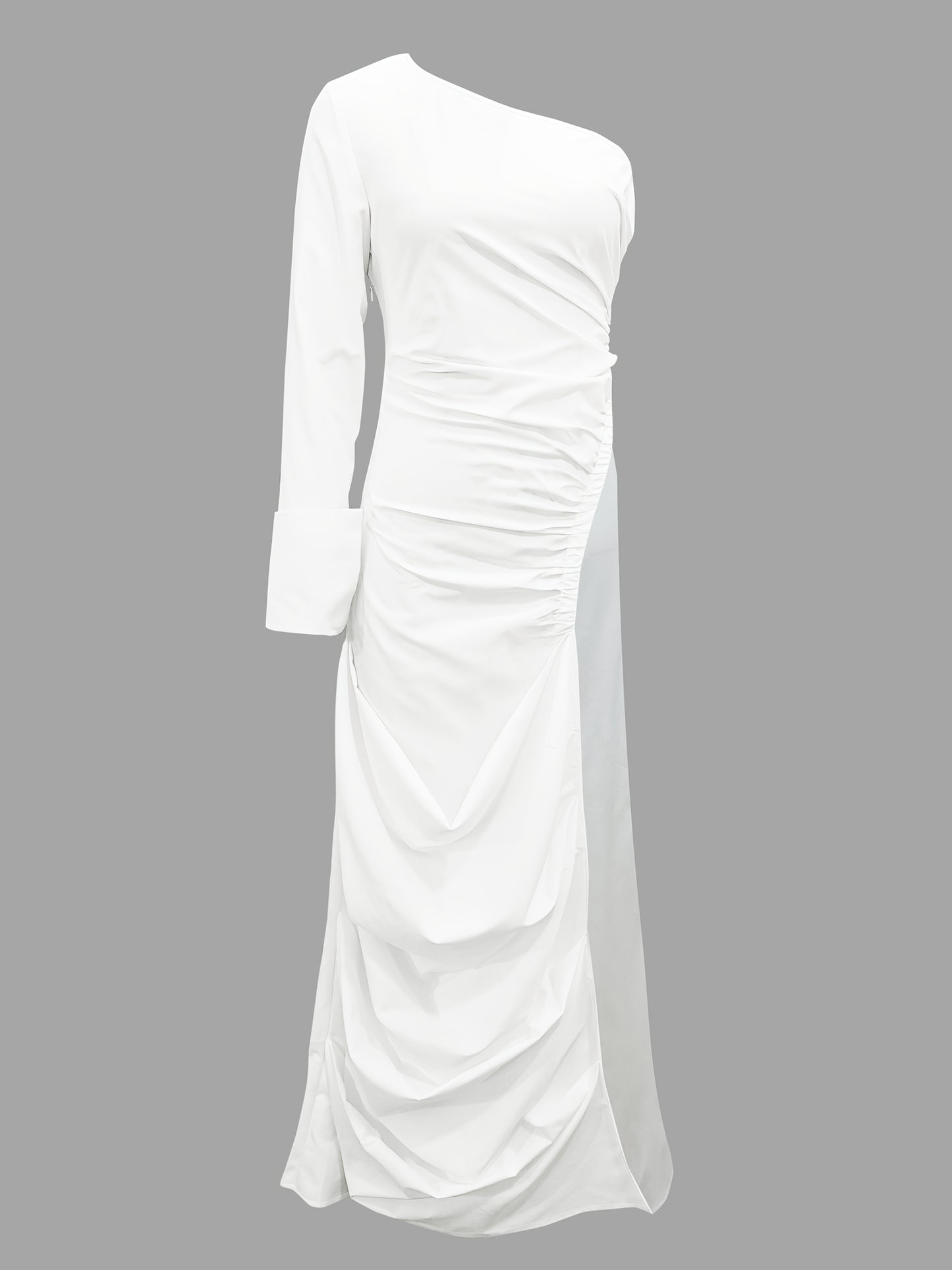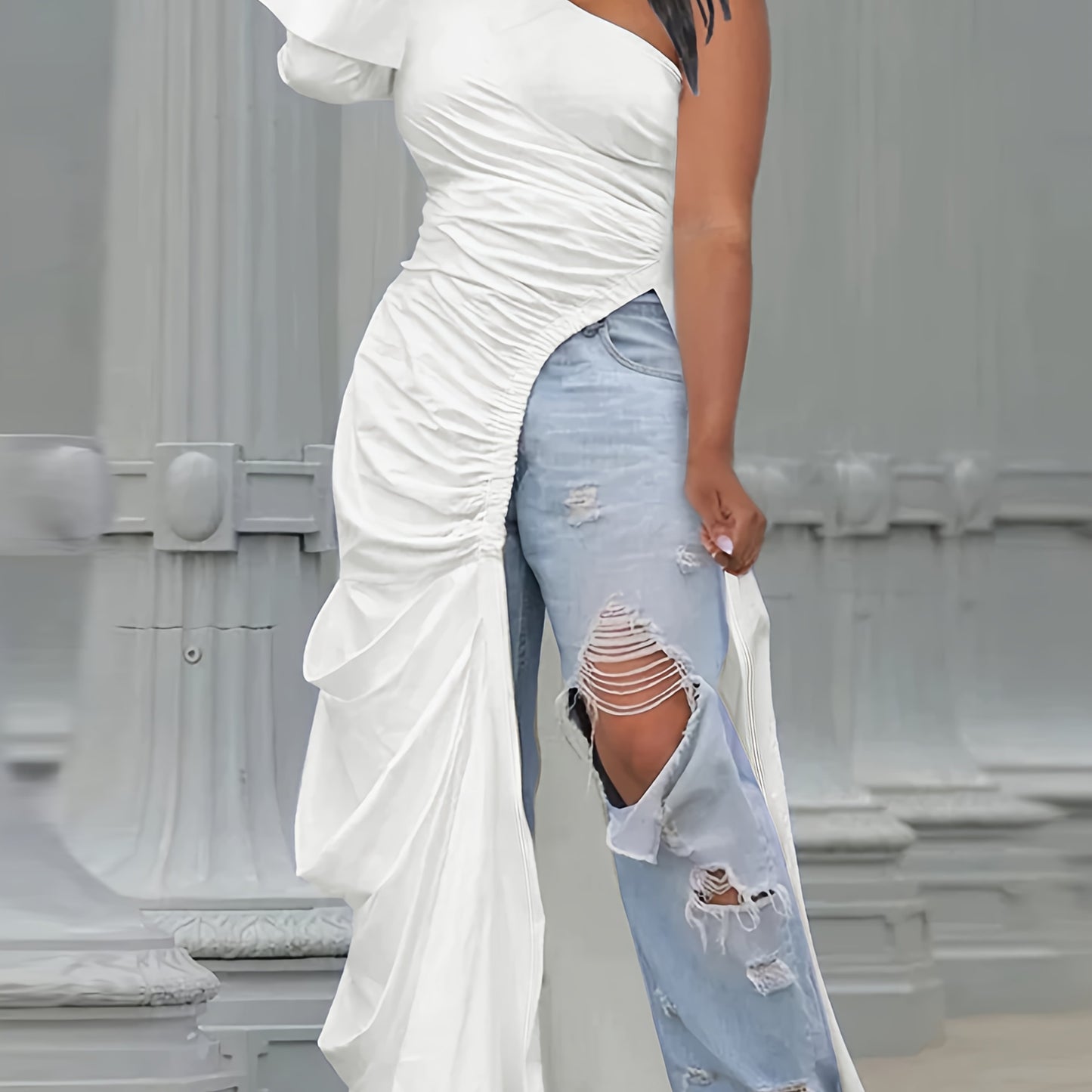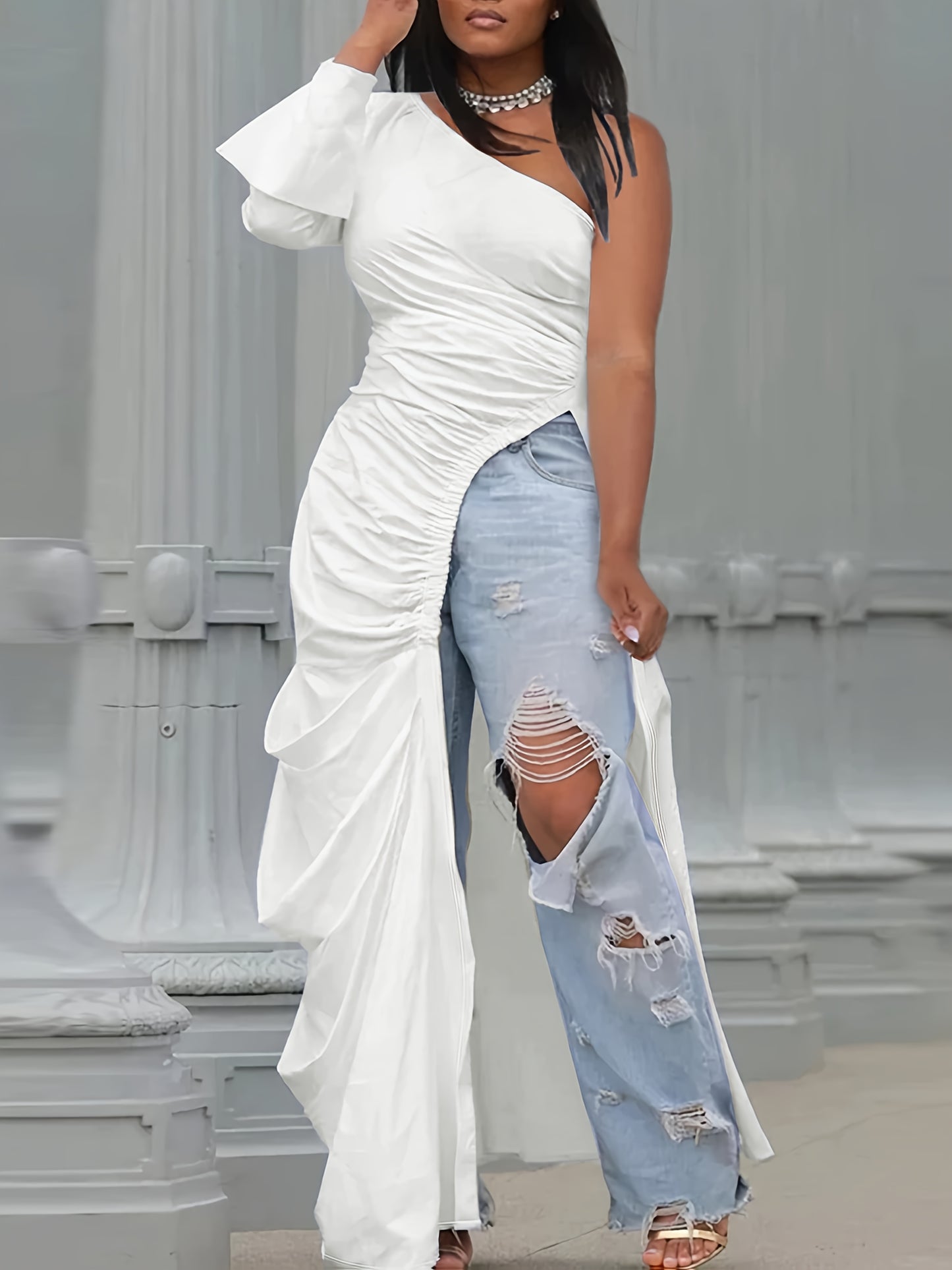 Introducing the Women's Chic Off-Shoulder Top, a stylish addition to your wardrobe that features an asymmetrical hem and beautiful ruffle details. Made from 100% polyester, this long-length top is perfect for casual outings in every season, combining comfort and elegance effortlessly.