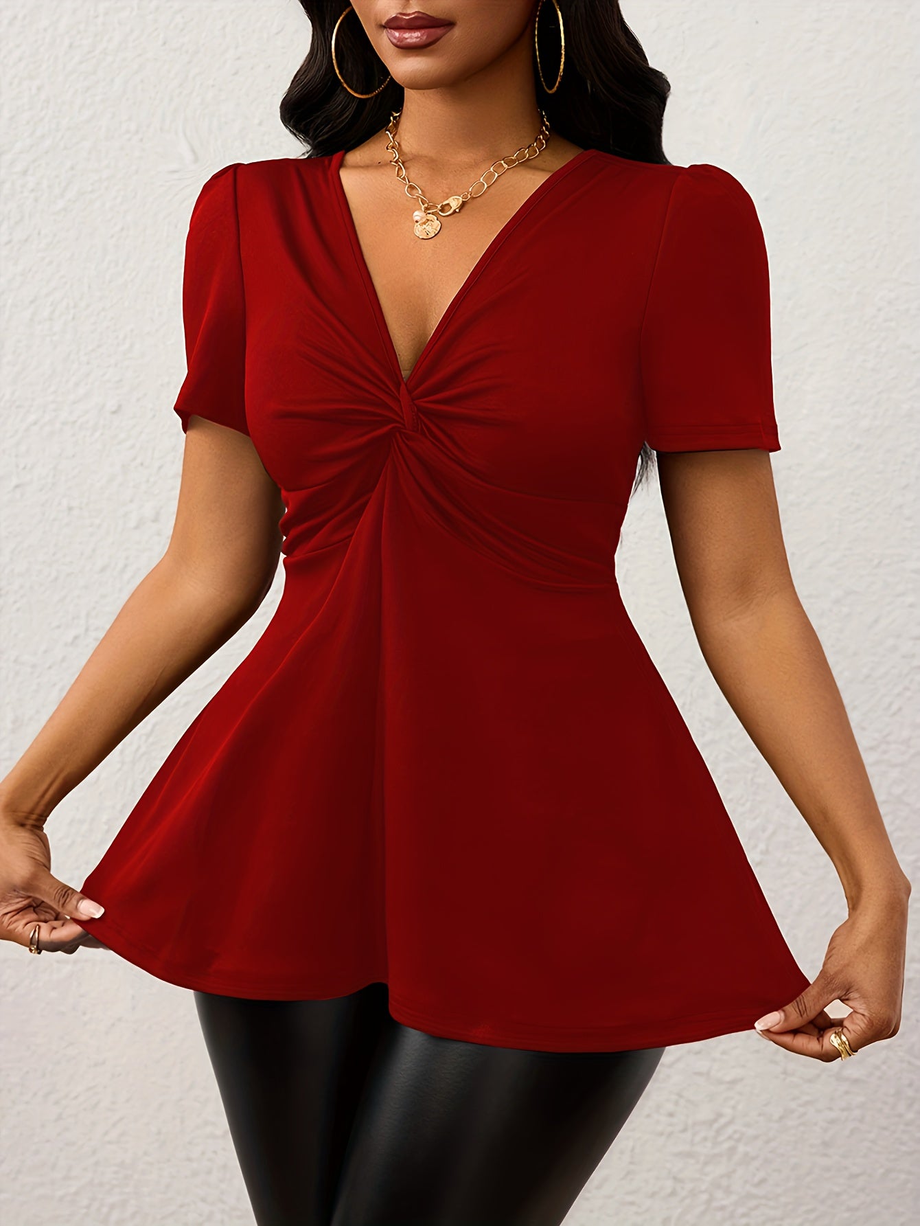 Elegant V-Neck Short Sleeve Blouse - Knot Detail Summer Top