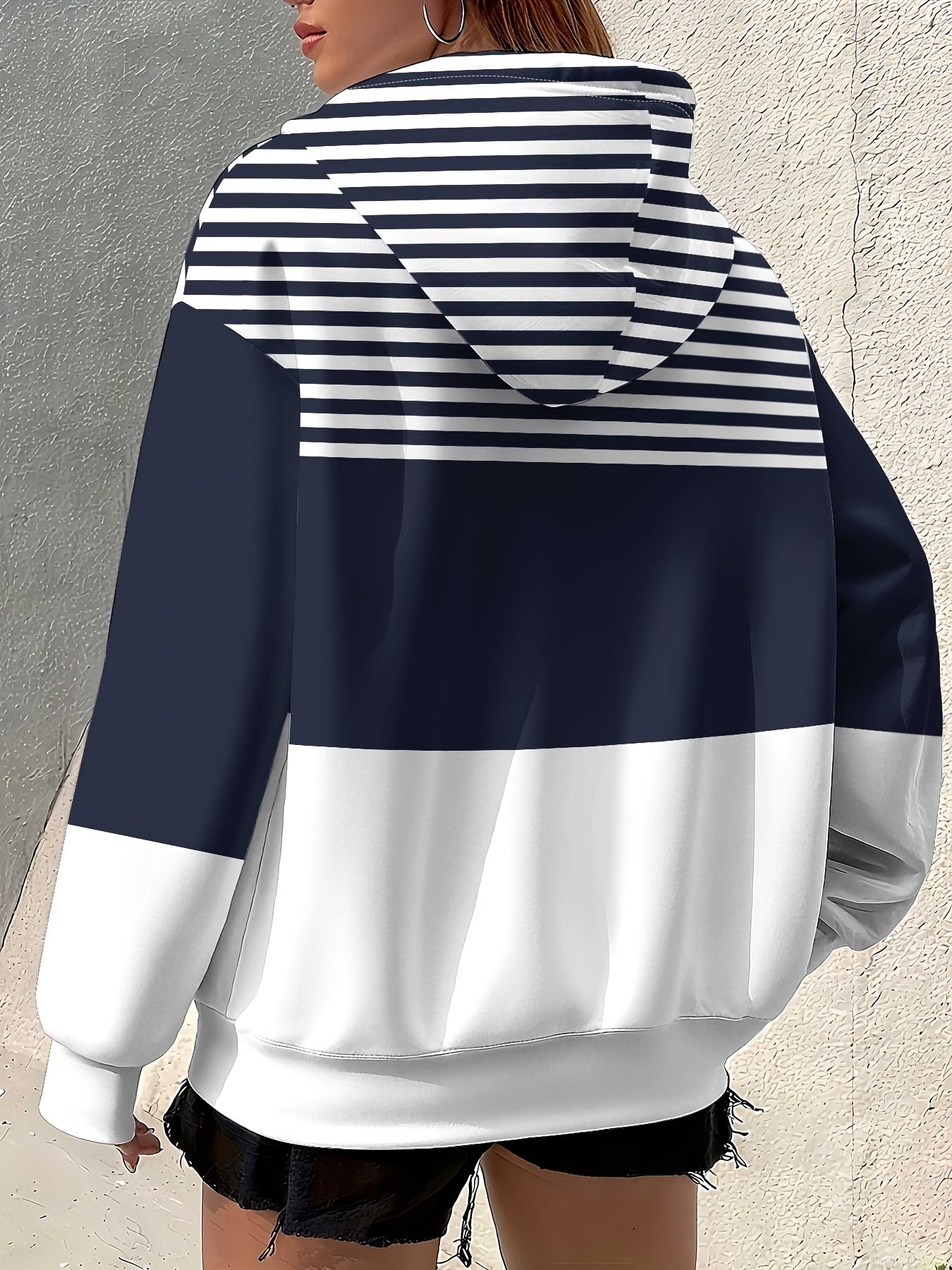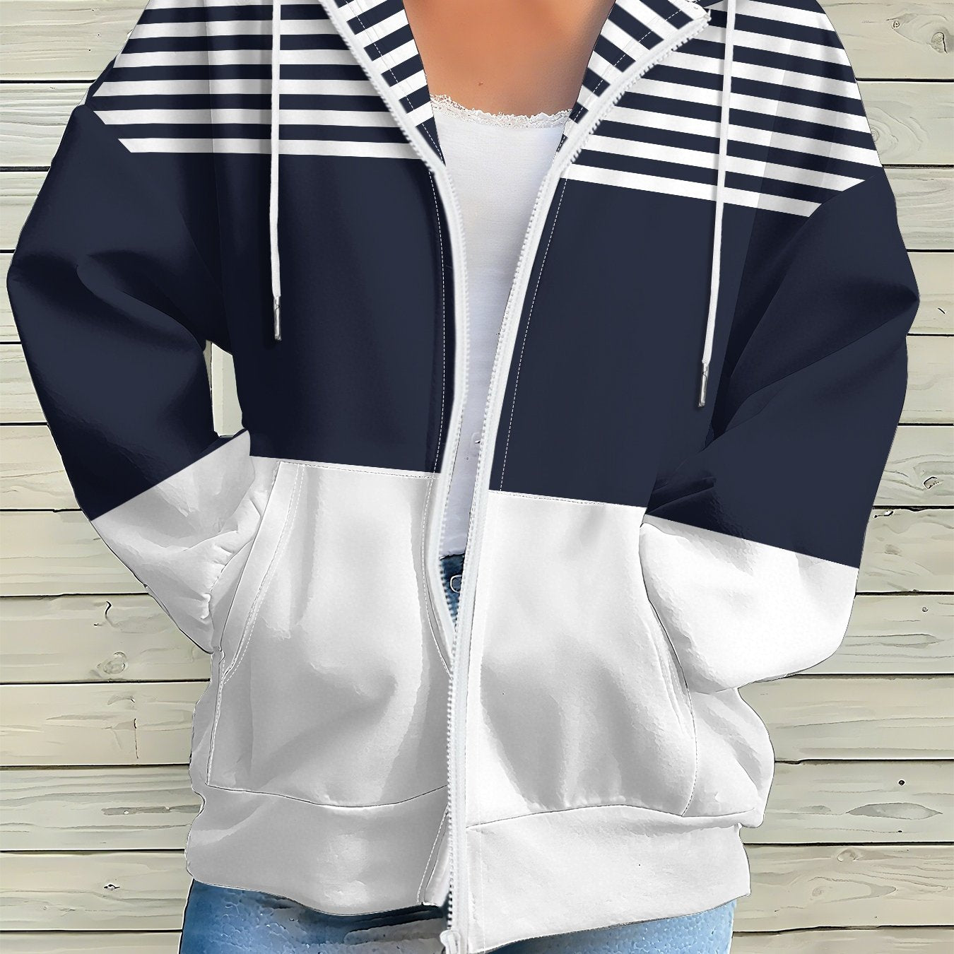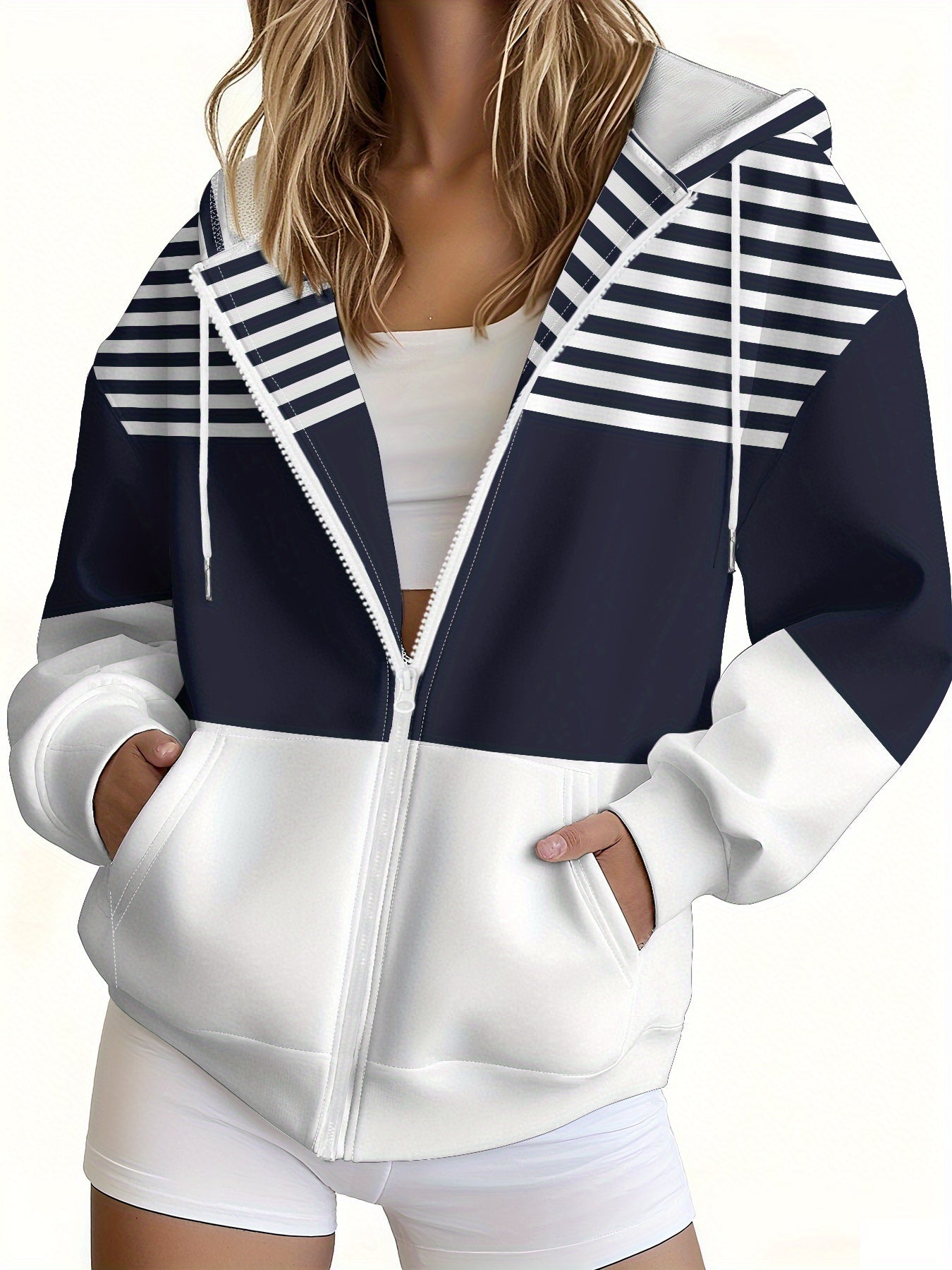 Women's Navy & White Zip-Up Hoodie - Casual Long Sleeve Outerwear