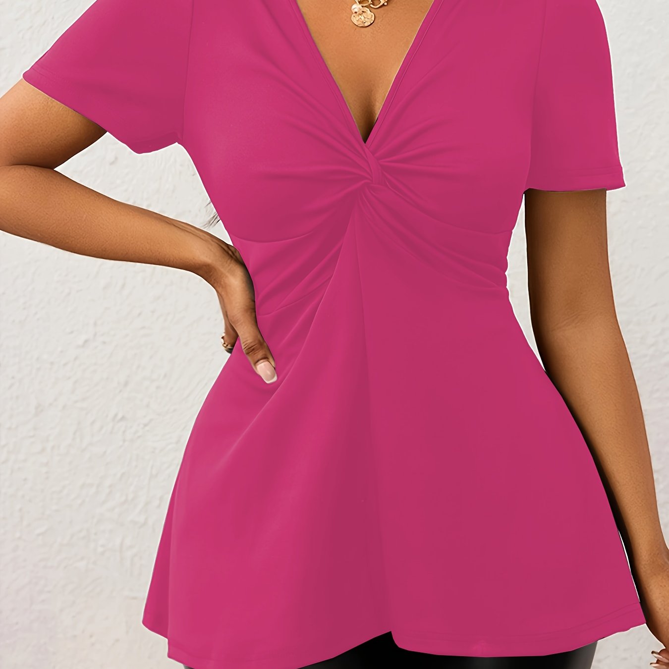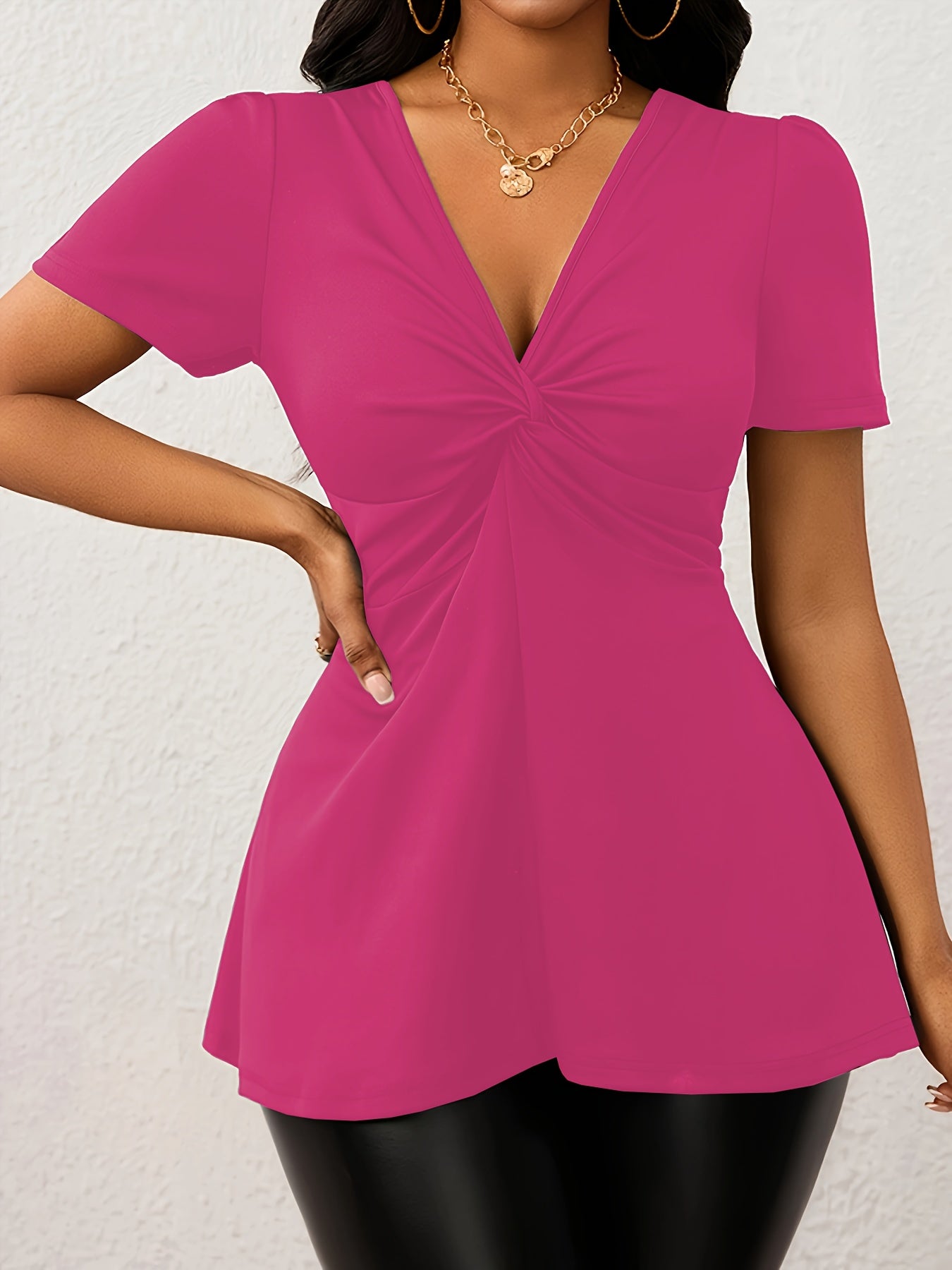 Elevate your style with the Elegant Women's V-Neck Twist-Front T-Shirt, designed to provide effortless sophistication for any occasion. Its sleek design ensures you stand out whether at work or leisure, while the high-quality fabric offers the comfort you crave. Add this essential piece to your wardrobe today and experience fashion without sacrifice.