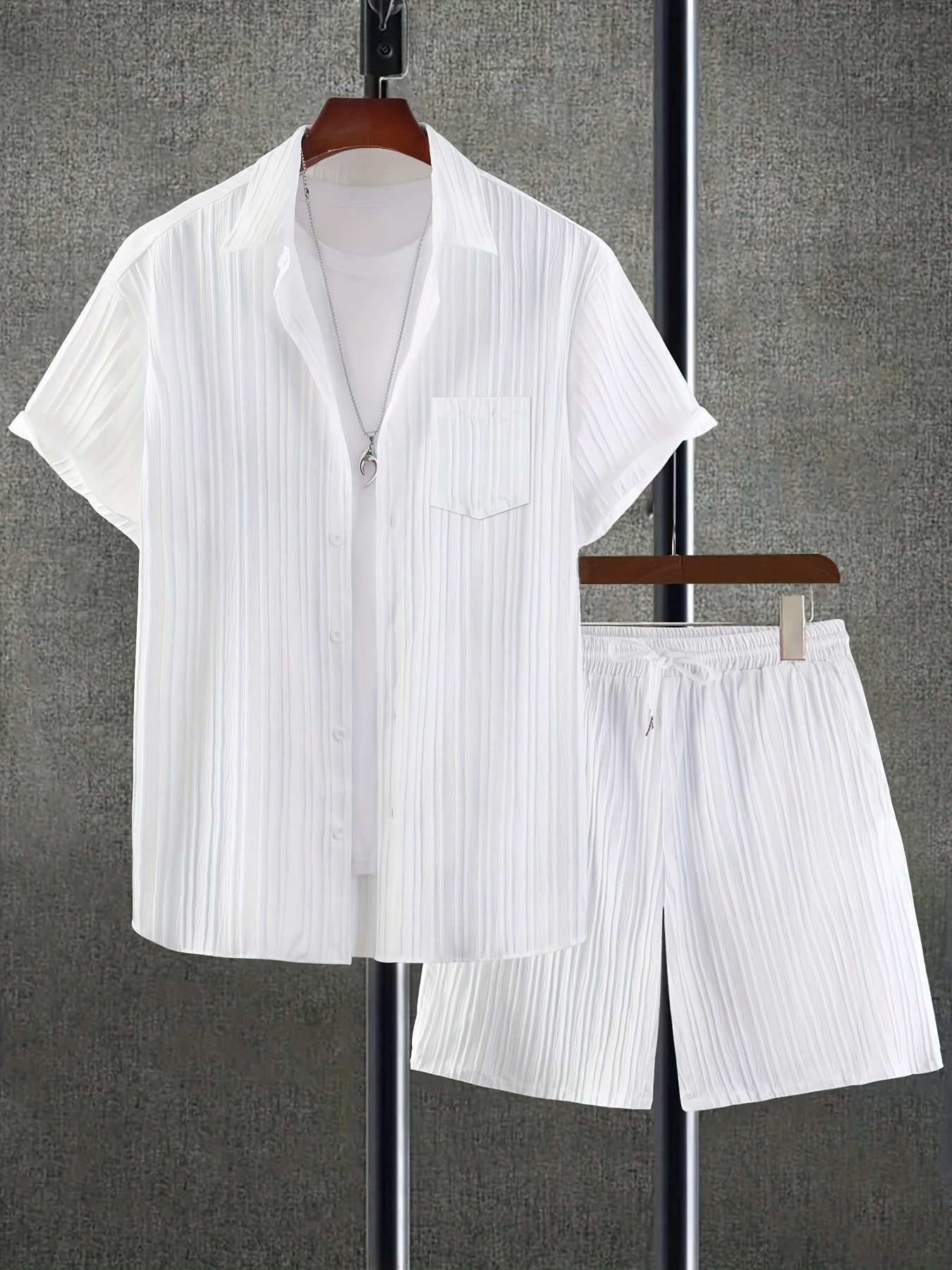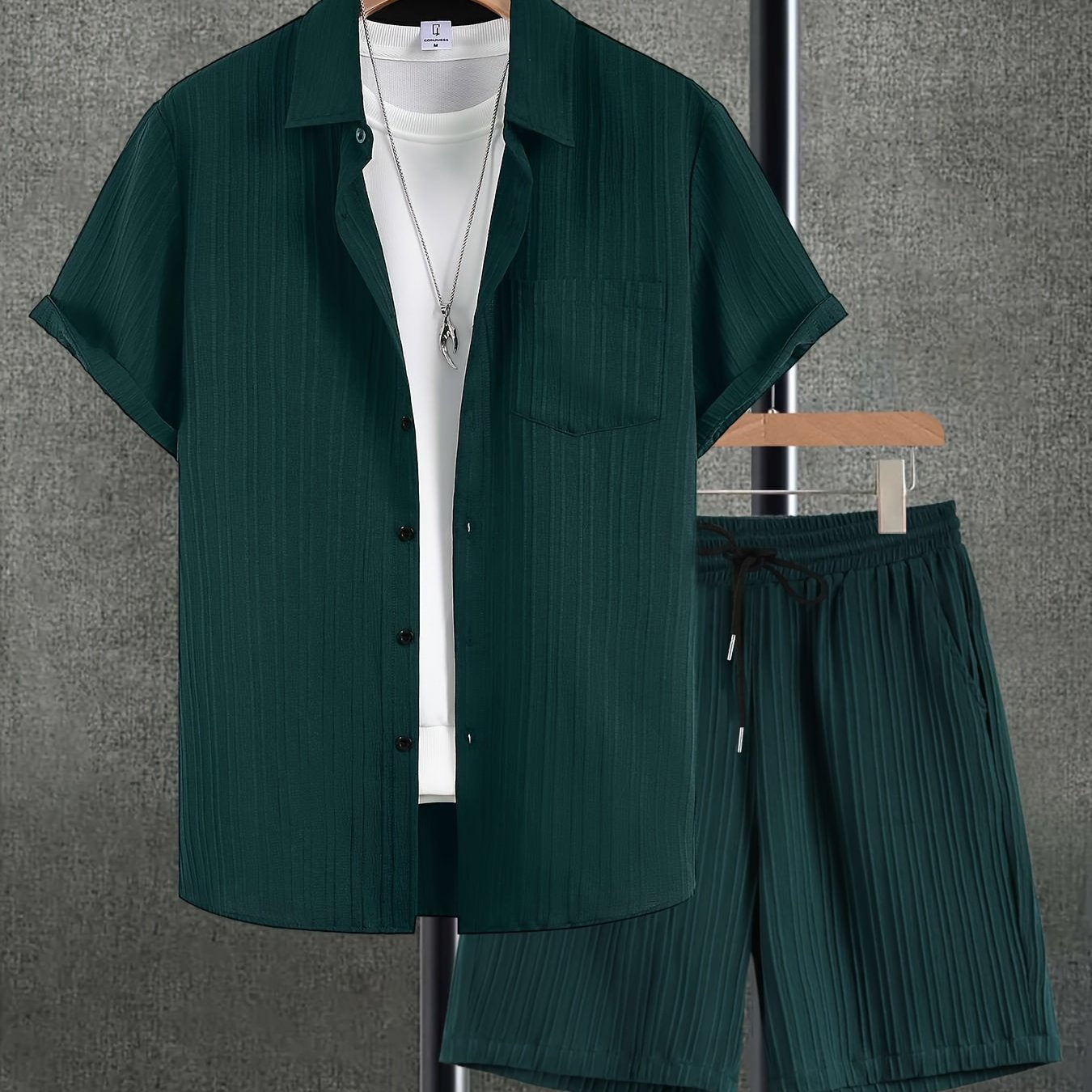 The CONJUESS Men's Solid Color Short Sleeve Shirt & Drawstring Pants Set is the ultimate choice for the modern man. With its versatile design, you can effortlessly transition from day to night while staying stylish. Perfect for summer outings, it's a must-have addition to any wardrobe that values comfort and elegance.