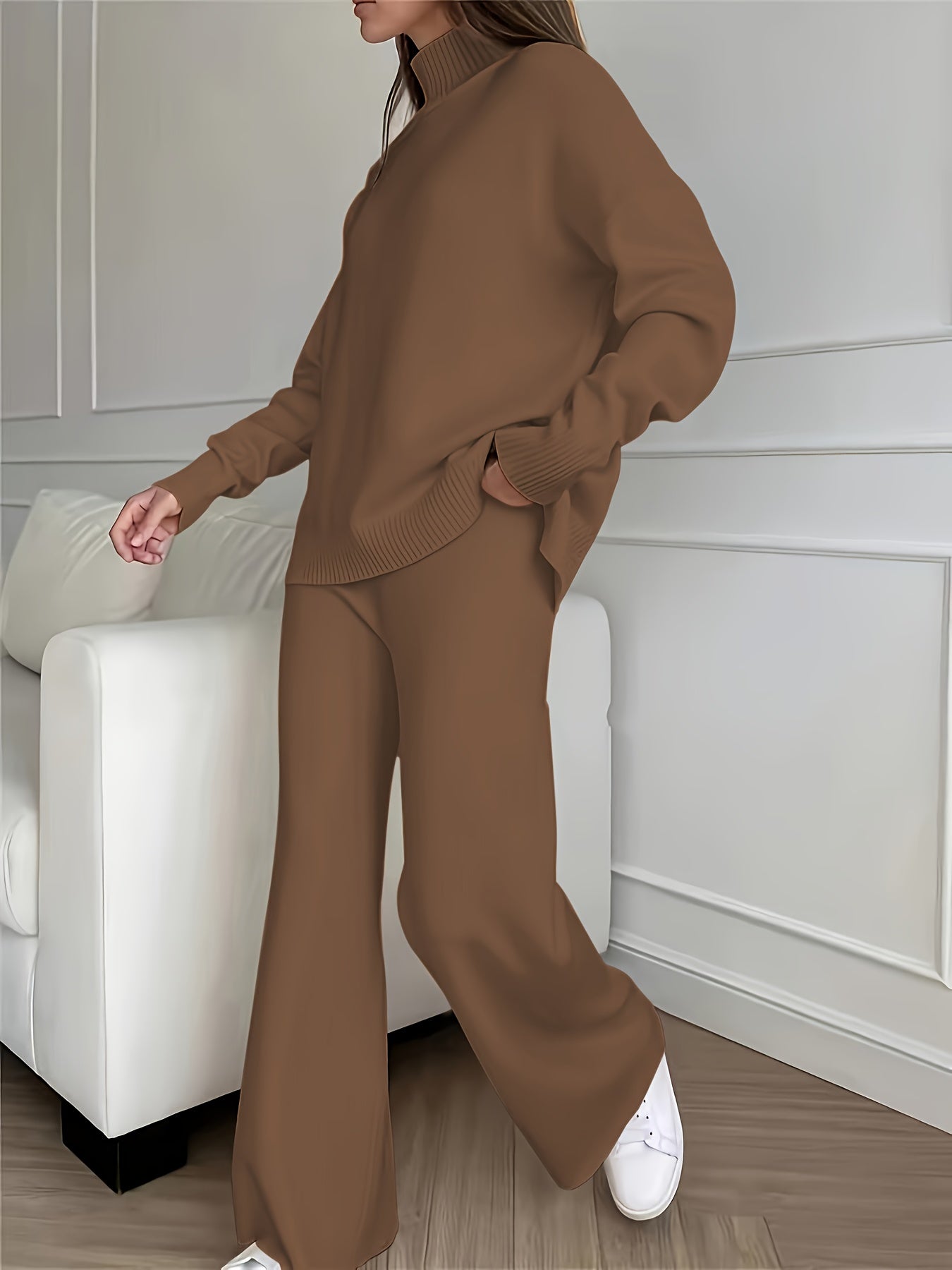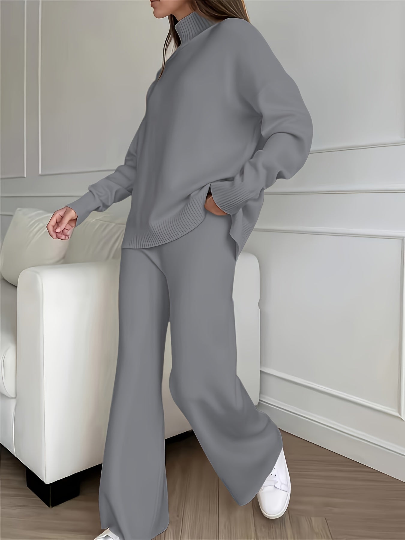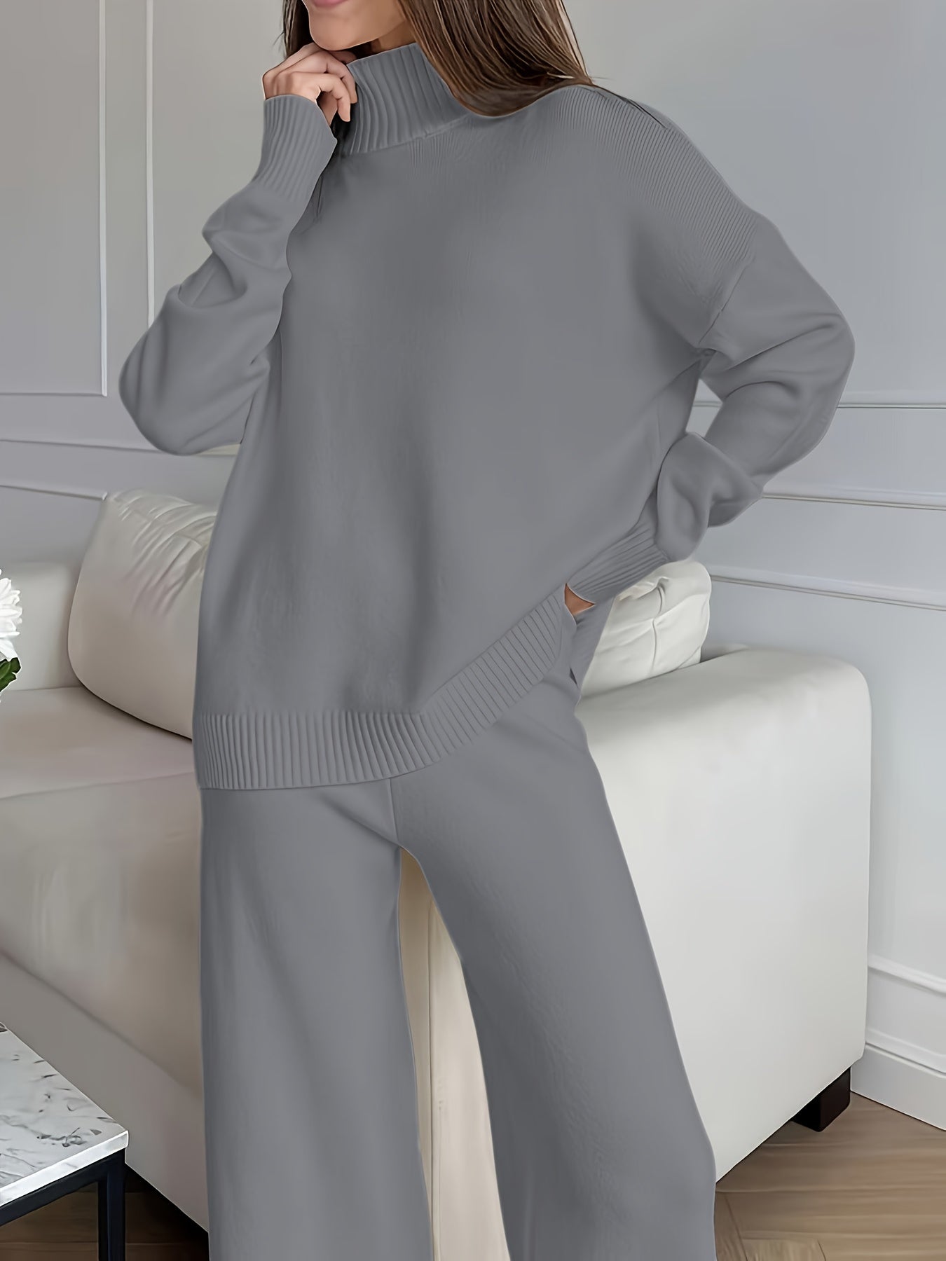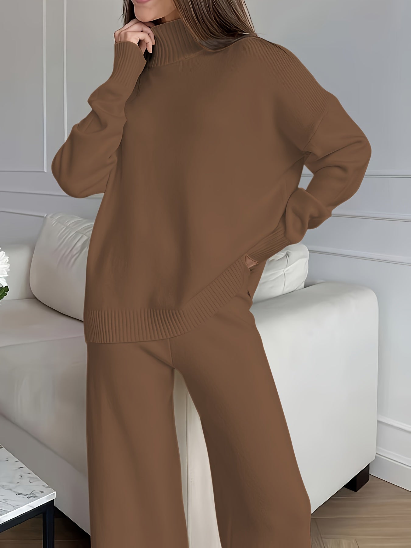 Women's Winter Sweatsuit Set - Cozy Beige Turtleneck & Wide-Leg Pants