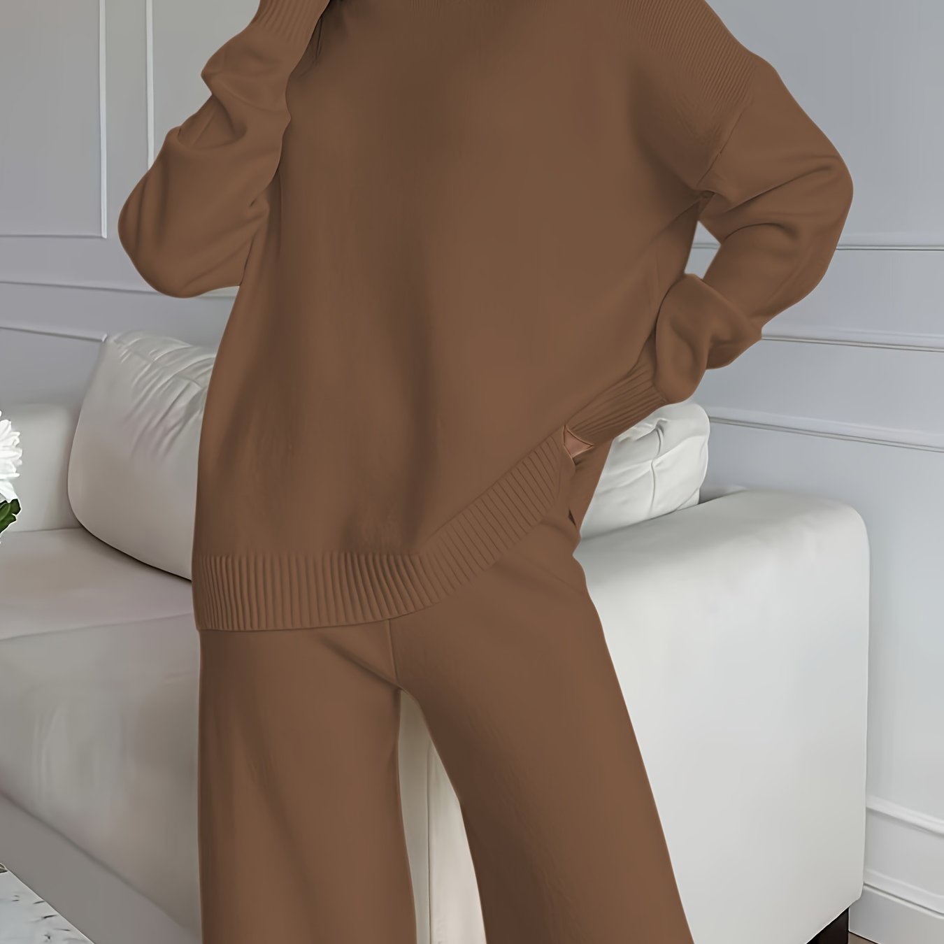 Introducing our Women's Winter Sweatsuit Set, designed for ultimate comfort and style. This cozy beige ensemble features a high-neck turtleneck and wide-leg pants, perfect for casual outings or relaxing at home. Made with a blend of 50% viscose, this set offers a soft touch against your skin while ensuring warmth during the colder months.