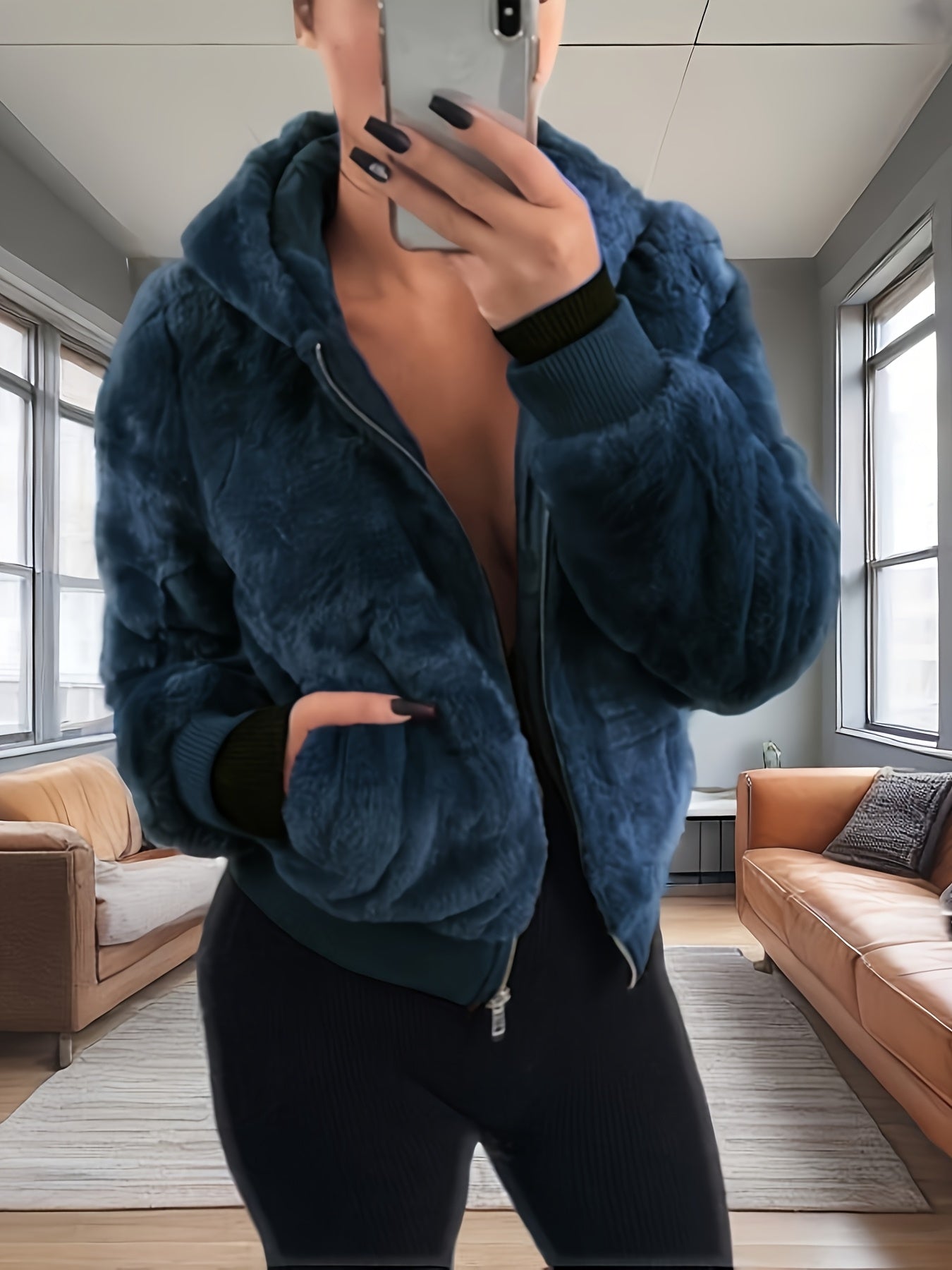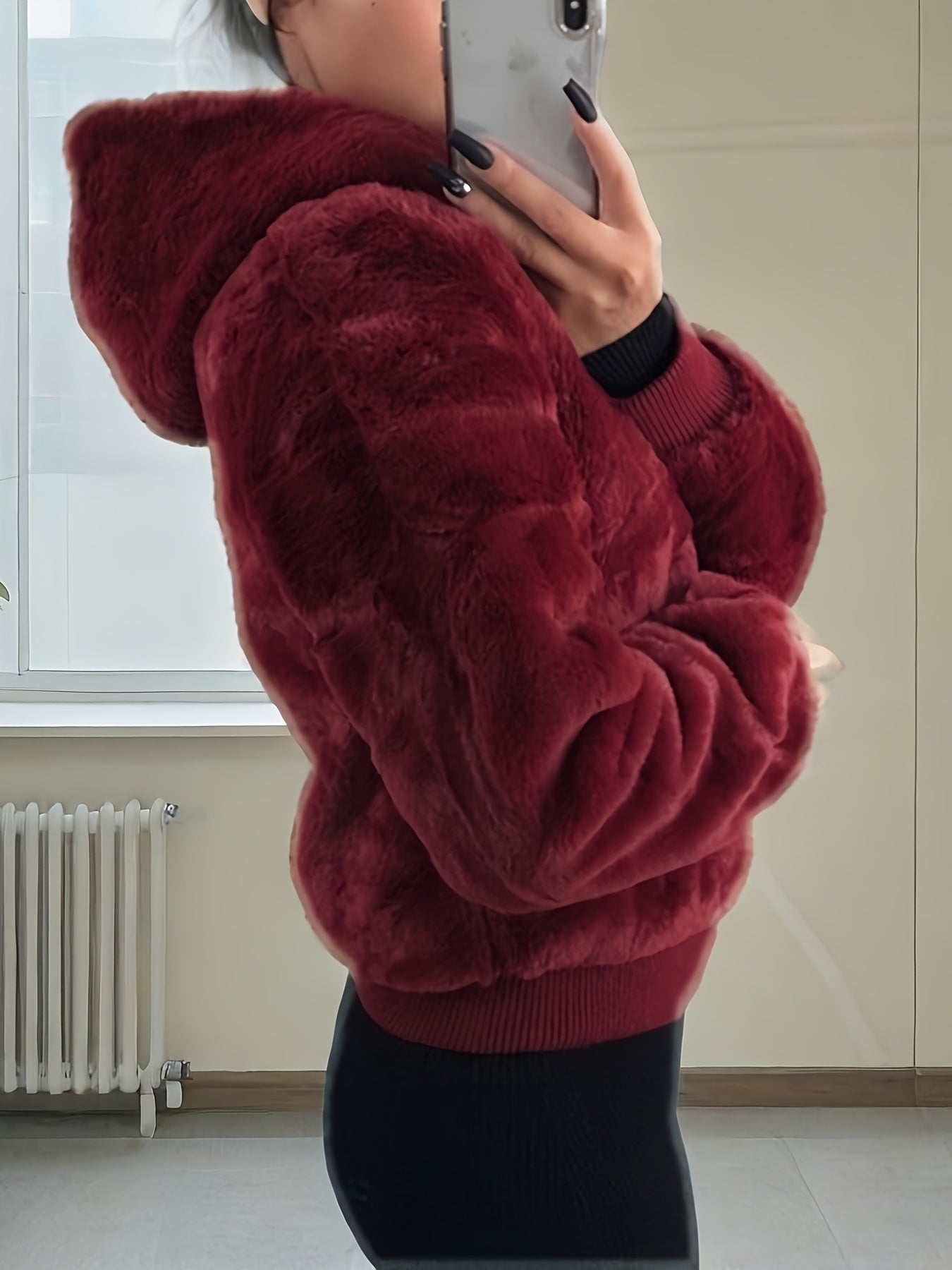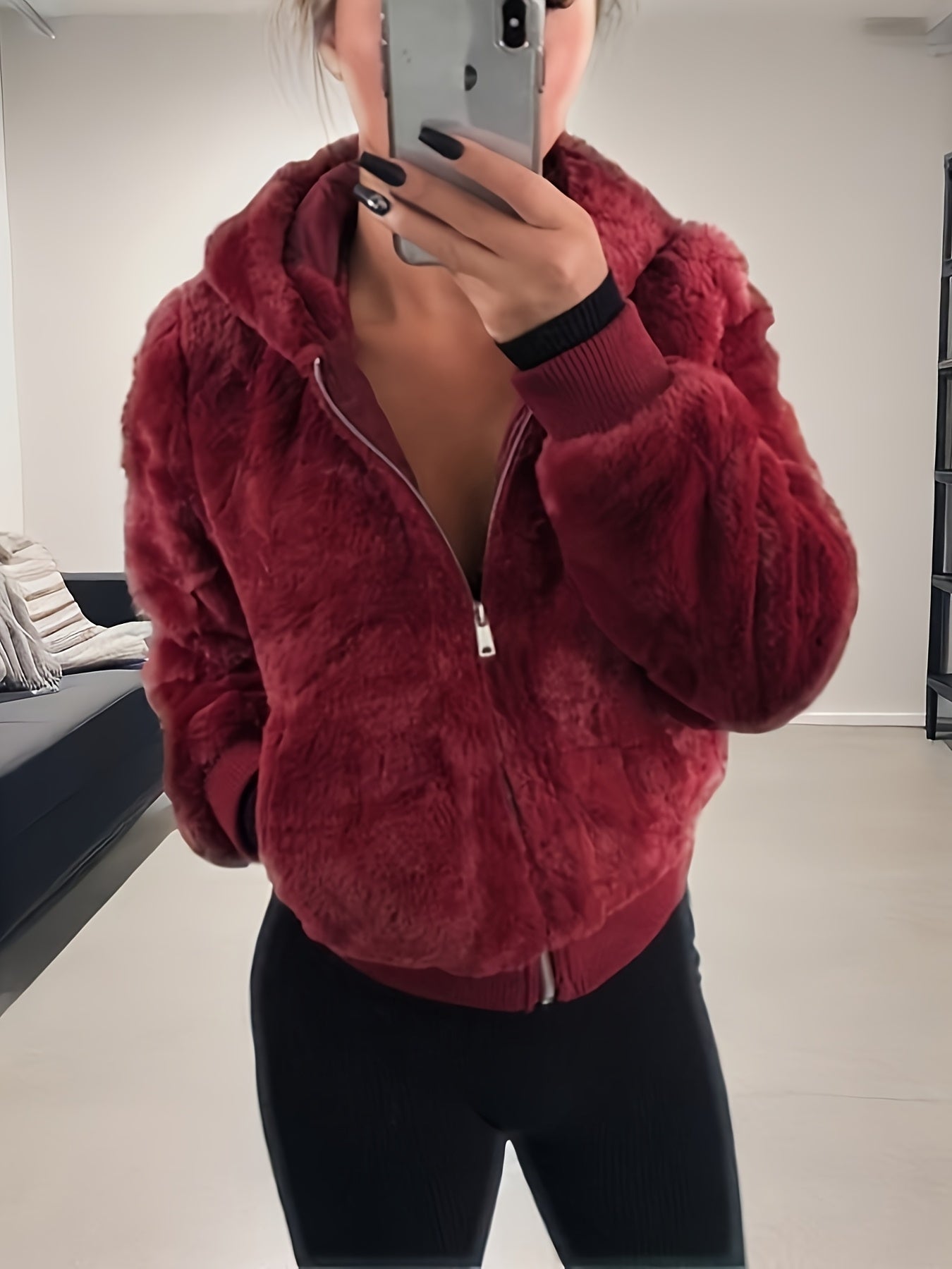 Women's Elegant Hooded Coat - Plush Texture, Zipper Closure, Chic Style