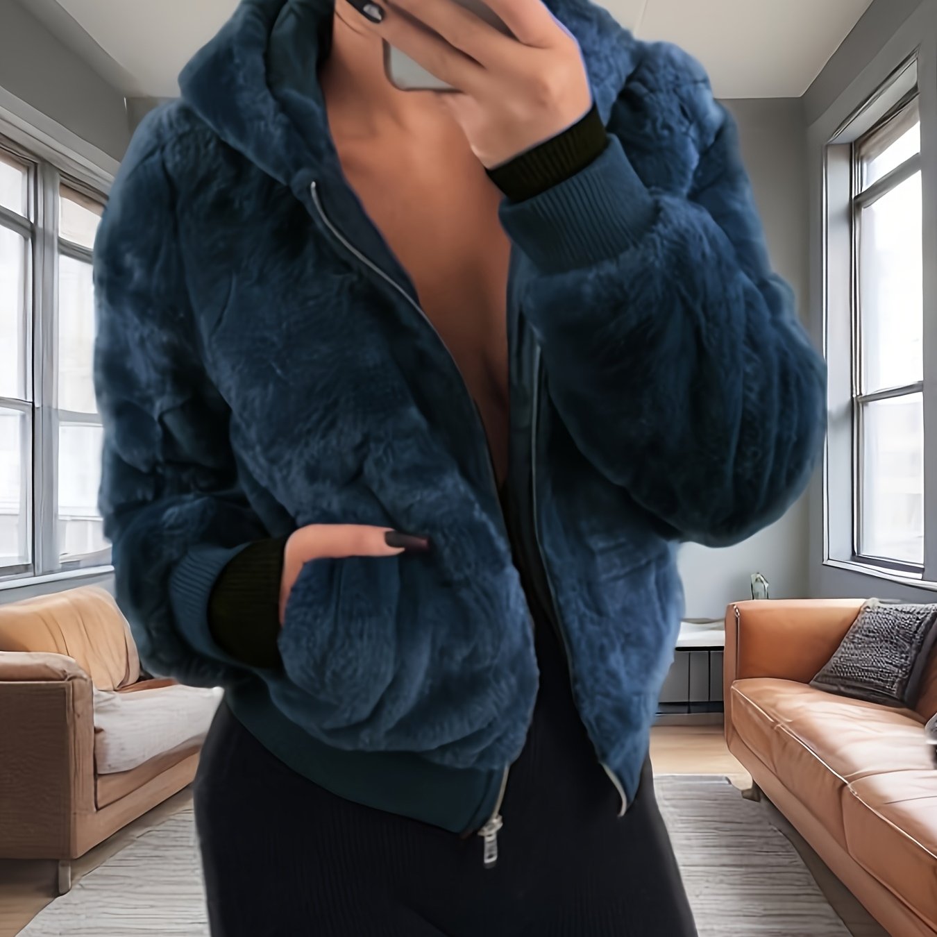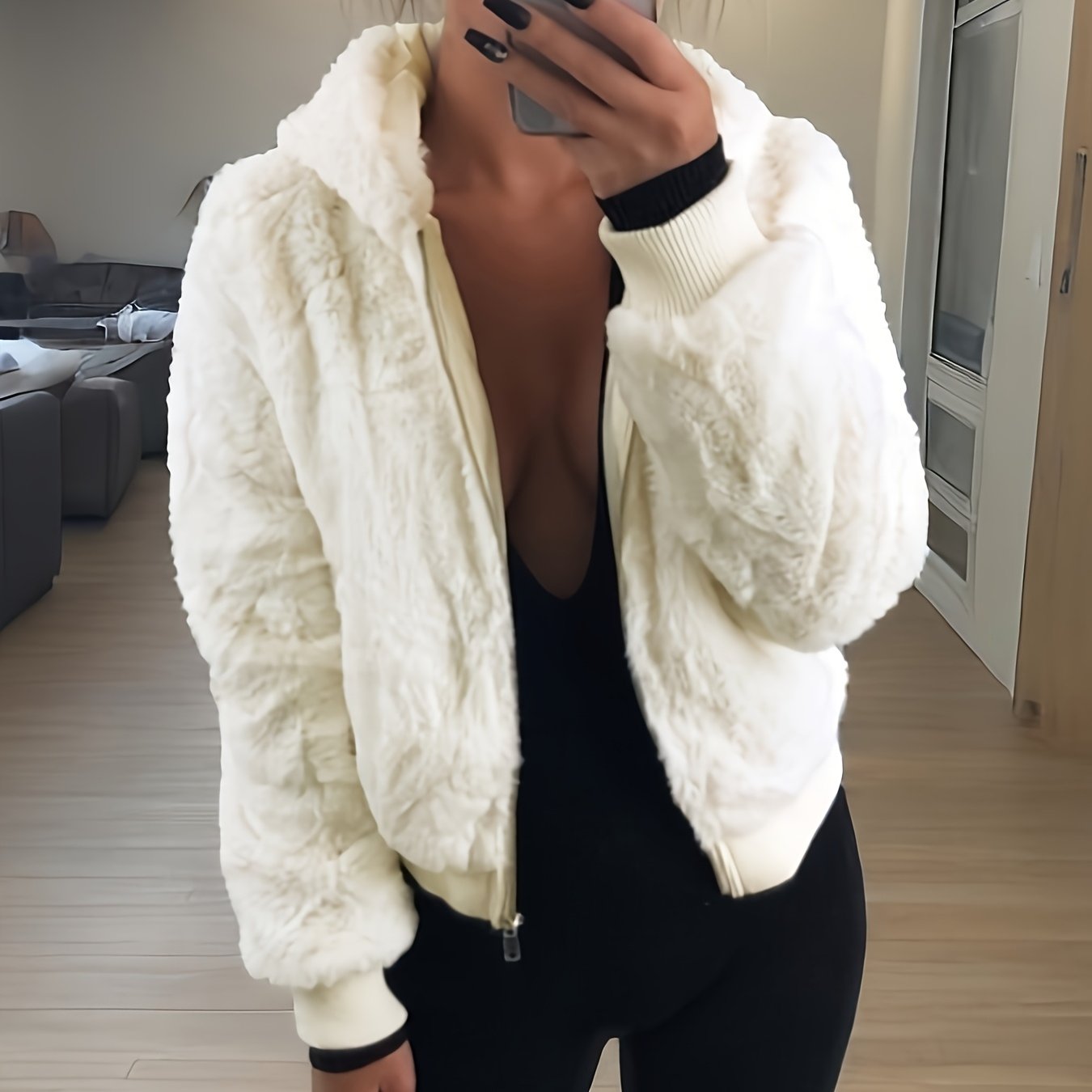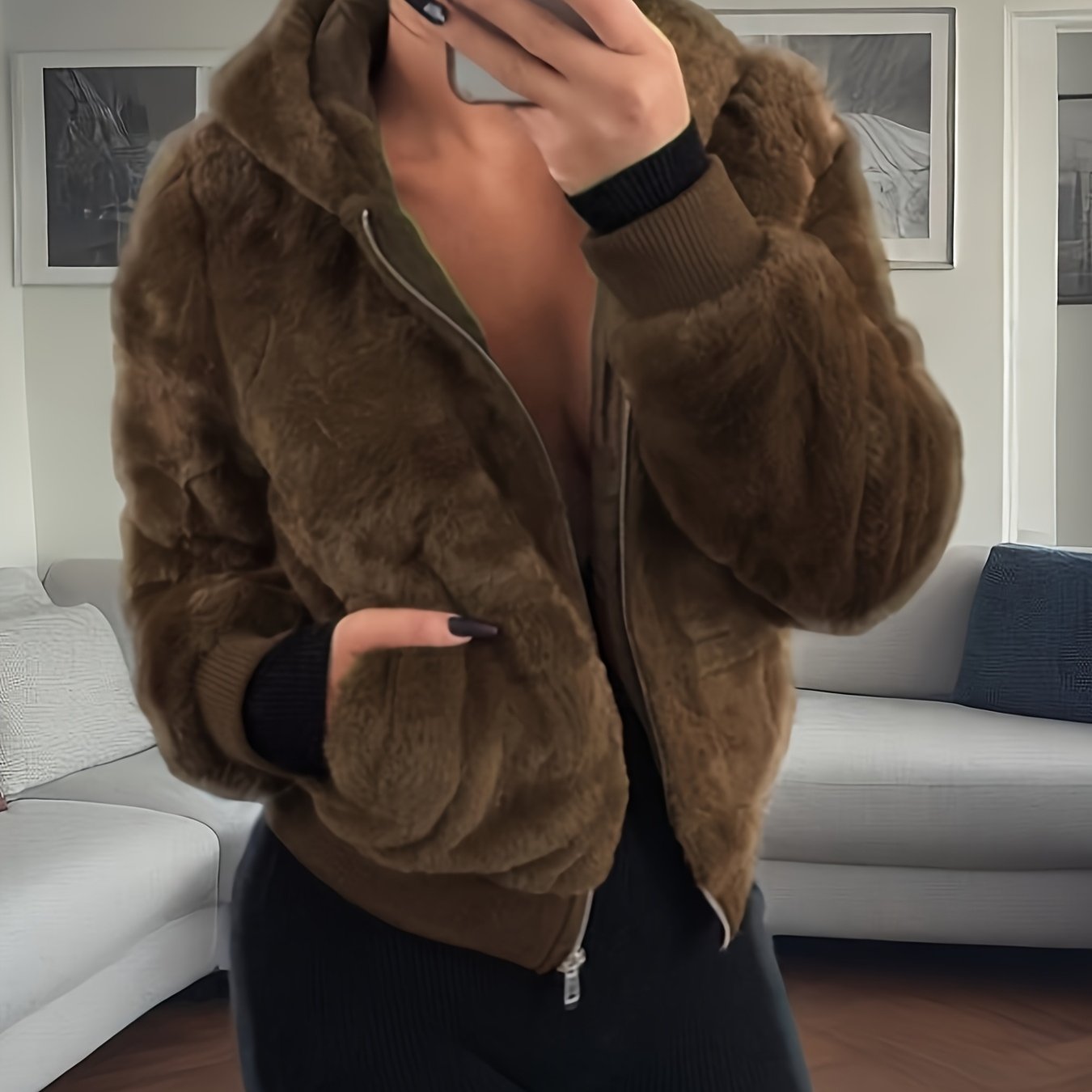 Women's Elegant Hooded Coat - Plush Texture, Zipper Closure, Chic Style