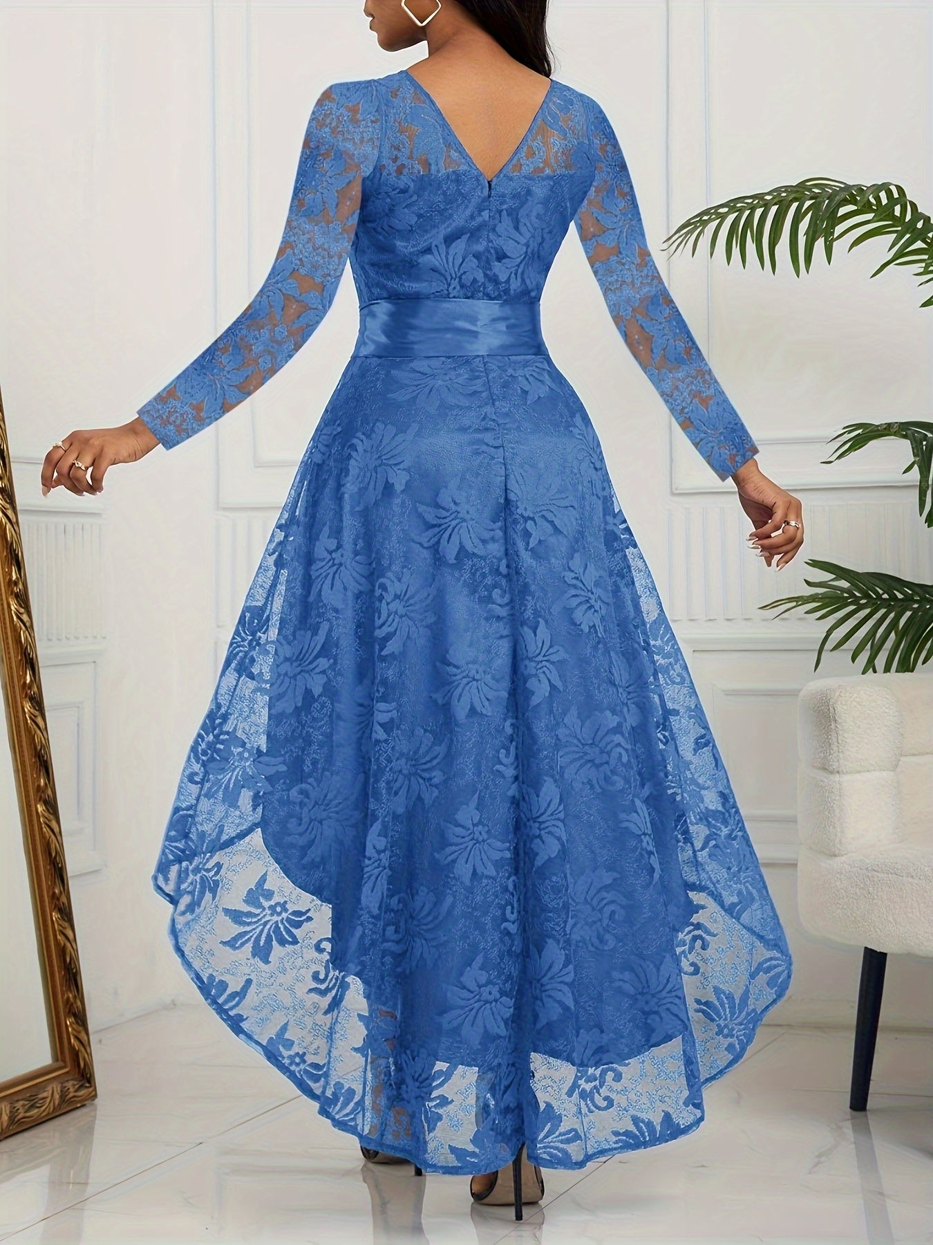 Elegant Contrast Lace High Low Hem Dress - Long Sleeve Swing Design