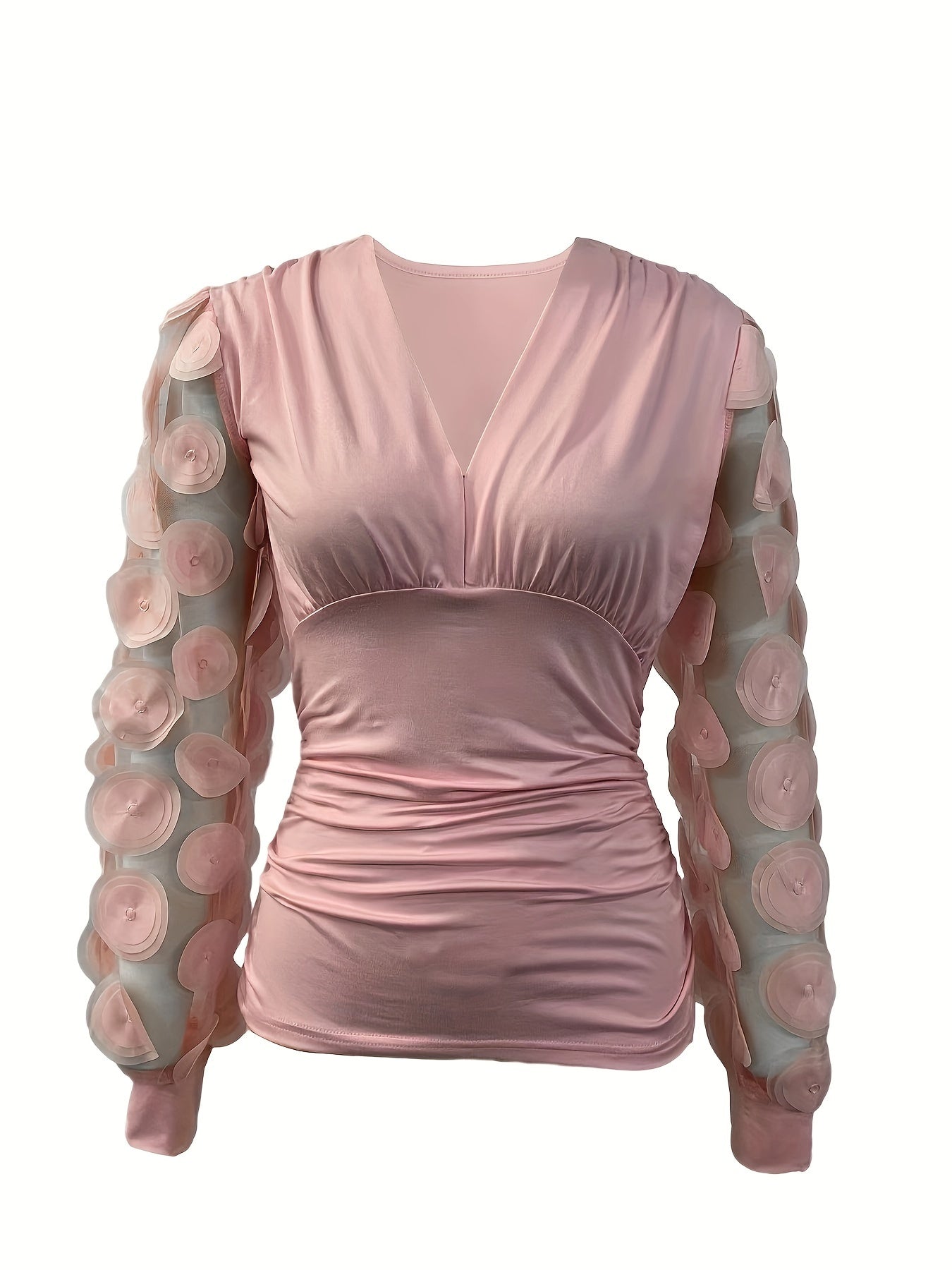 Women's Elegant V-Neck Blouse - Sheer Mesh Sleeves & Ruffle Cuffs