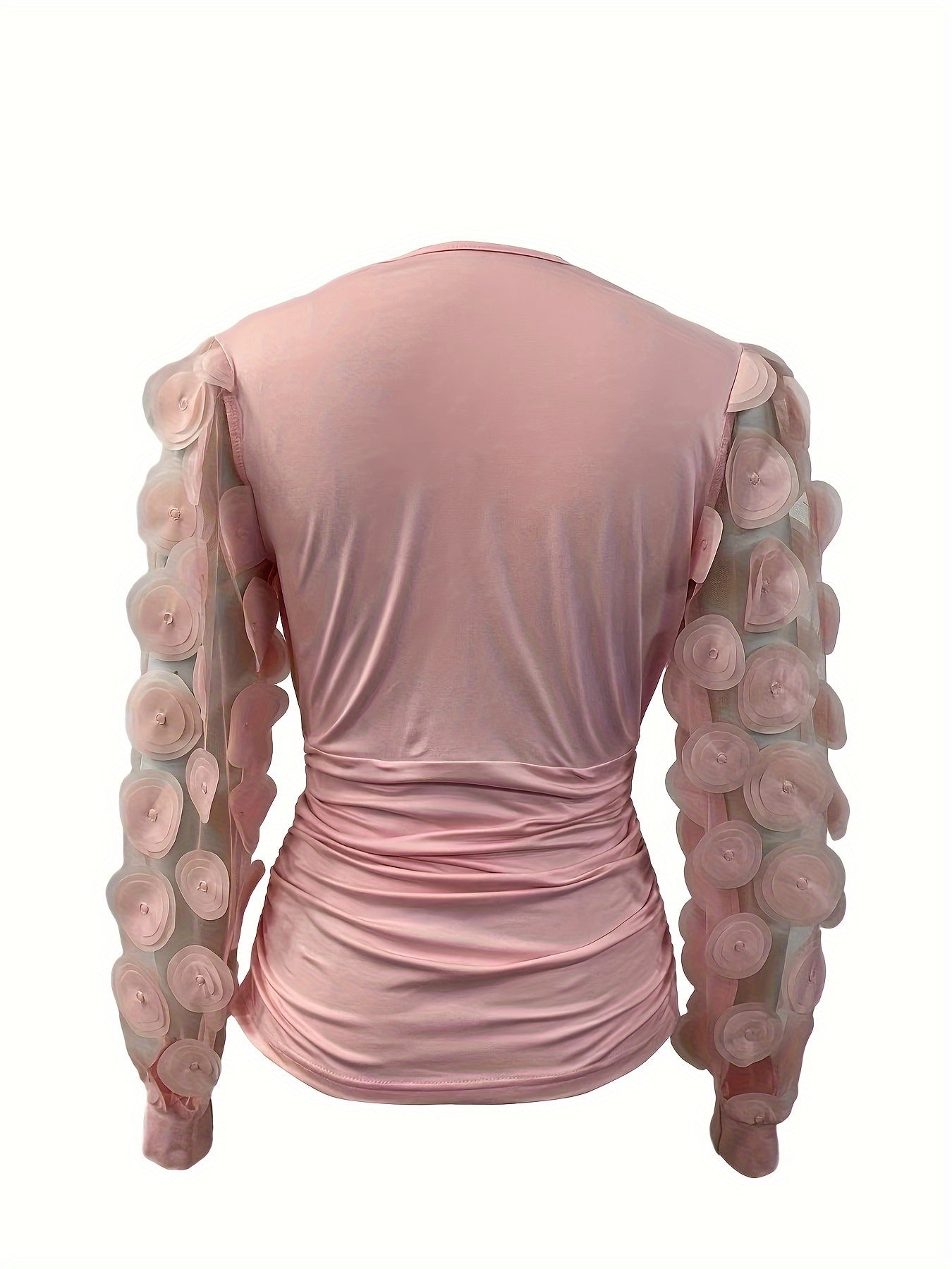 Elevate your wardrobe with our Women's Elegant V-Neck Blouse featuring sheer mesh sleeves and ruffle cuffs. Crafted from a soft 97% polyester fabric, this semi-sheer top is perfect for any season and adds a touch of sophistication to your outfit.