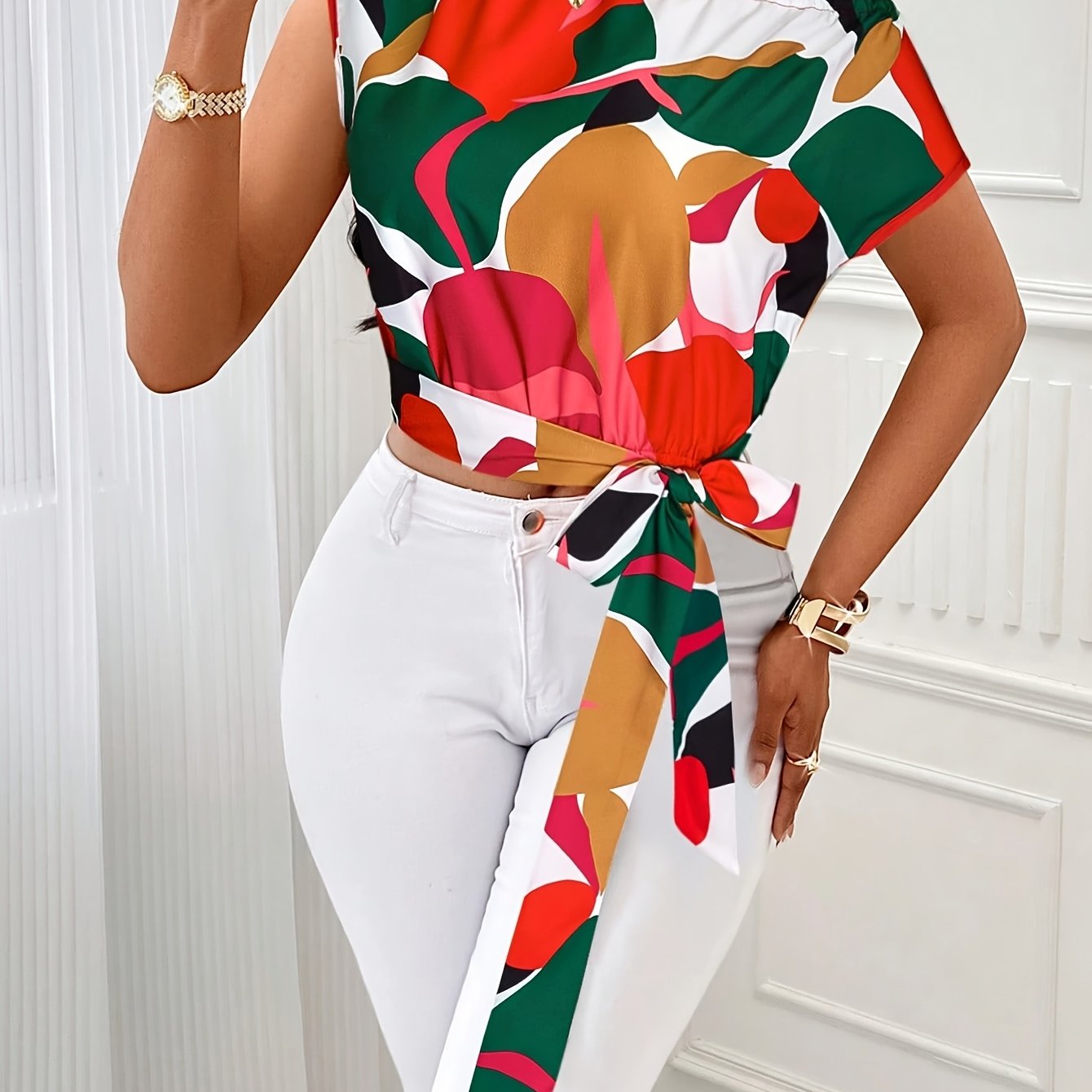 Elevate your summer wardrobe with our Women's Off-Shoulder Geometric Print Blouse, designed for chic comfort. This stylish tie-waist top features a unique geometric pattern that adds sophistication to any outfit, making it a must-have for the season.