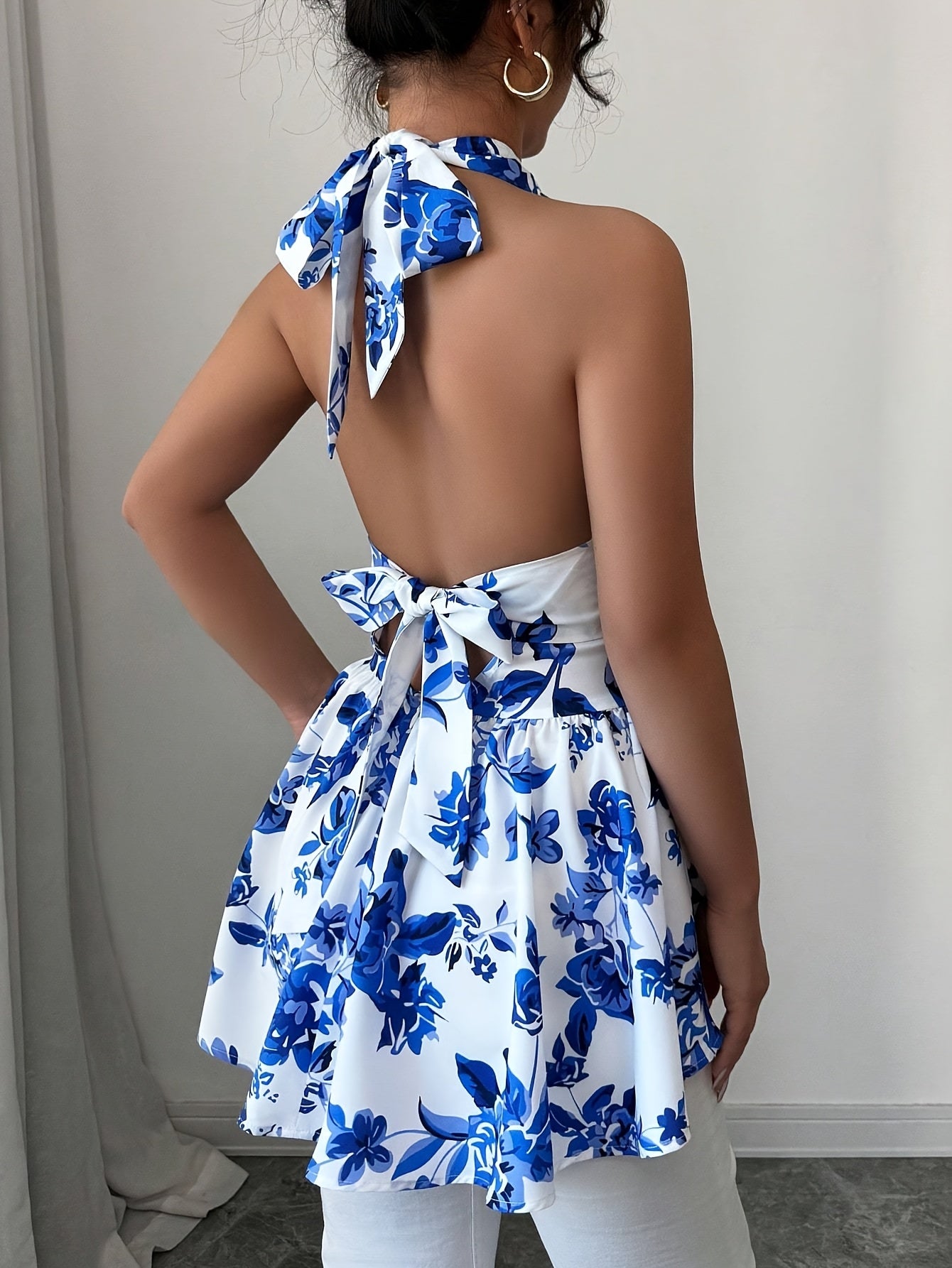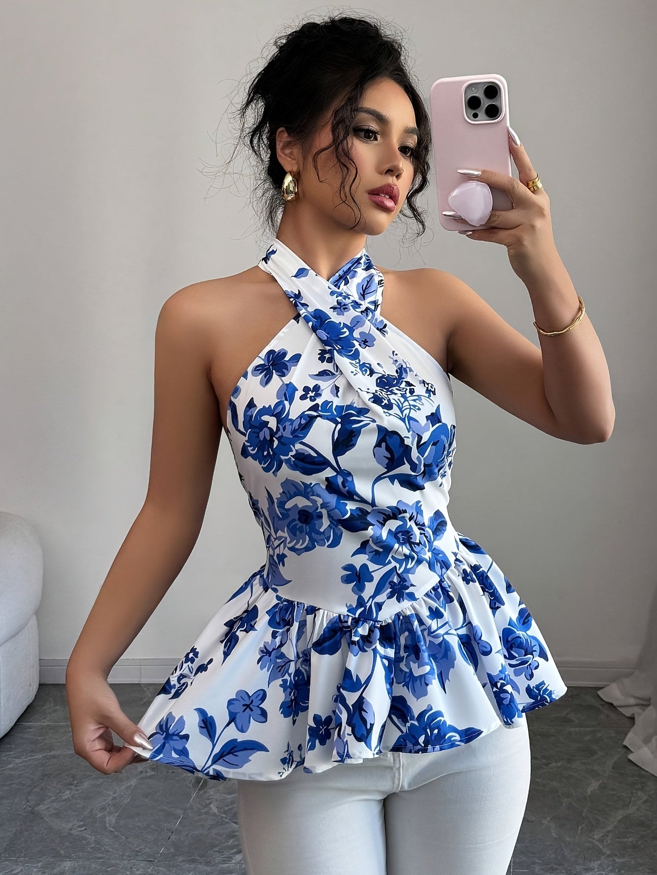 Women's Elegant Halter Neck Blouse - Blue Floral Summer Top