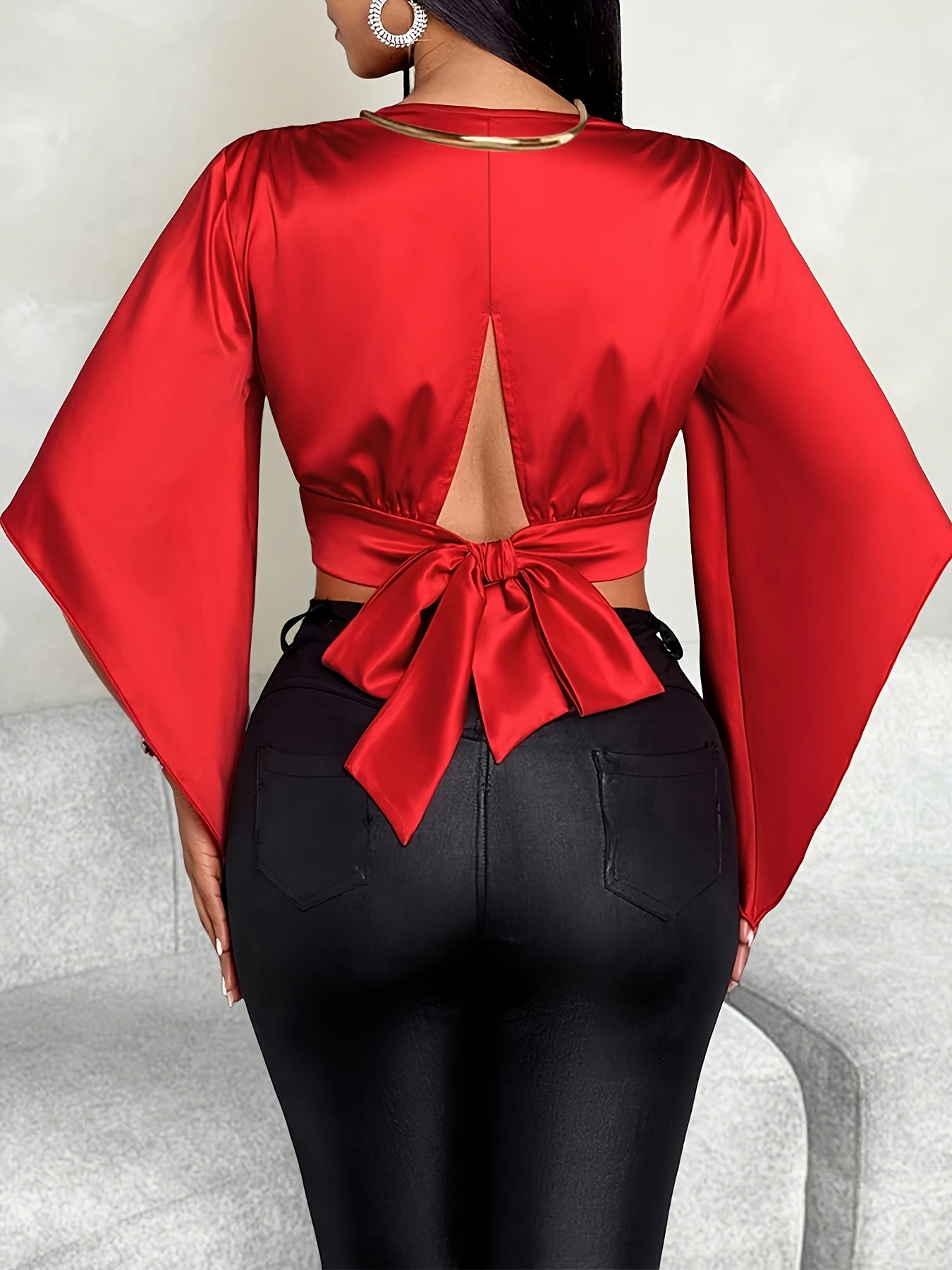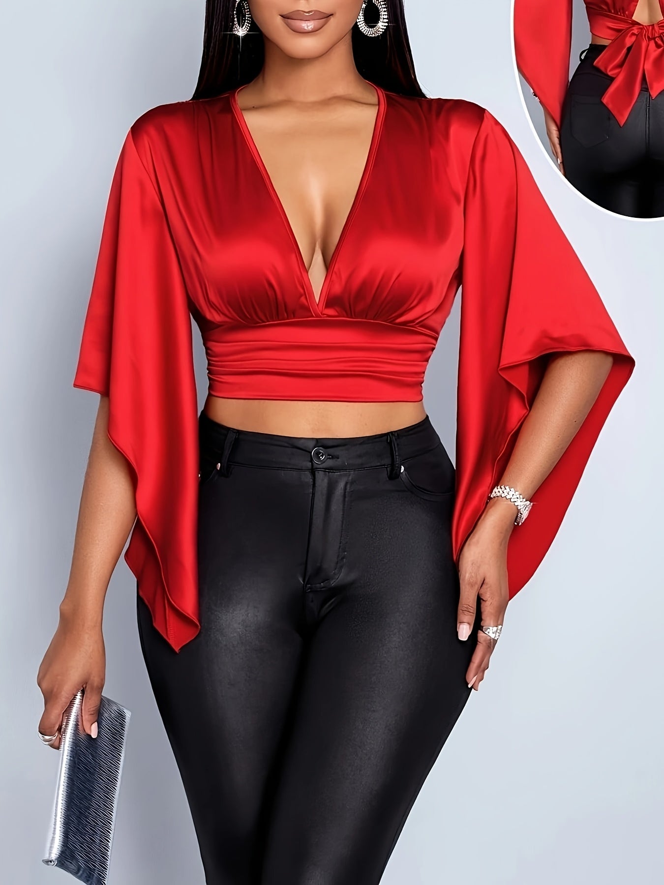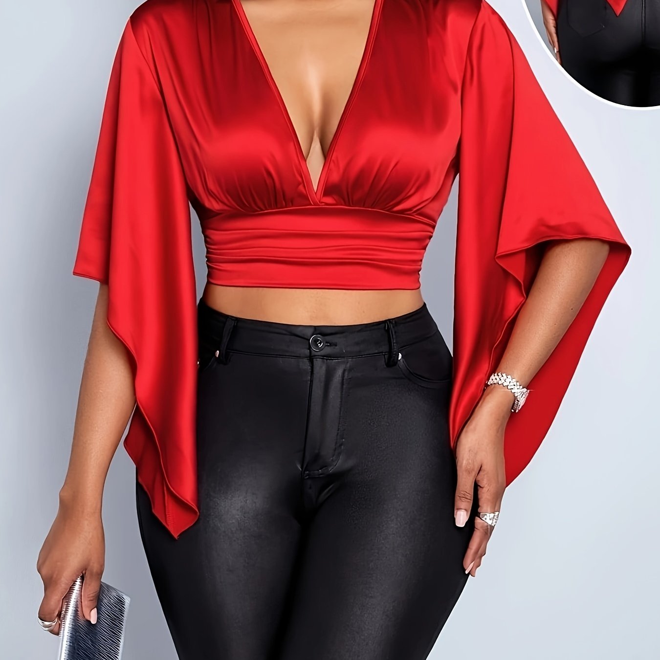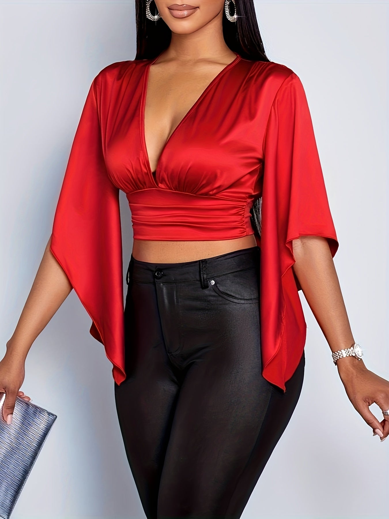 Women's Elegant V-Neck Blouse - Rich Red Asymmetrical Summer Top