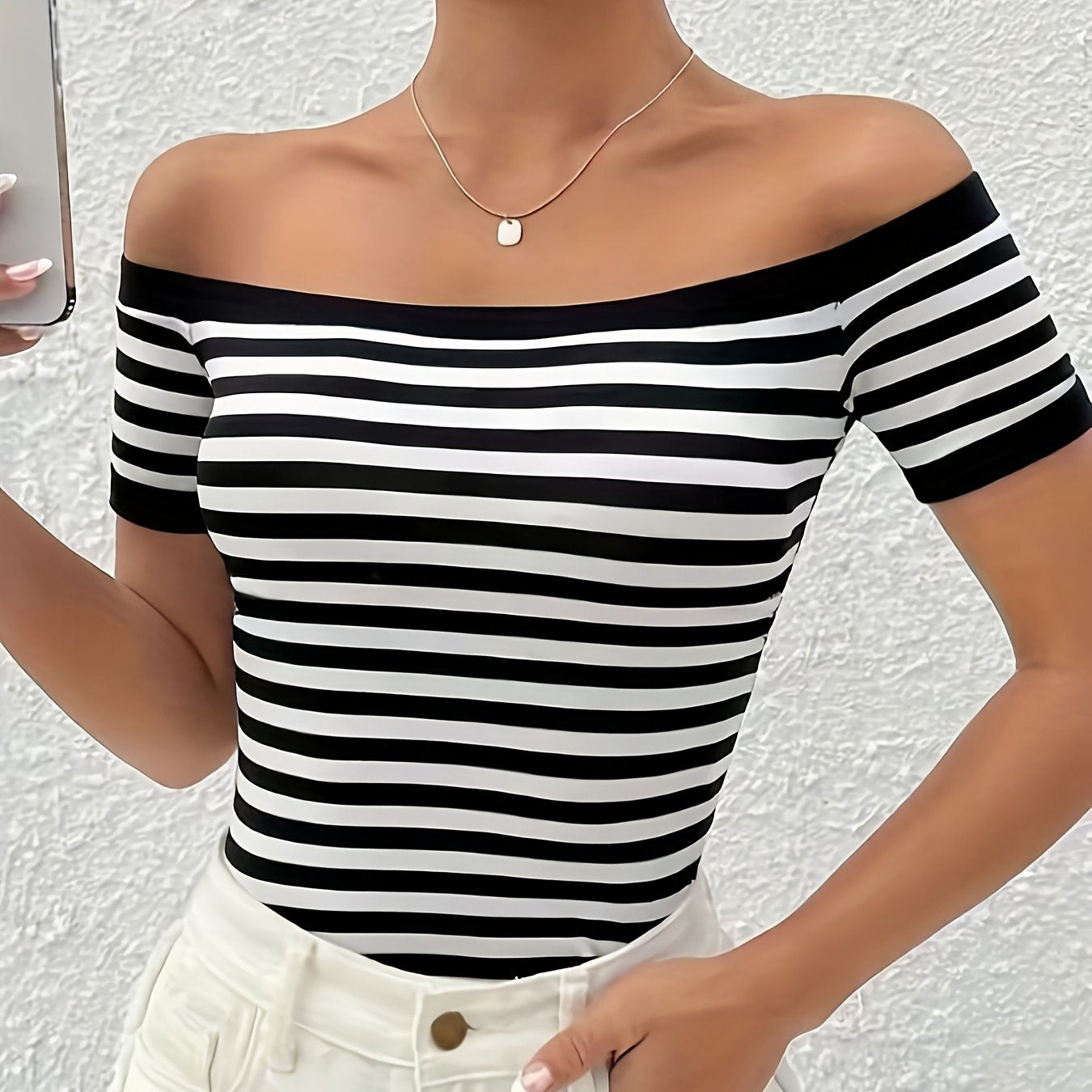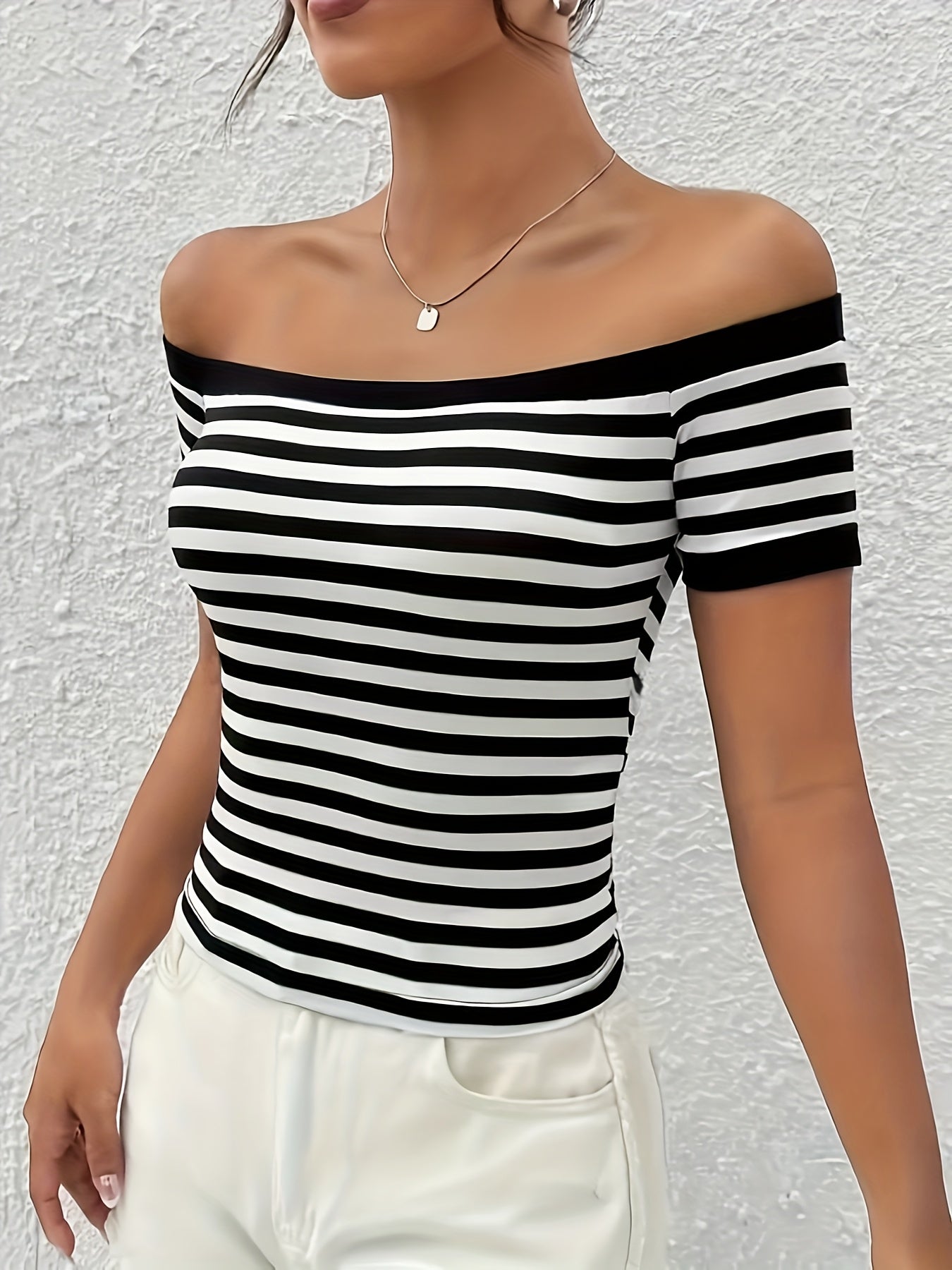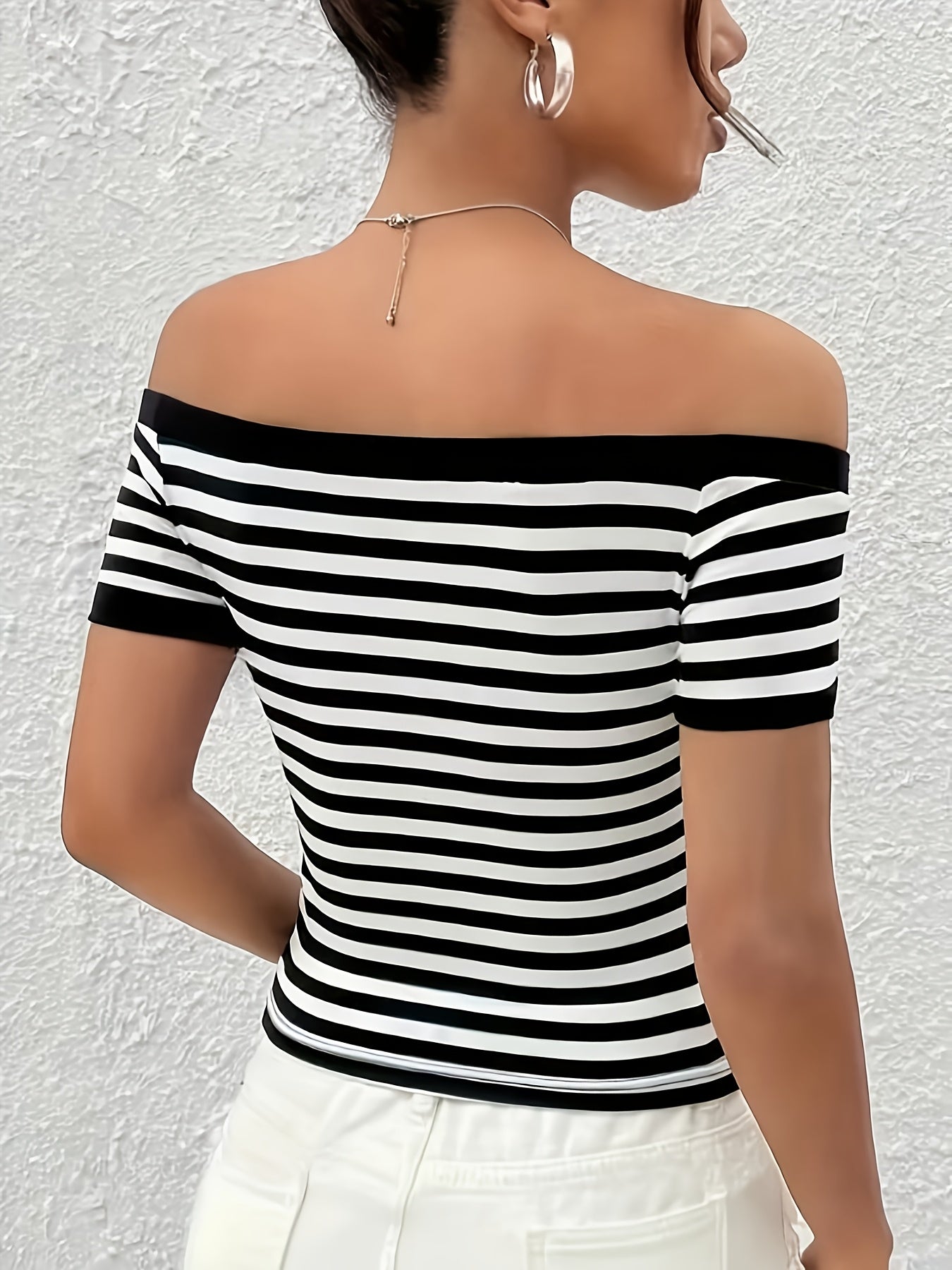 Women's Off-Shoulder Striped Knit Top - Elegant Summer Short Sleeve
