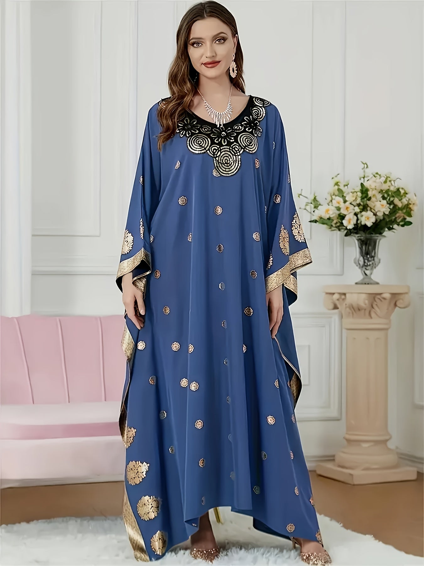 Discover the elegance of our Blue Abaya featuring a striking golden floral print and stylish batwing sleeves. This floor-length dress is meticulously crafted from high-quality polyester, ensuring comfort and durability. Perfect for any season—spring, summer, or fall—this versatile fashion piece will enhance your wardrobe.
