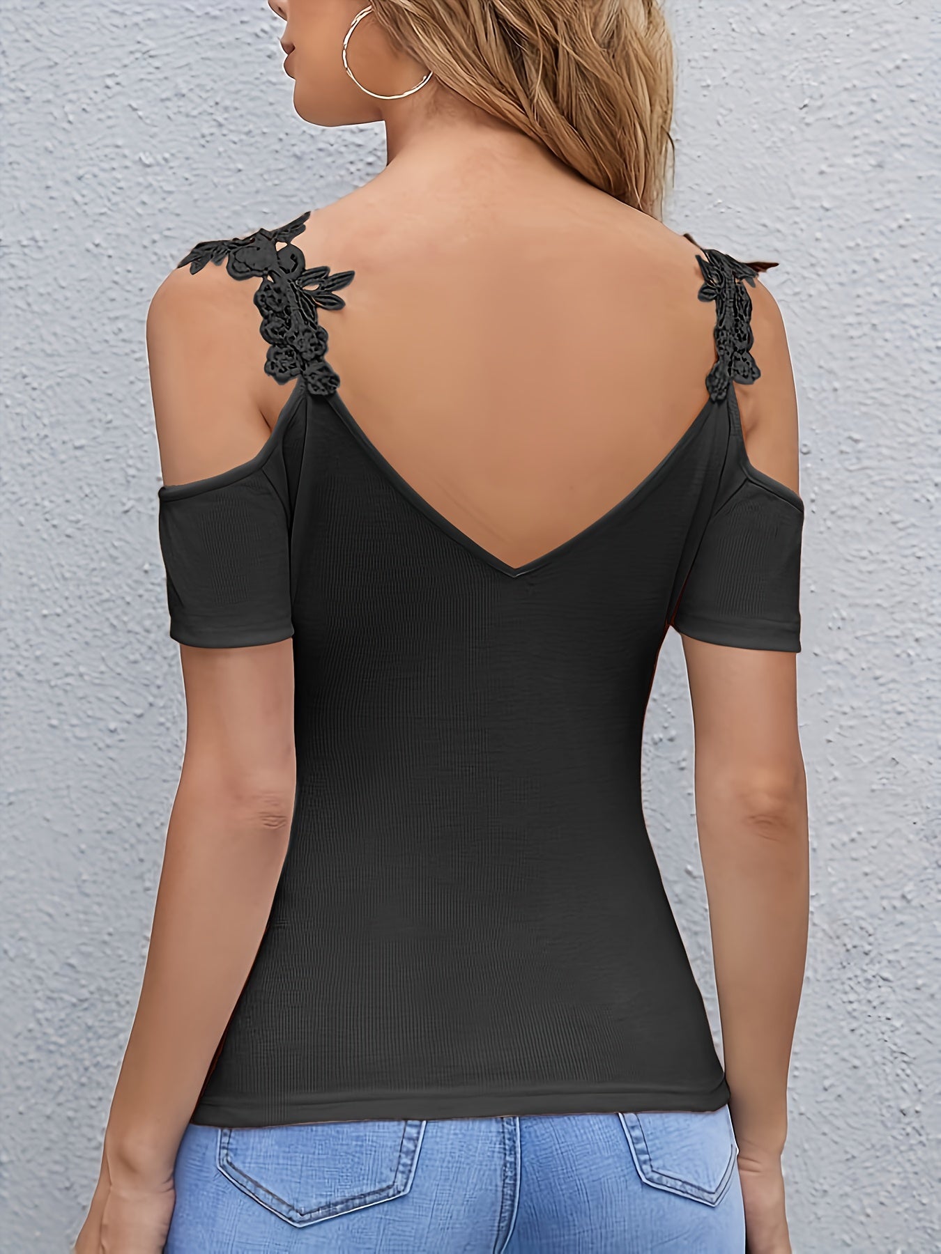 Enhance your everyday style with this Women's Chic V-Neck Lace-Trim T-Shirt. Ideal for all seasons, this shirt pairs beautifully with jeans or skirts, allowing you to showcase your personal style effortlessly. Stand out in comfort and elegance every day.