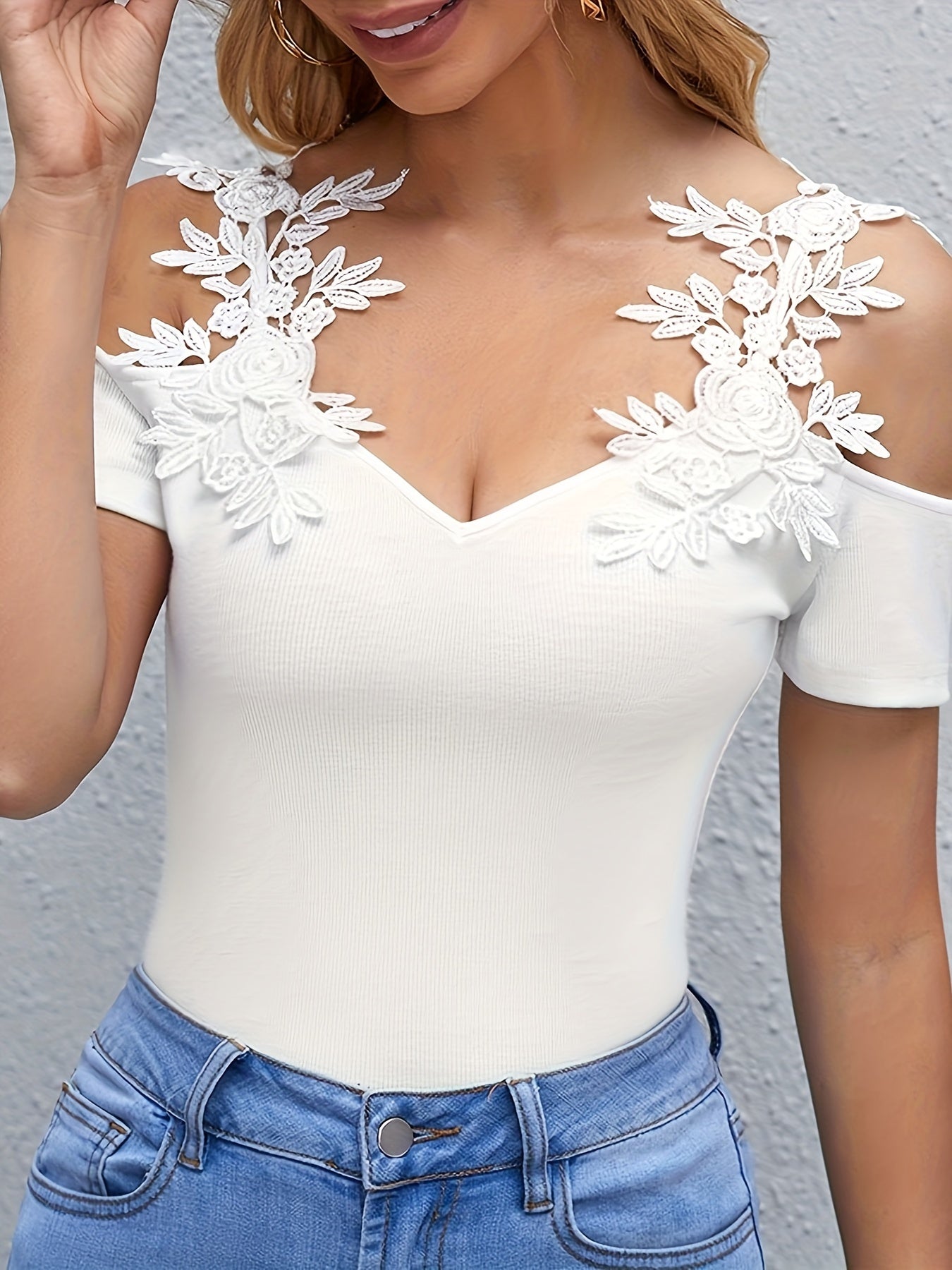 Women's Chic V-Neck Lace-Trim T-Shirt - Casual White Top for Ladies