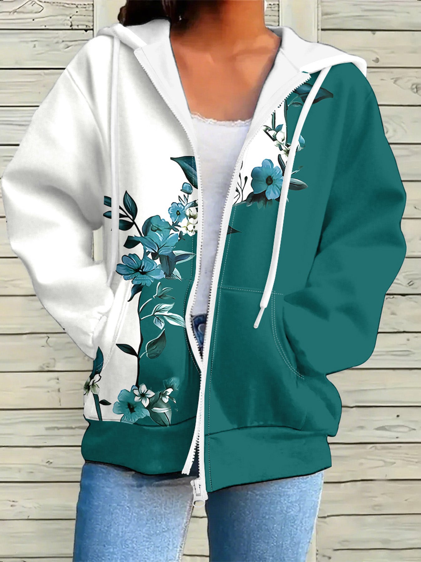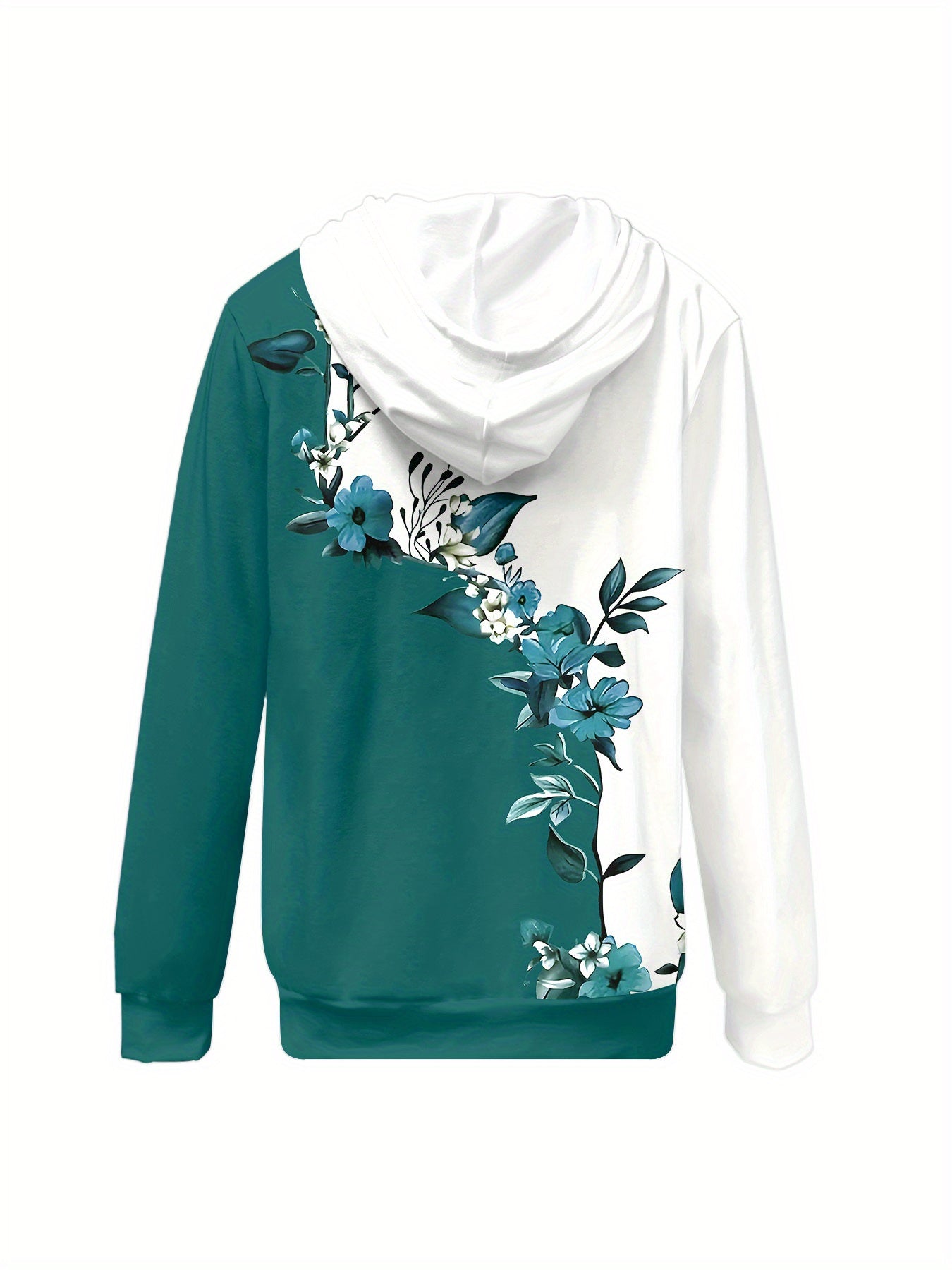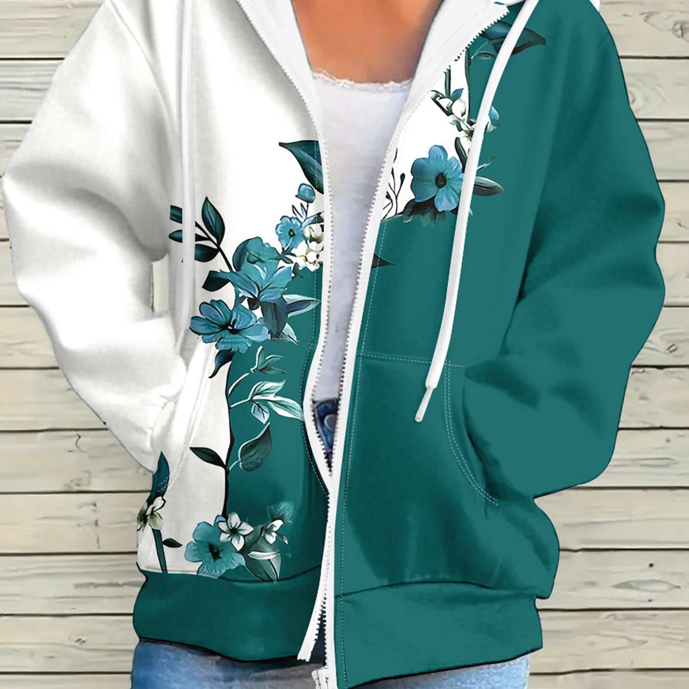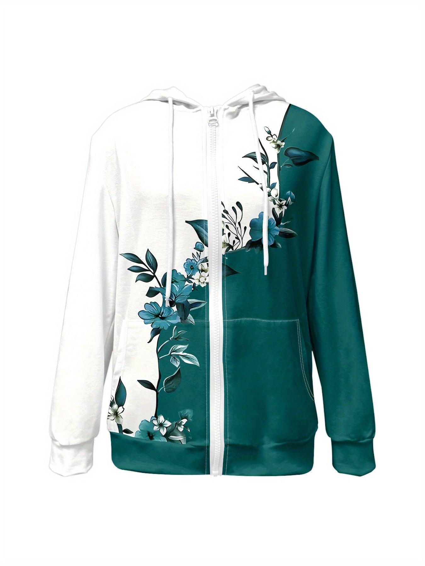 Women's Elegant Teal Floral Hoodie - Zip-Up Sweatshirt for Fall