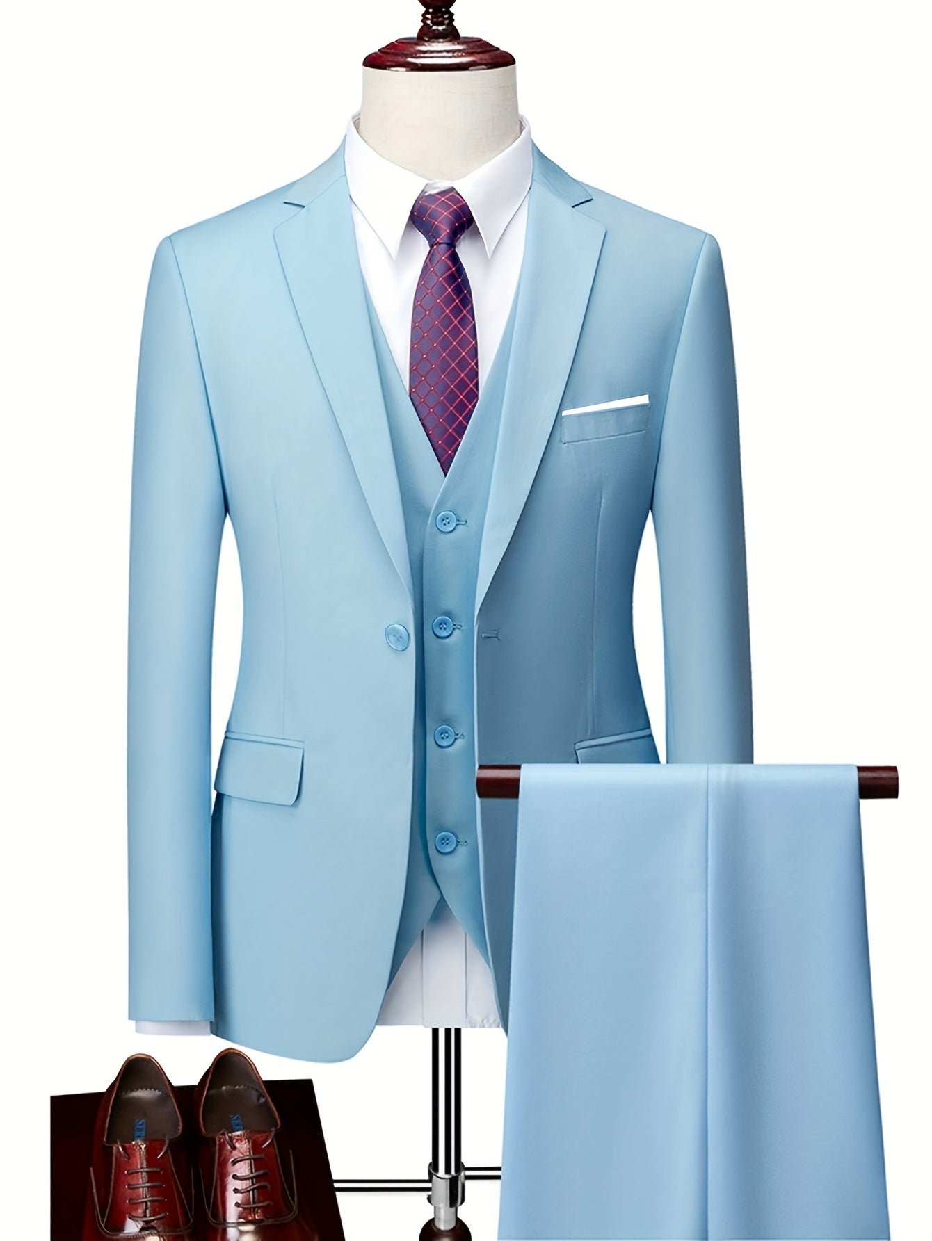 Elevate your formal wardrobe with our Men's Slim Fit Suit Set, featuring a sleek black jacket, stylish vest, and tailored pants. Made from high-quality polyester and viscose blend, this suit offers impeccable style and comfort, making it perfect for any special event or work occasion.