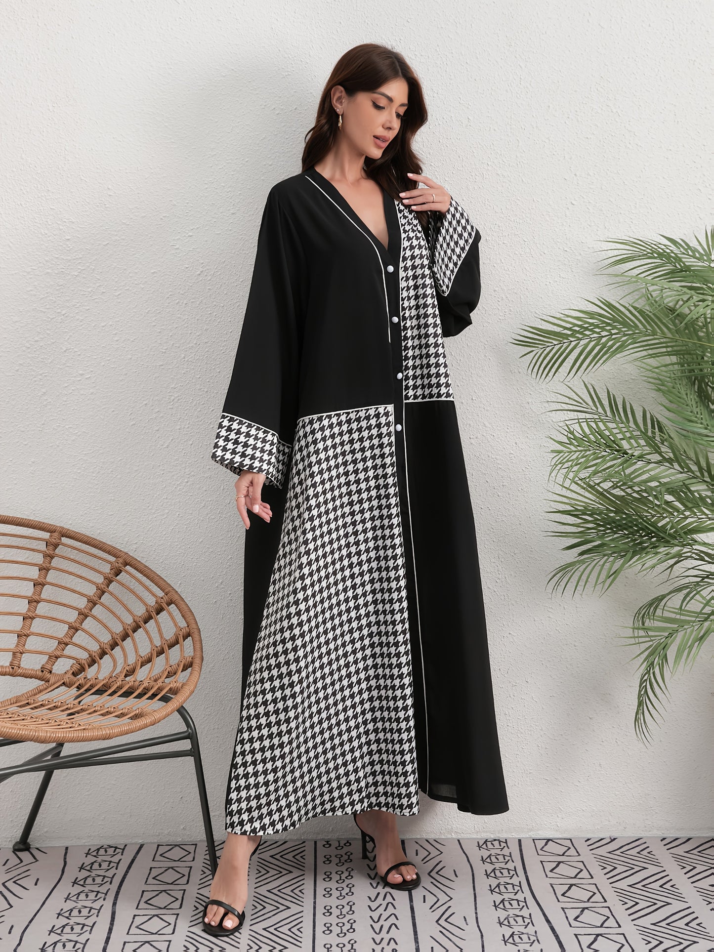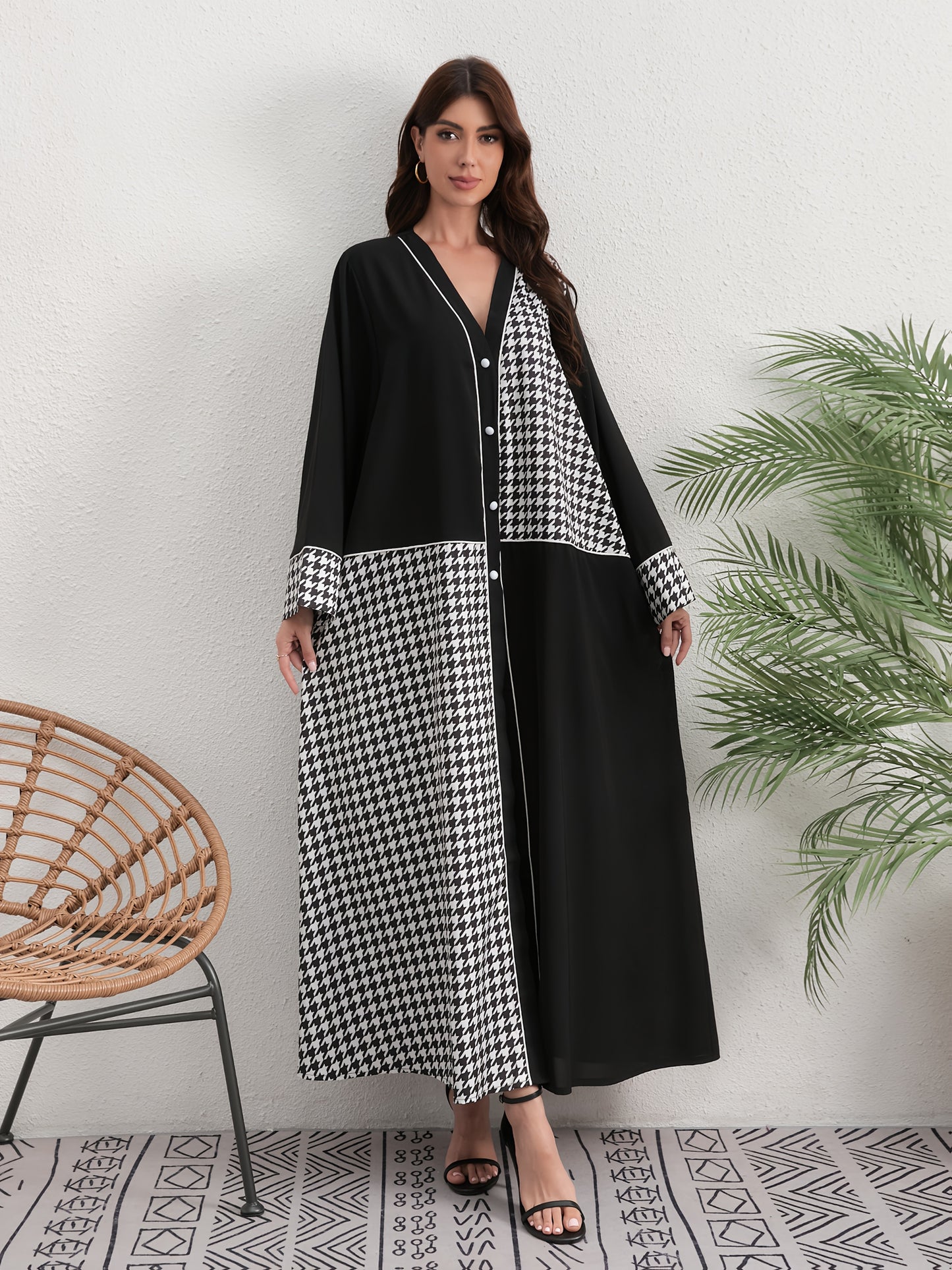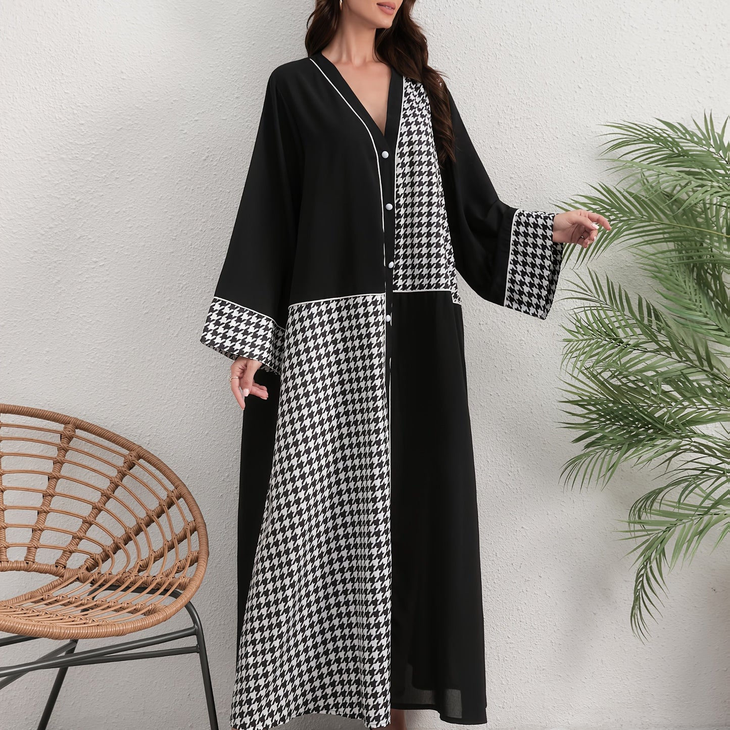 Elegant Black and White Houndstooth Abaya - Long Sleeve, V-Neck Style