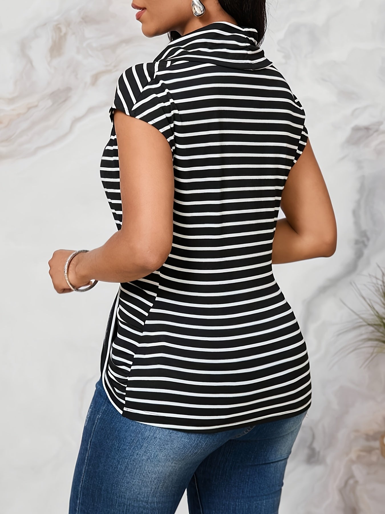 Women's Slim-Fit V-Neck Striped Blouse - Elegant Black & White Design