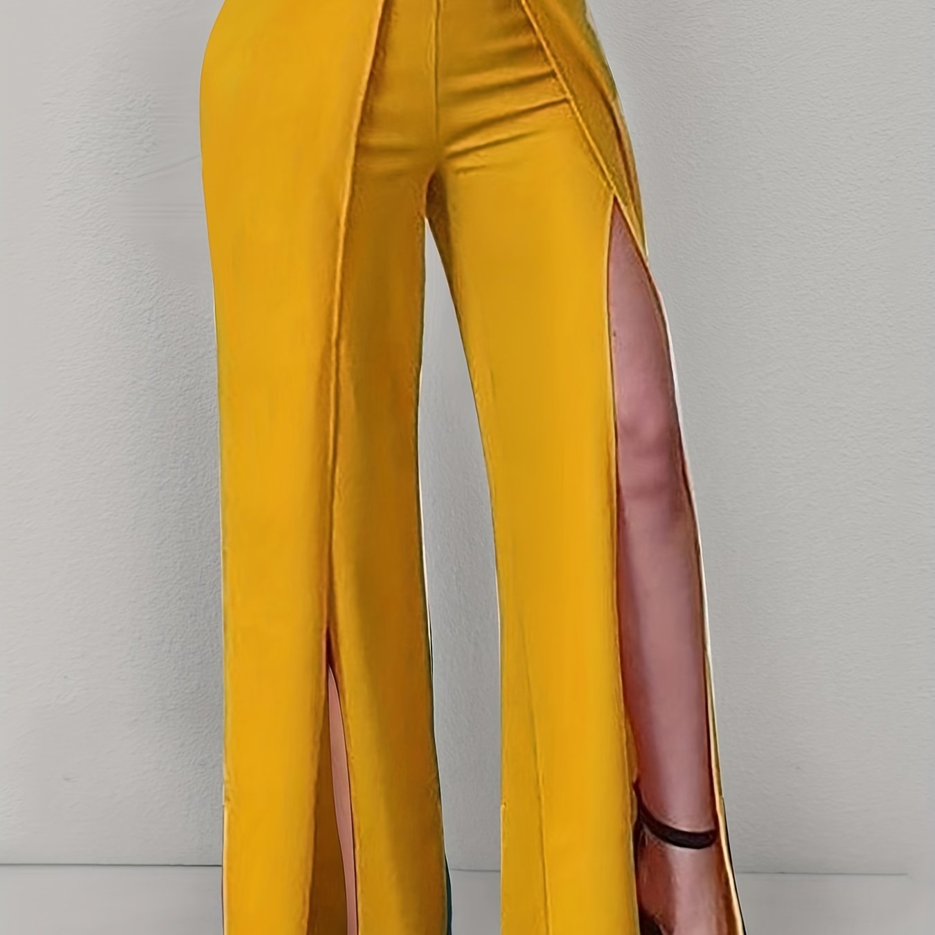 Discover the perfect blend of style and comfort with our High Waist Split Thigh Pants. Crafted from 95% polyester, these vintage solid flared leg pants feature an elegant high slit design that elevates any outfit. Ideal for any season, these wide-leg pants are a versatile addition to your wardrobe, offering a flattering silhouette that enhances your style.