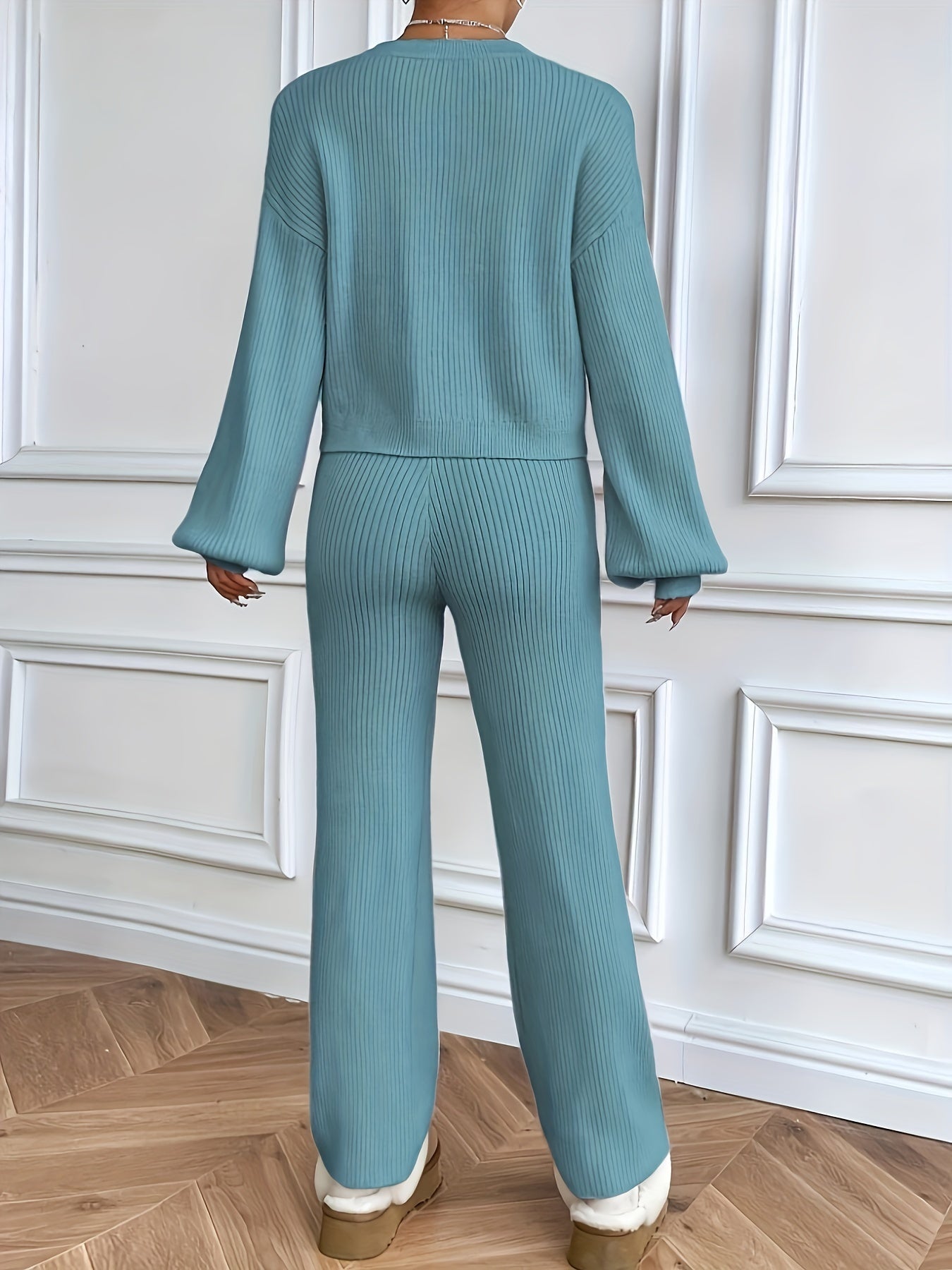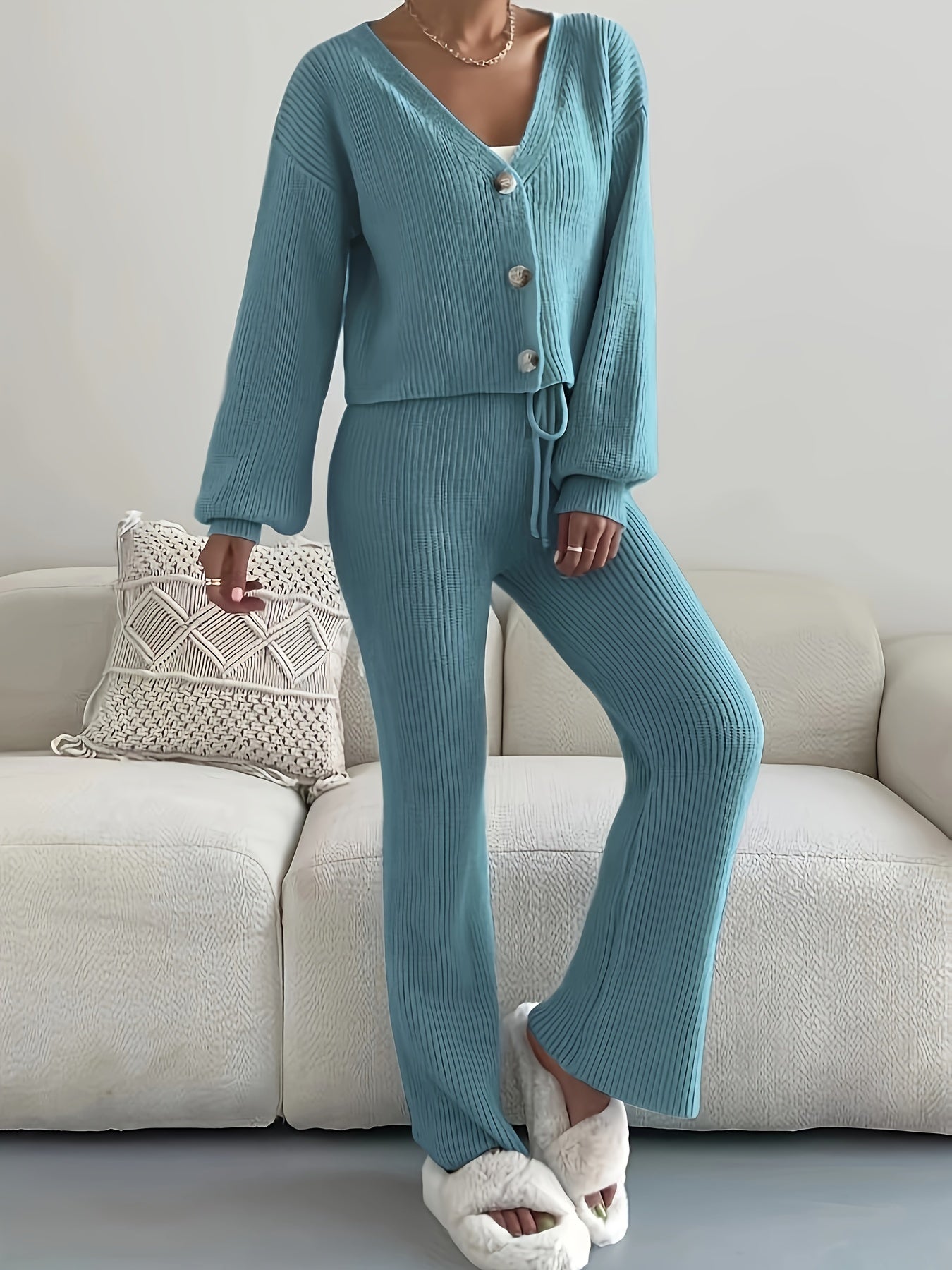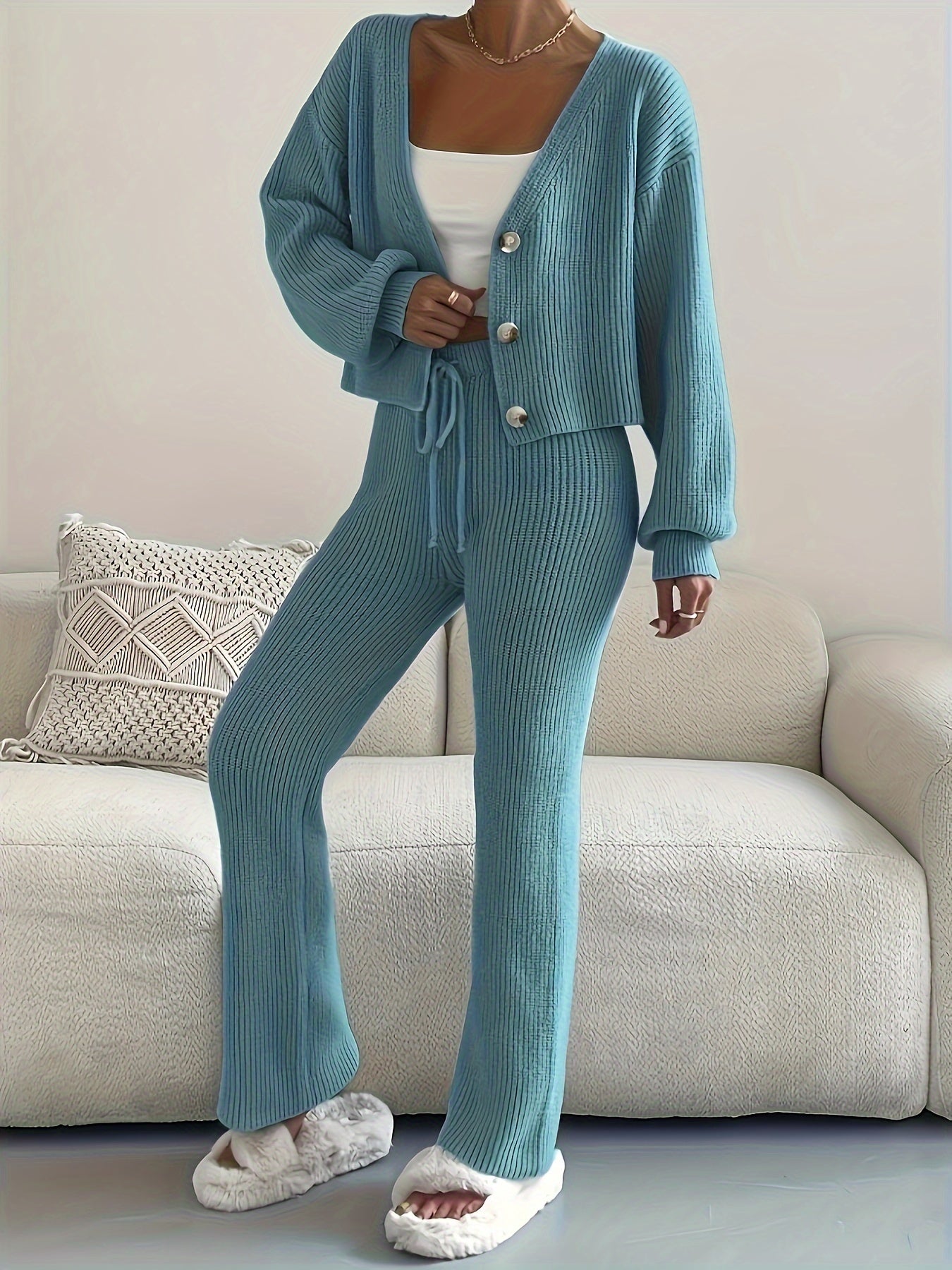 Women's Solid Color Casual Pantsuit - V Neck Cardigan & High Waist