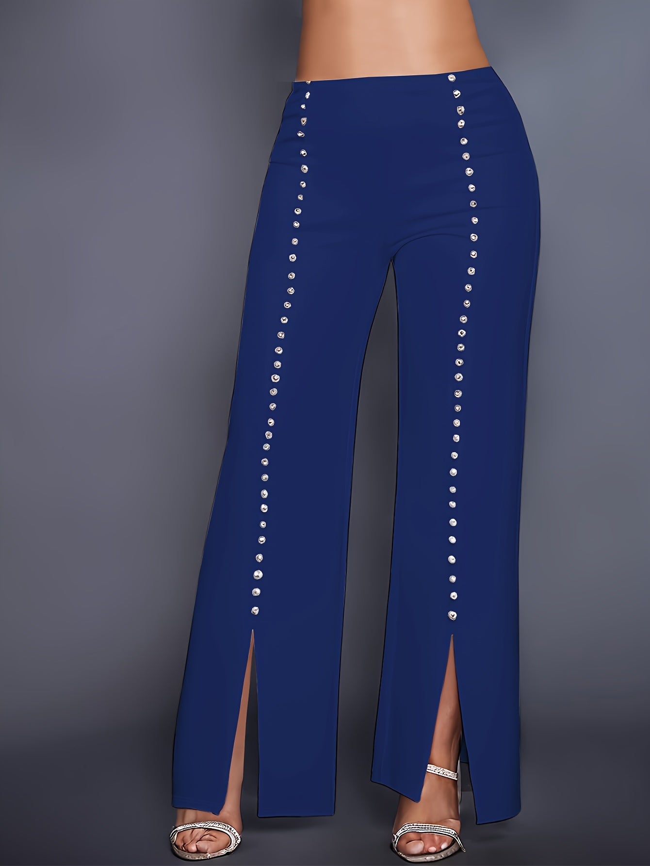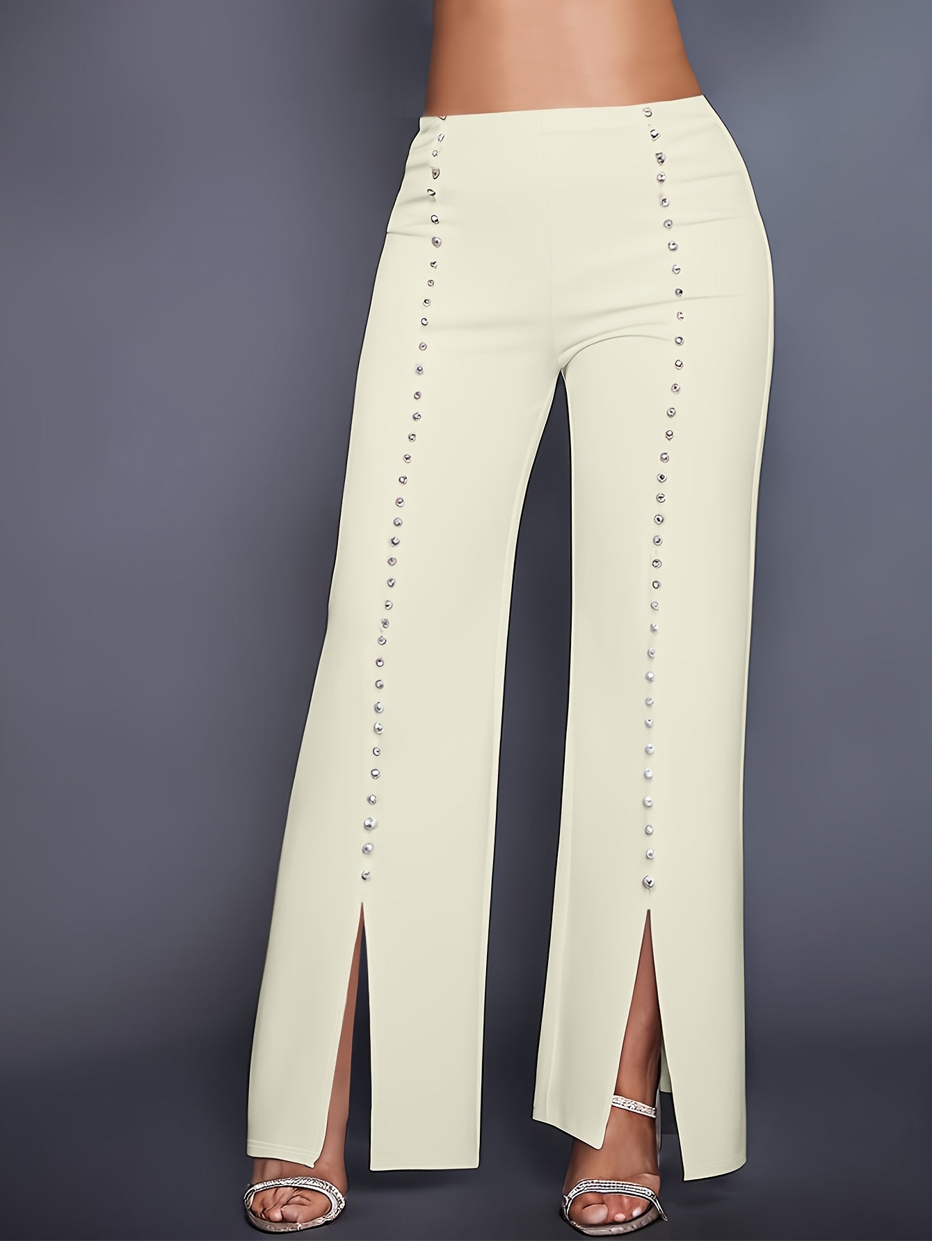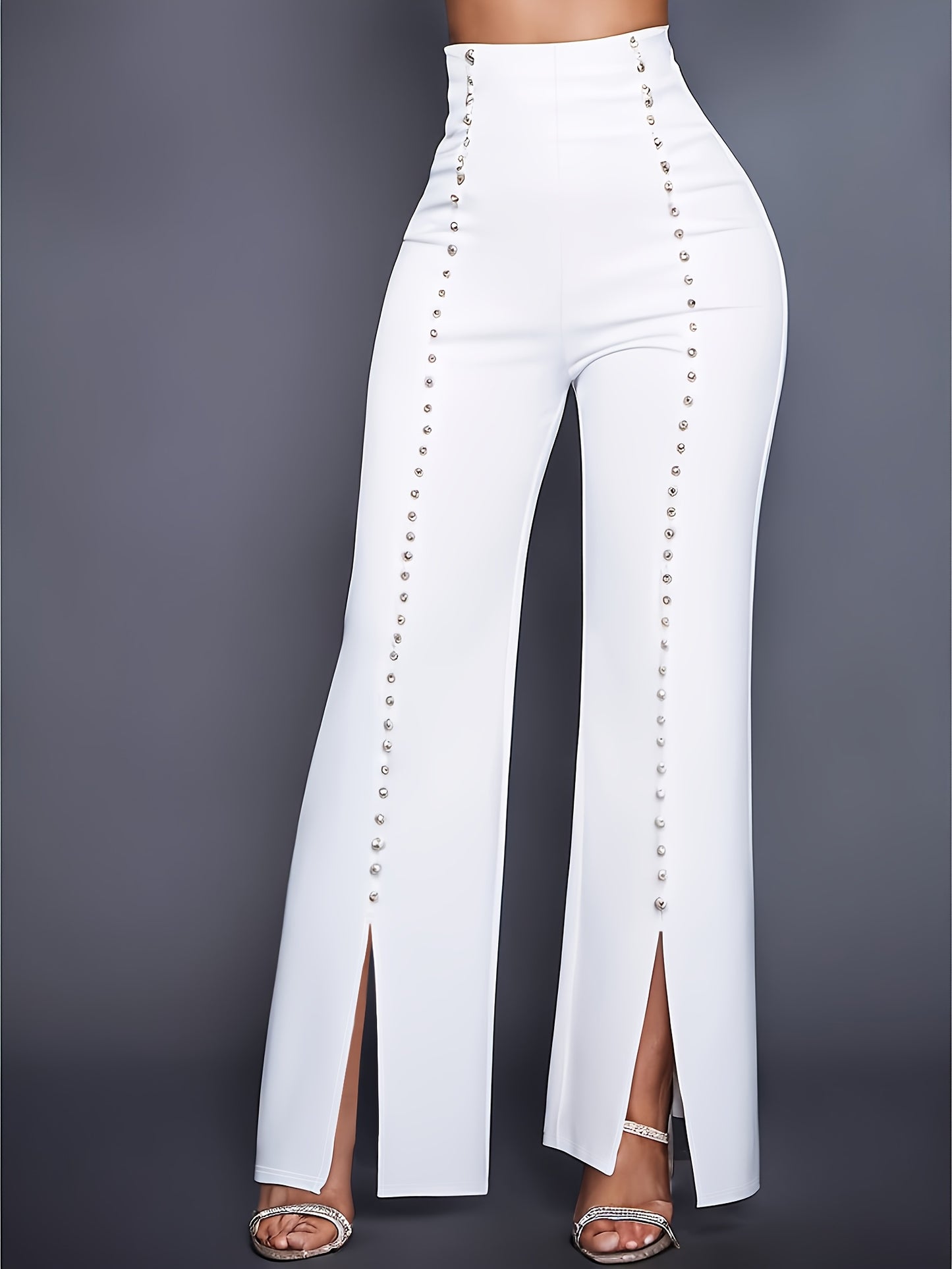 Discover the perfect blend of style and comfort with our Women's Elegant High-Waisted Wide-Leg Pants. Crafted from a luxurious polyester-spandex blend, these versatile trousers feature a chic round button detail and are designed for both casual and formal wear, making them ideal for all seasons.