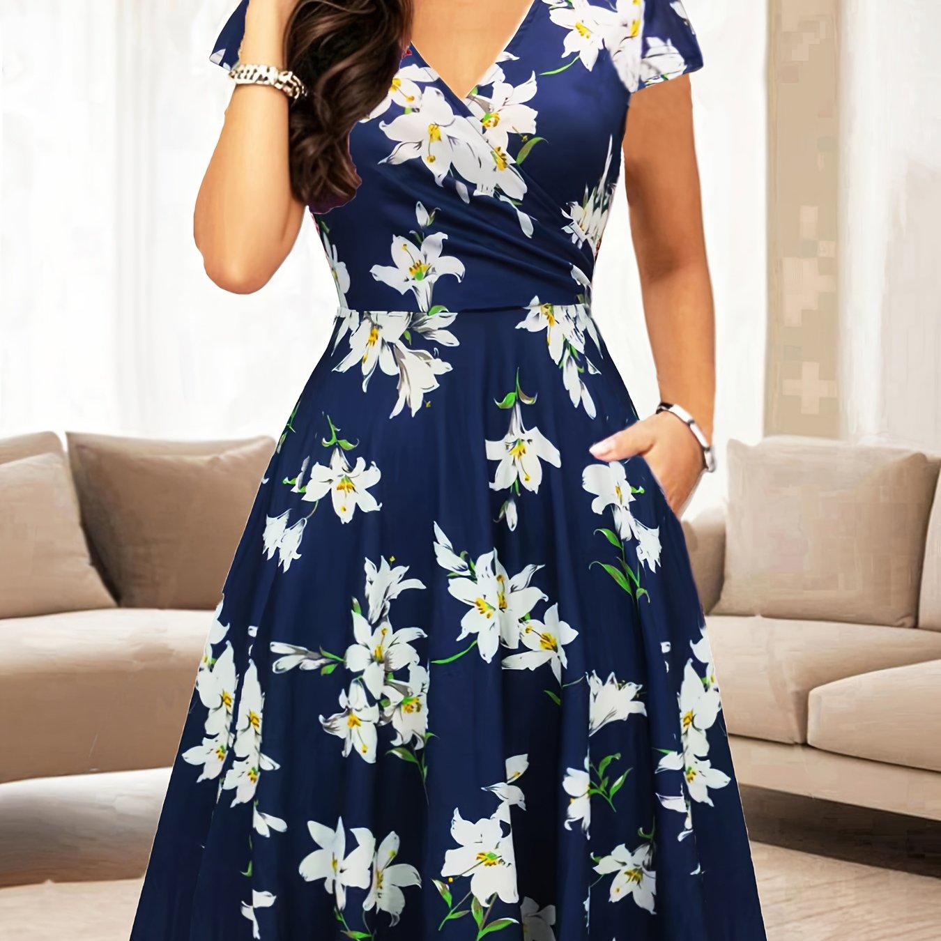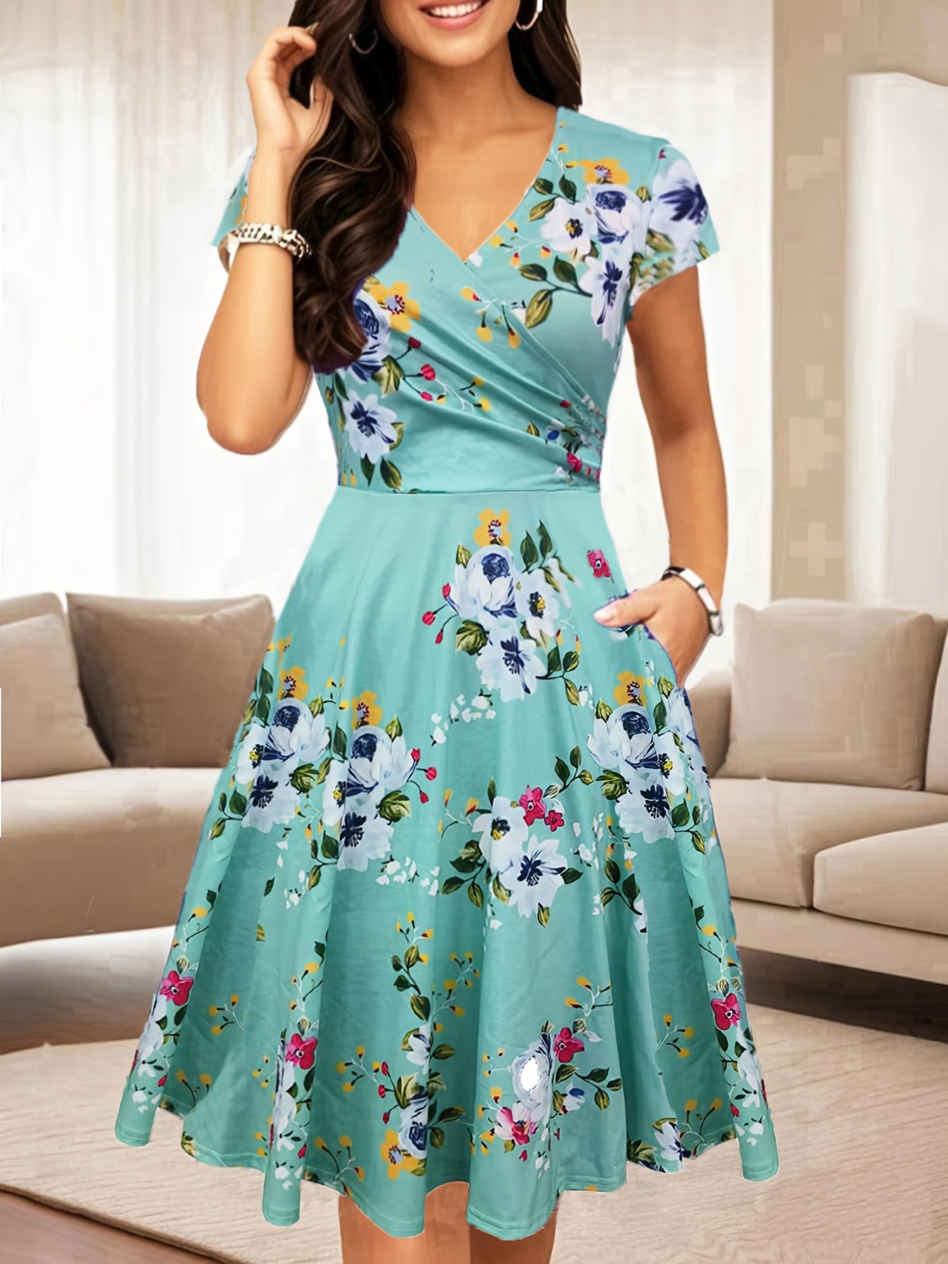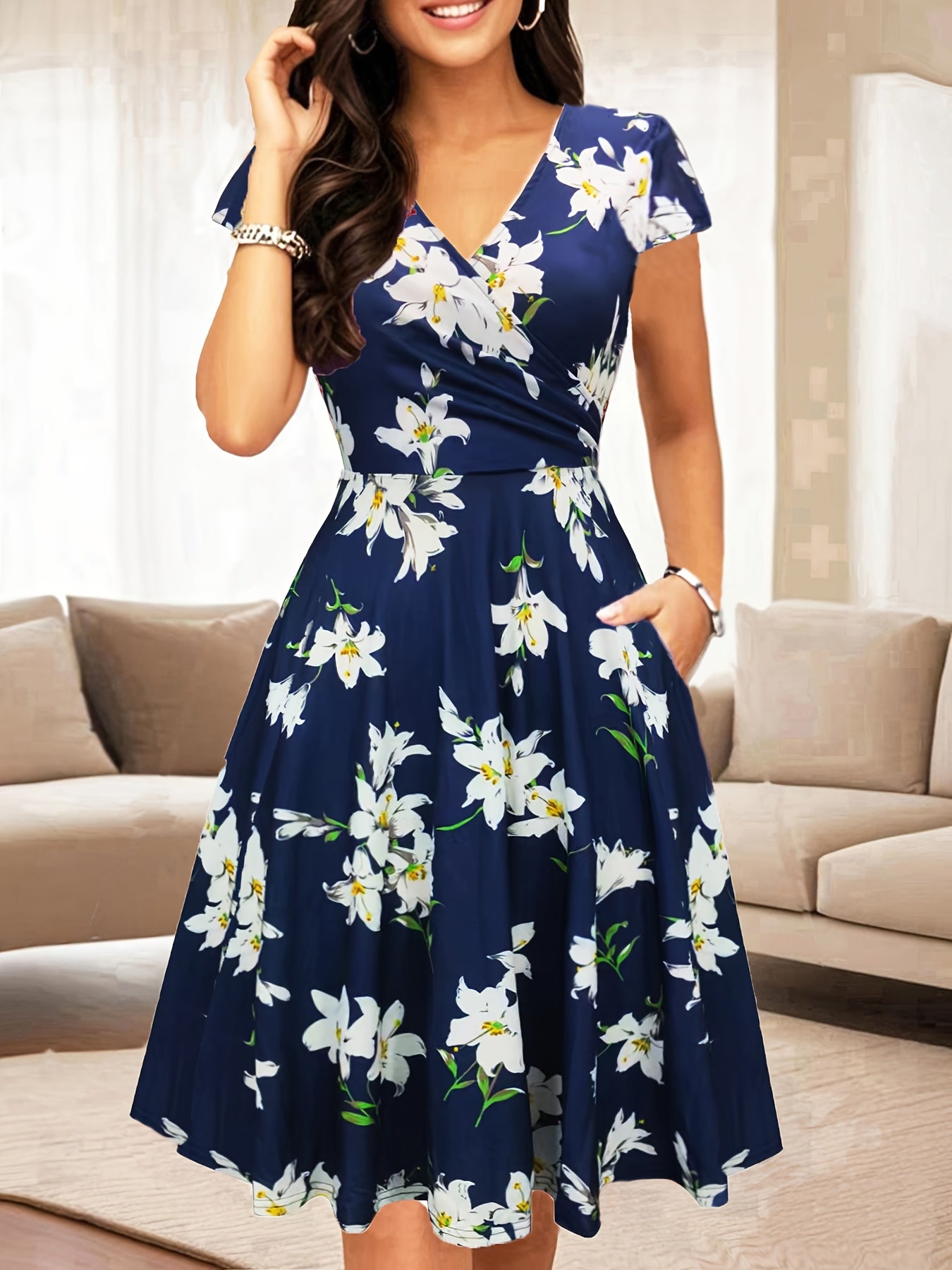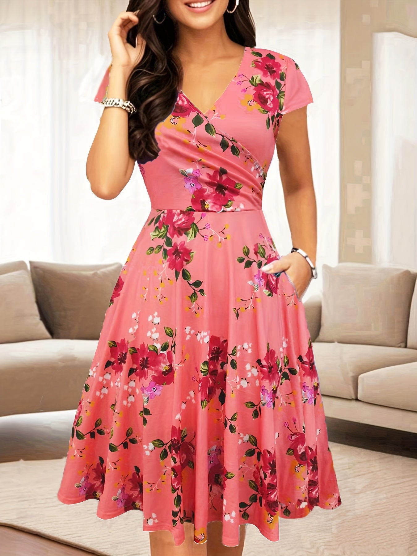 Elegant Floral Print V-Neck Dress - Knee-Length, Cap Sleeves, Pockets