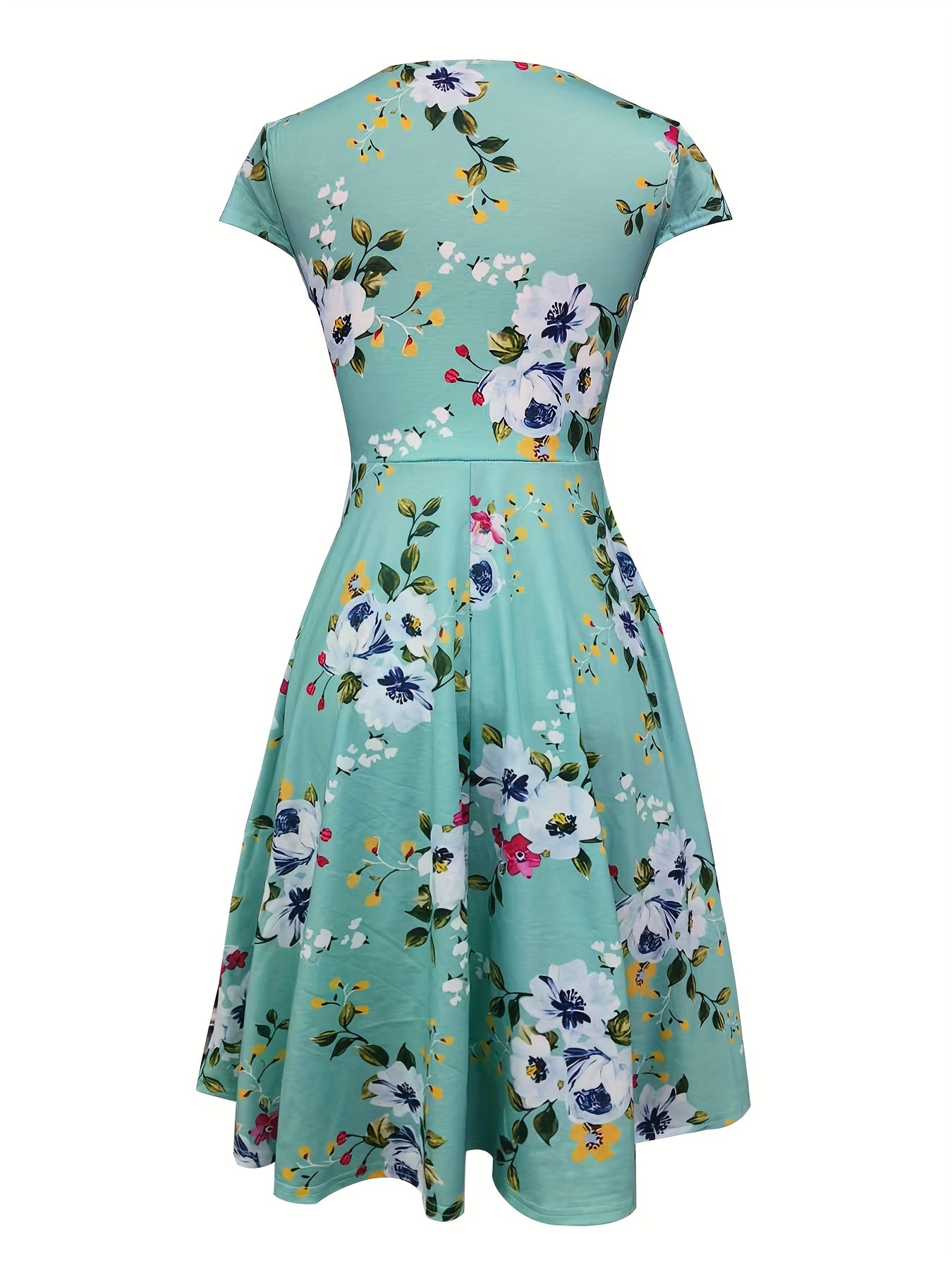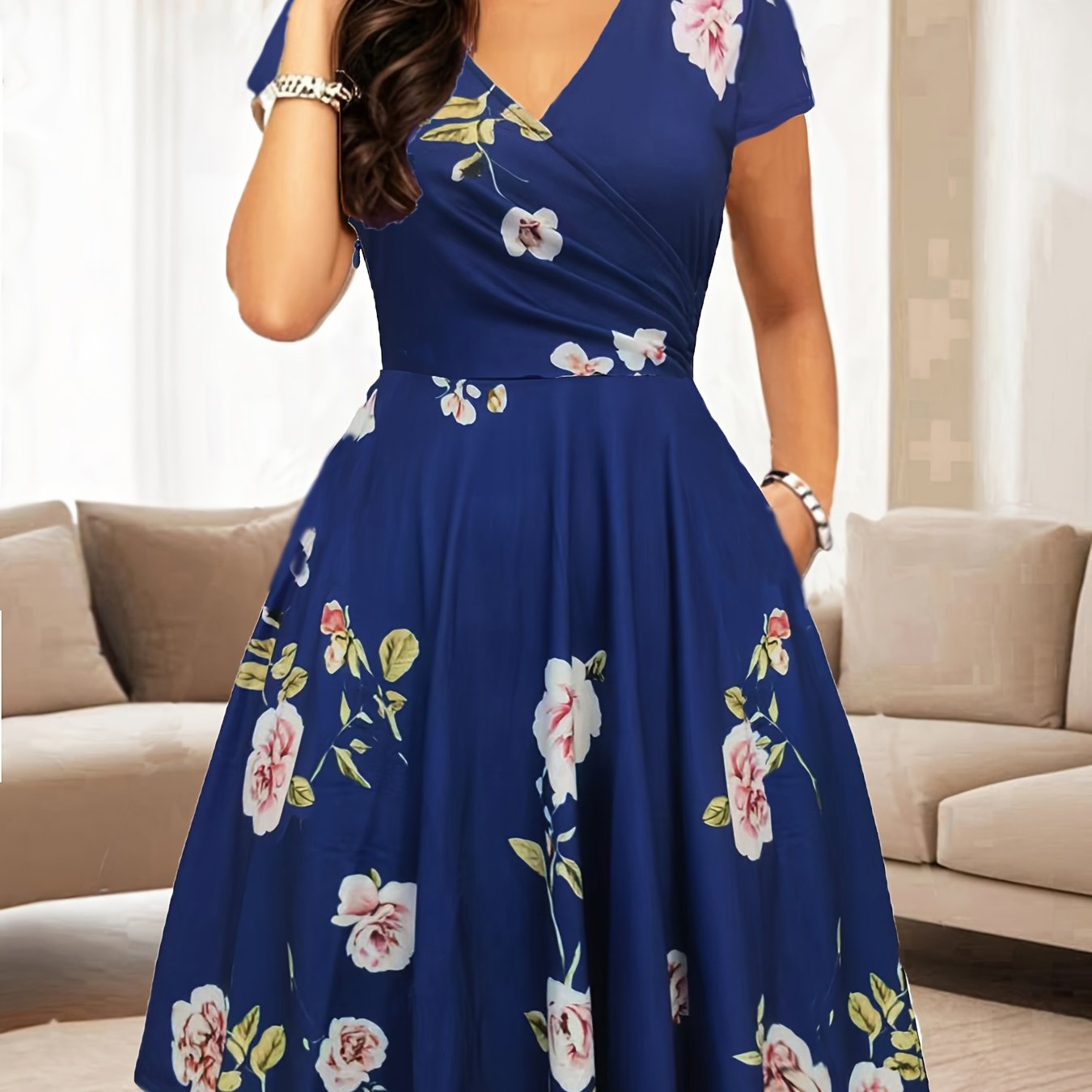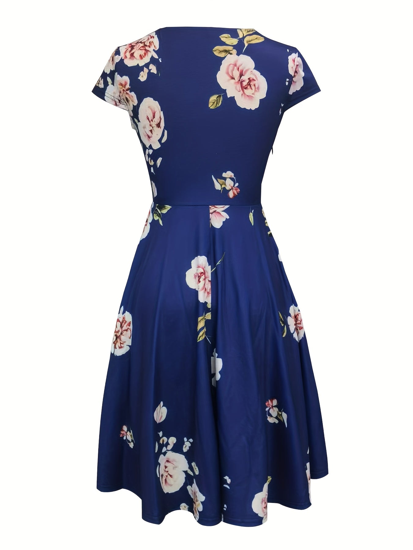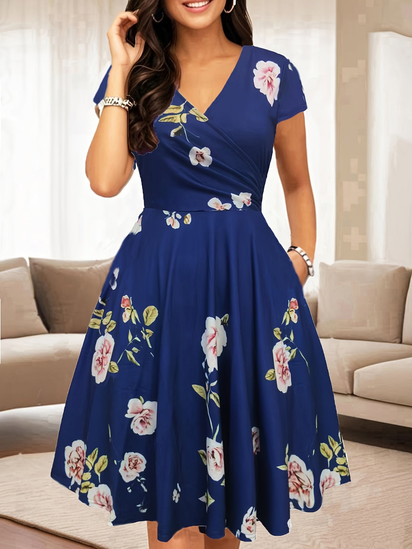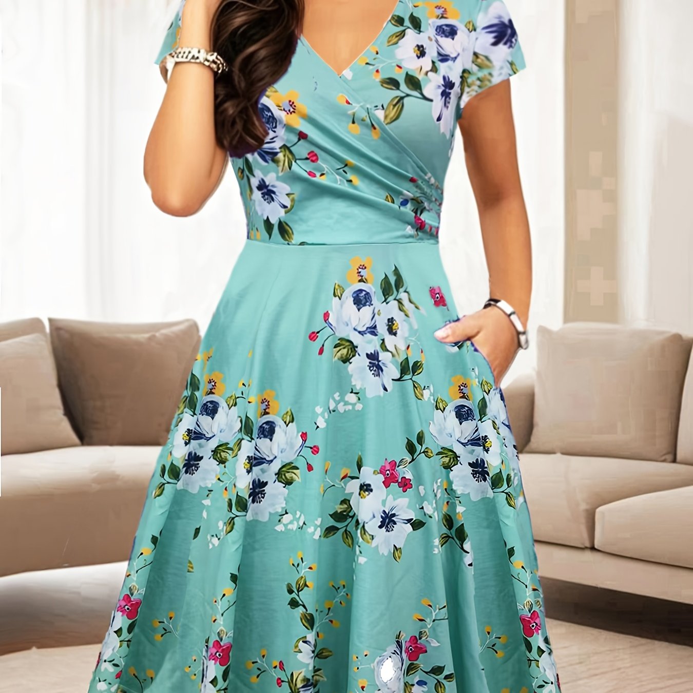 Elegant Floral Print V-Neck Dress - Knee-Length, Cap Sleeves, Pockets