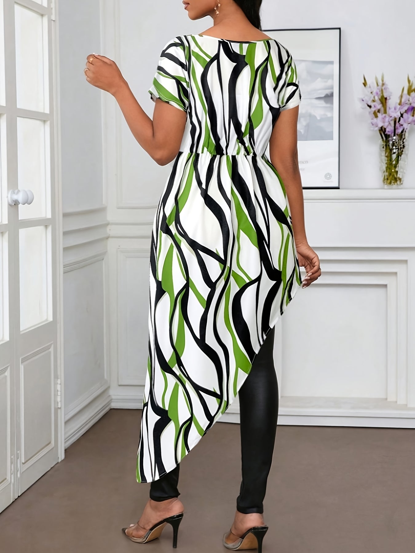 Women’s Elegant Geometric Print Maxi Dress - Short Sleeve, High-Low Hem