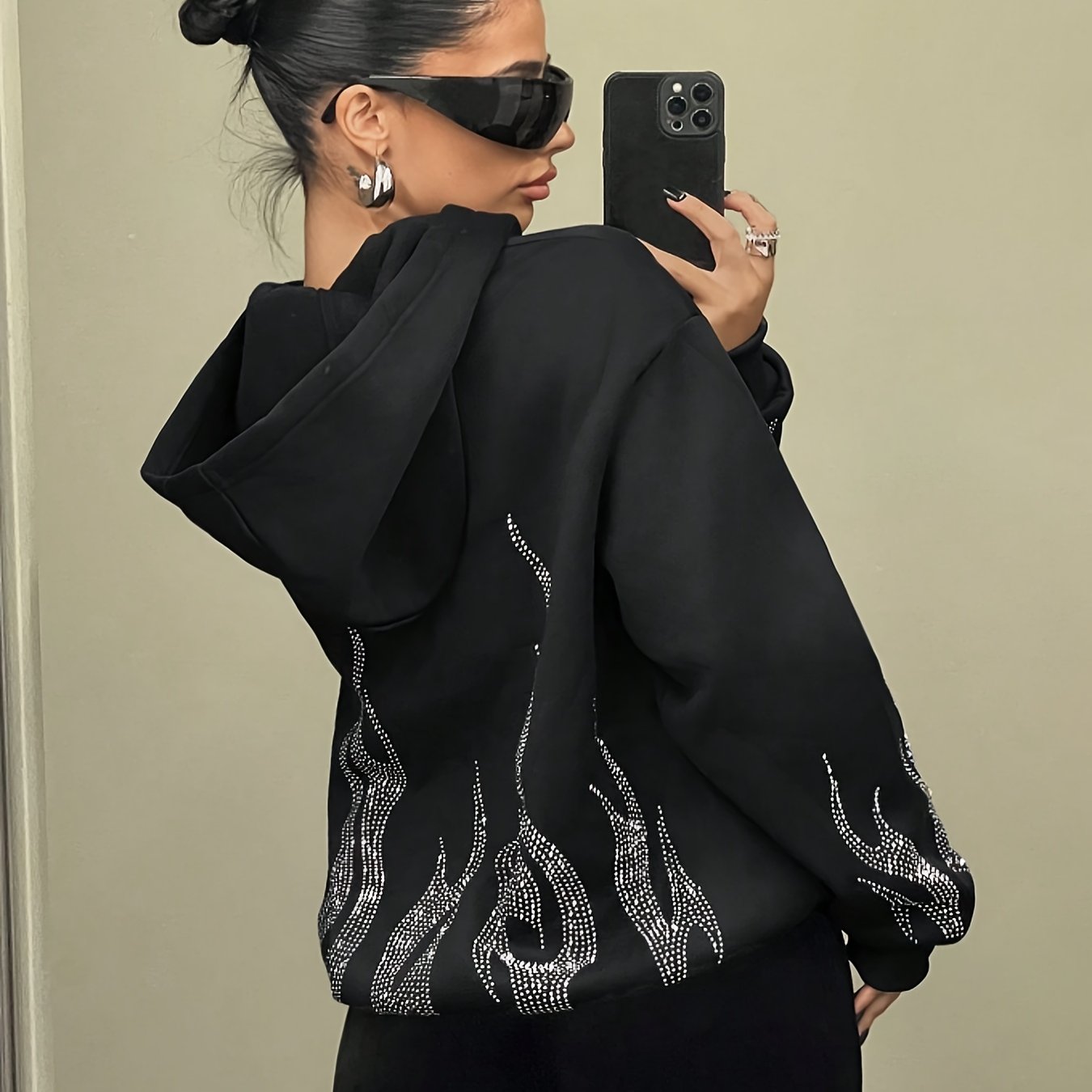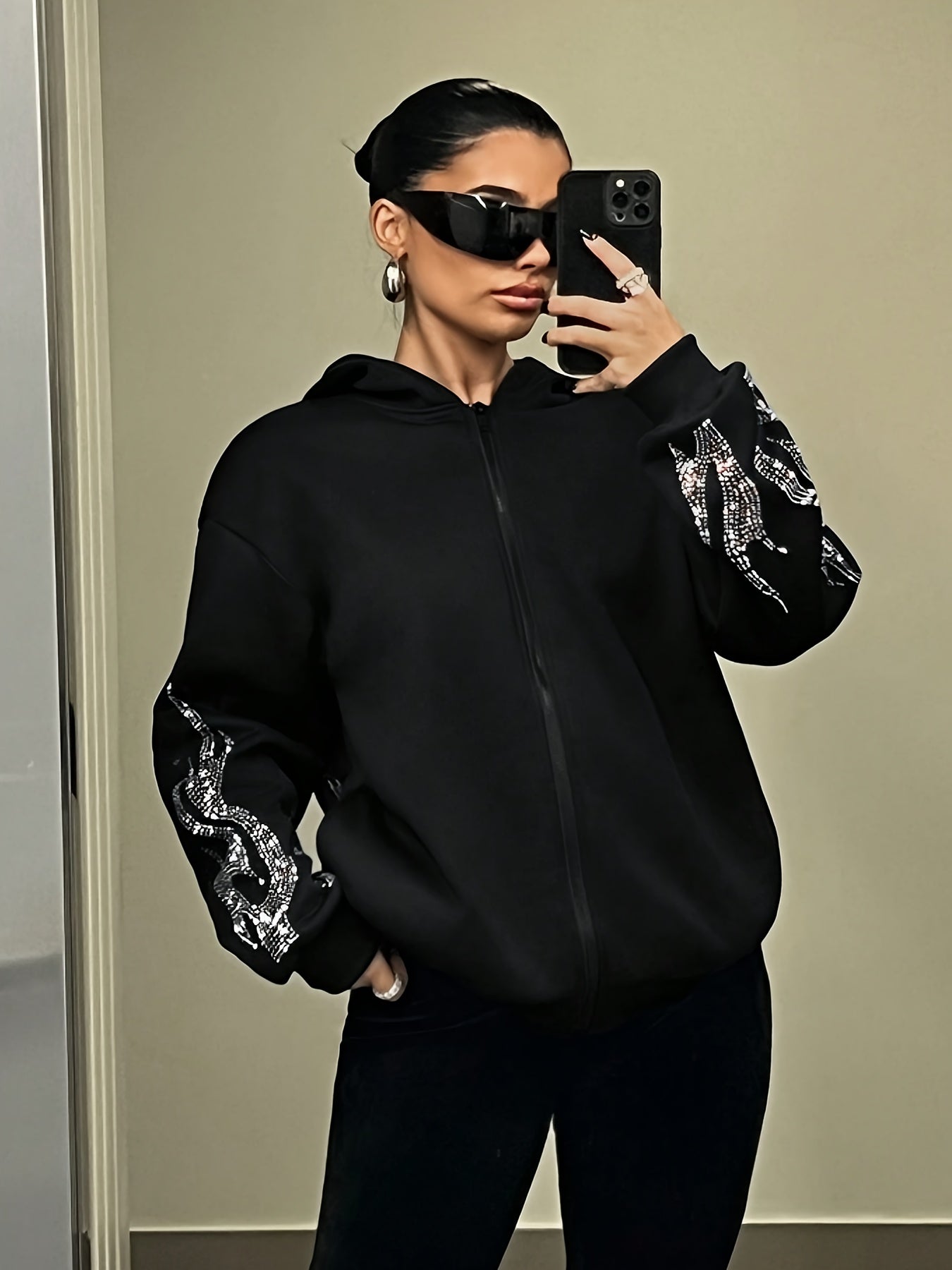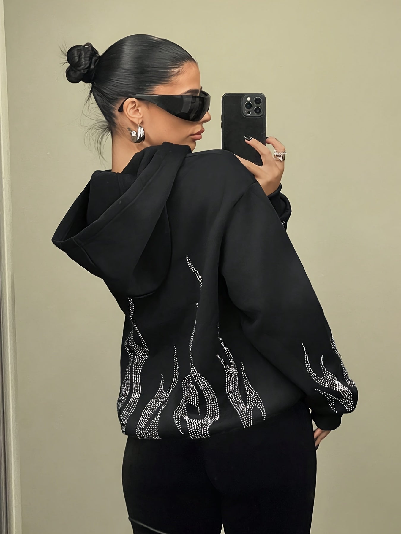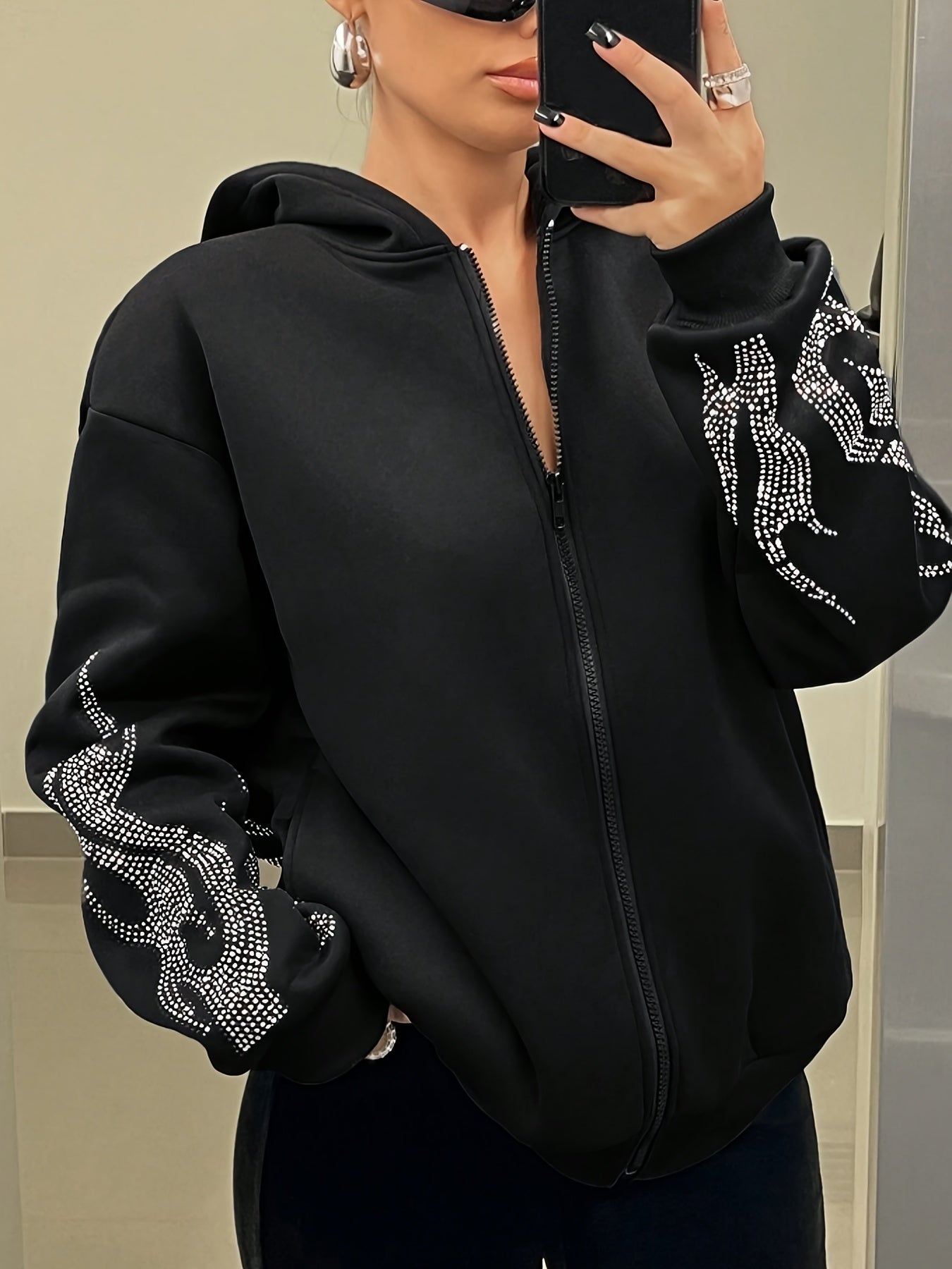 Women's Rhinestone Hooded Jacket - Elegant Flame Print, Casual Style