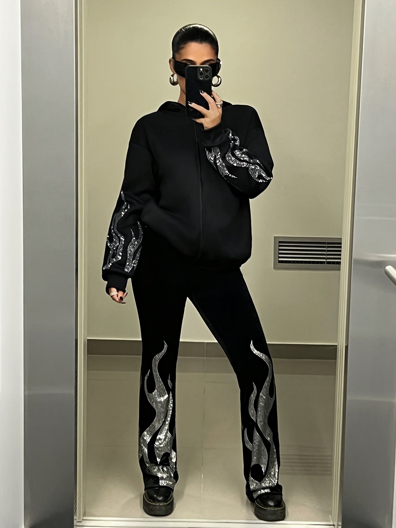 Introducing the Women's Elegant Rhinestone Flame Print Zippered Hooded Jacket, a stylish and versatile outerwear piece ideal for both casual and formal occasions. Made from durable non-stretch polyester, this hooded jacket combines comfort with elegance, featuring a stunning rhinestone flame print that adds a touch of sparkle.