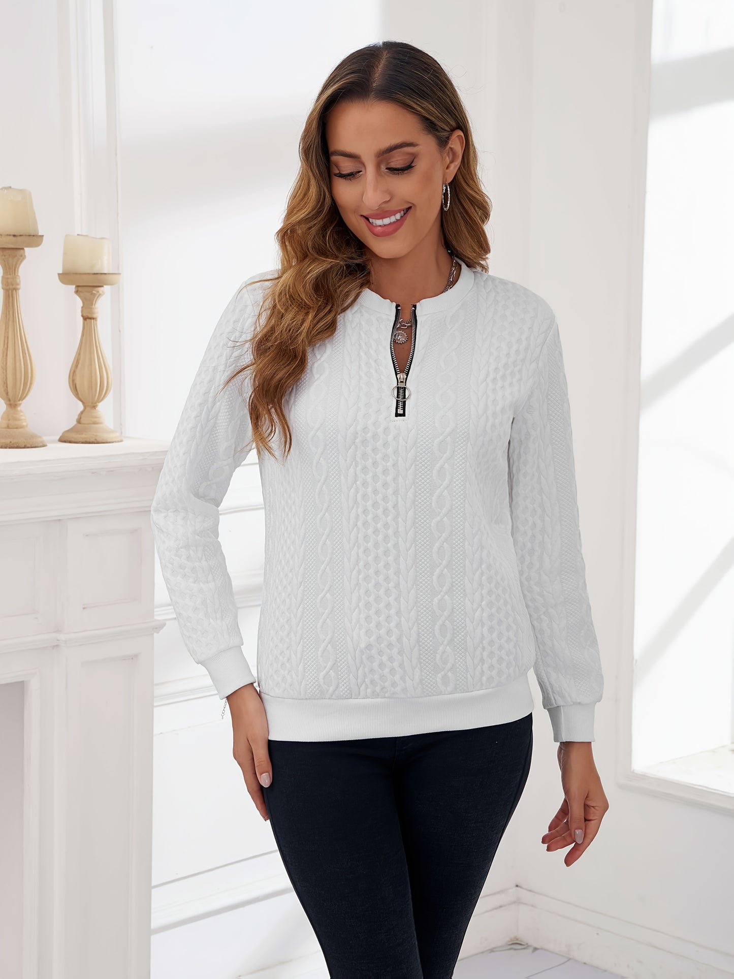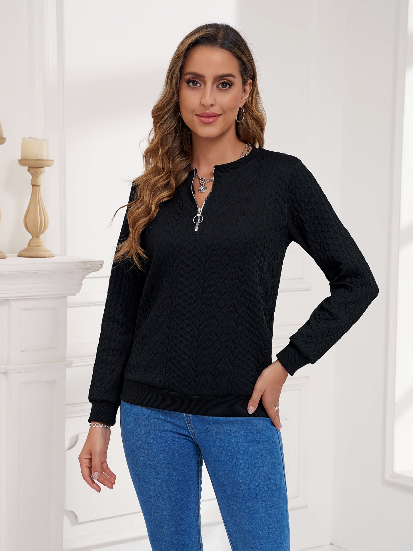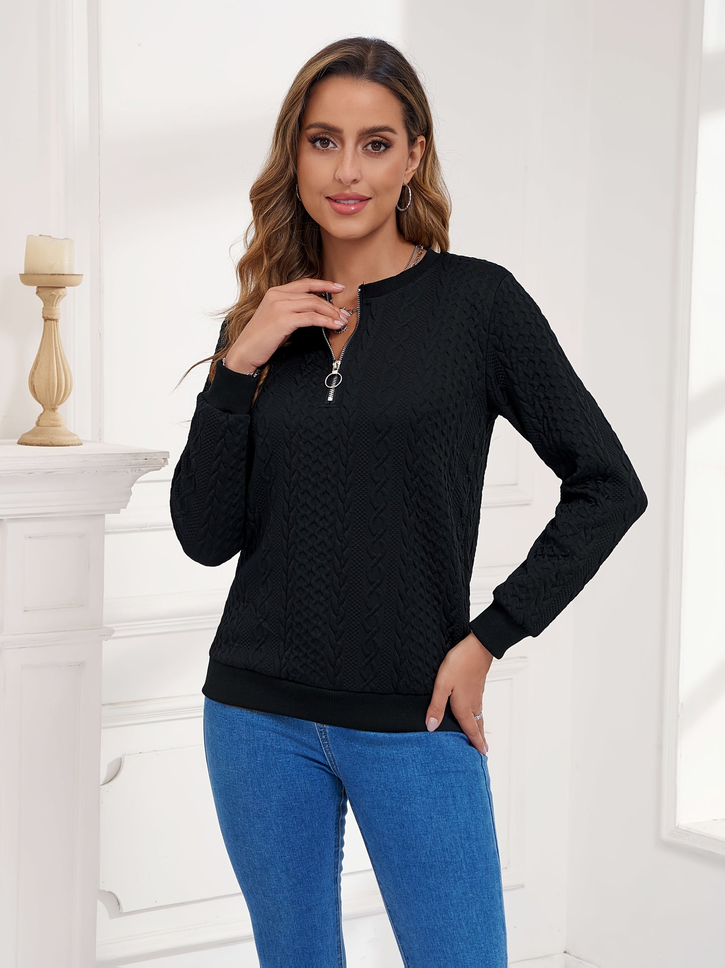 Women's Embossed Pullover Hoodie - Zippered Casual Top for Fall