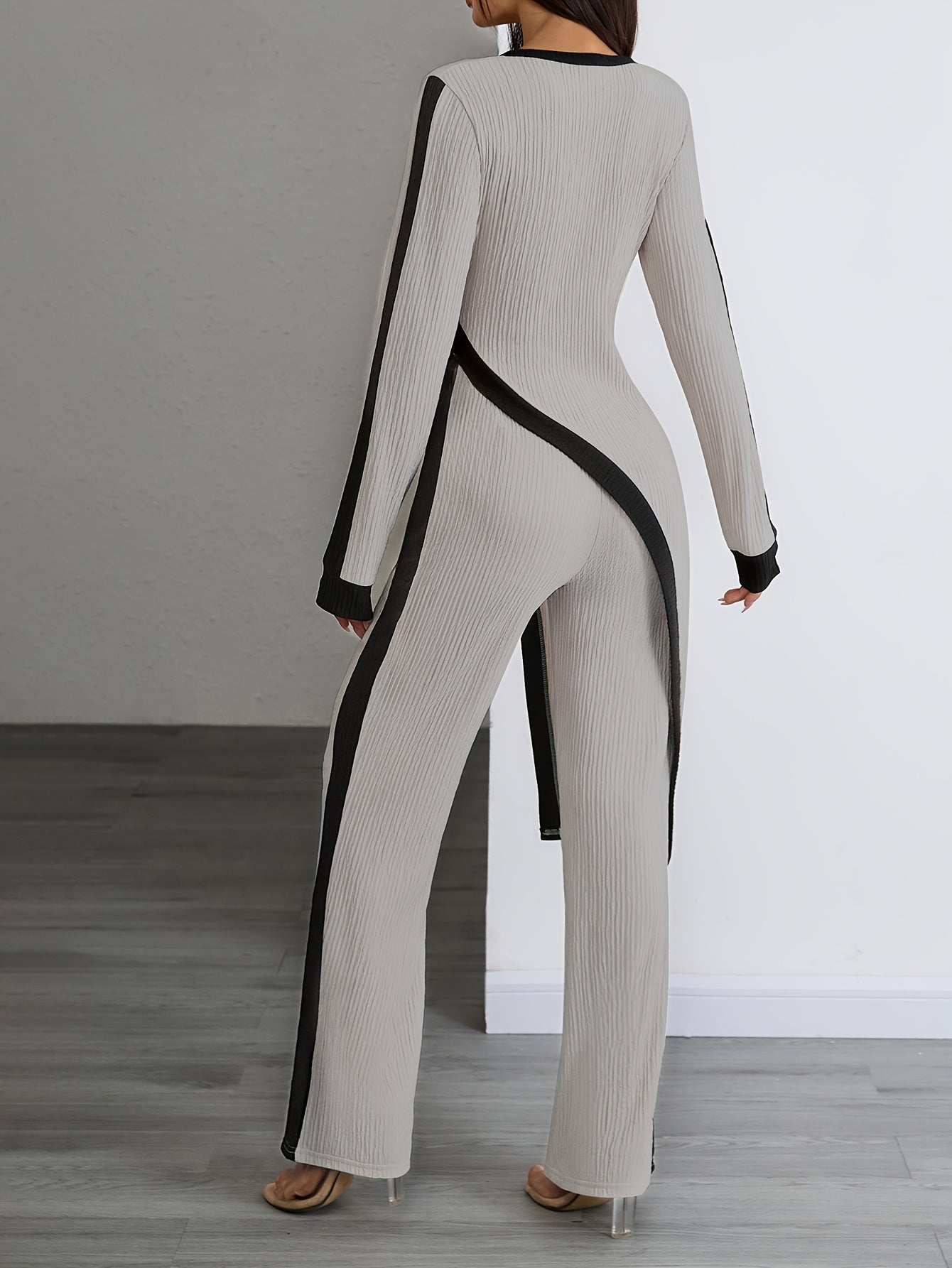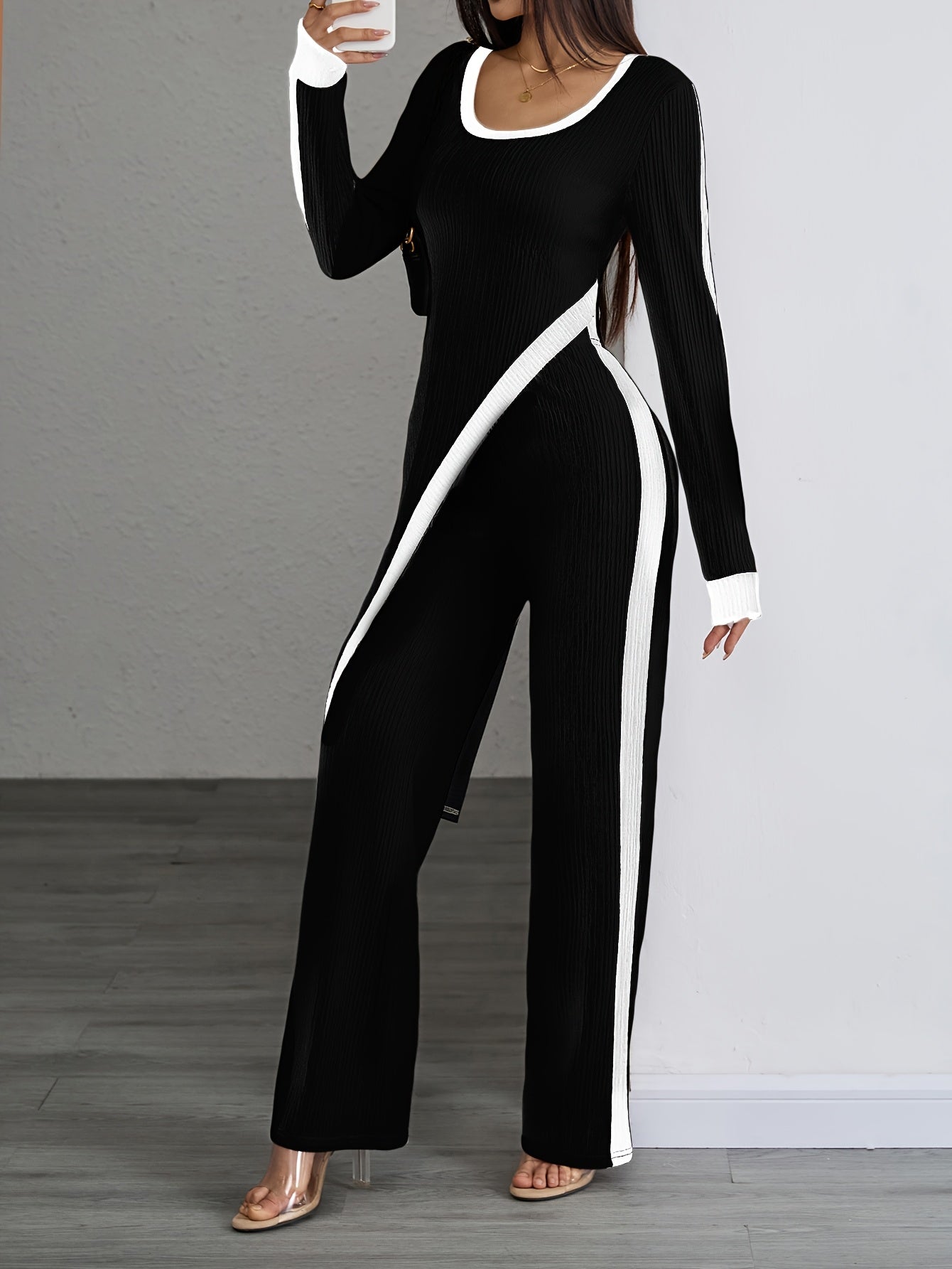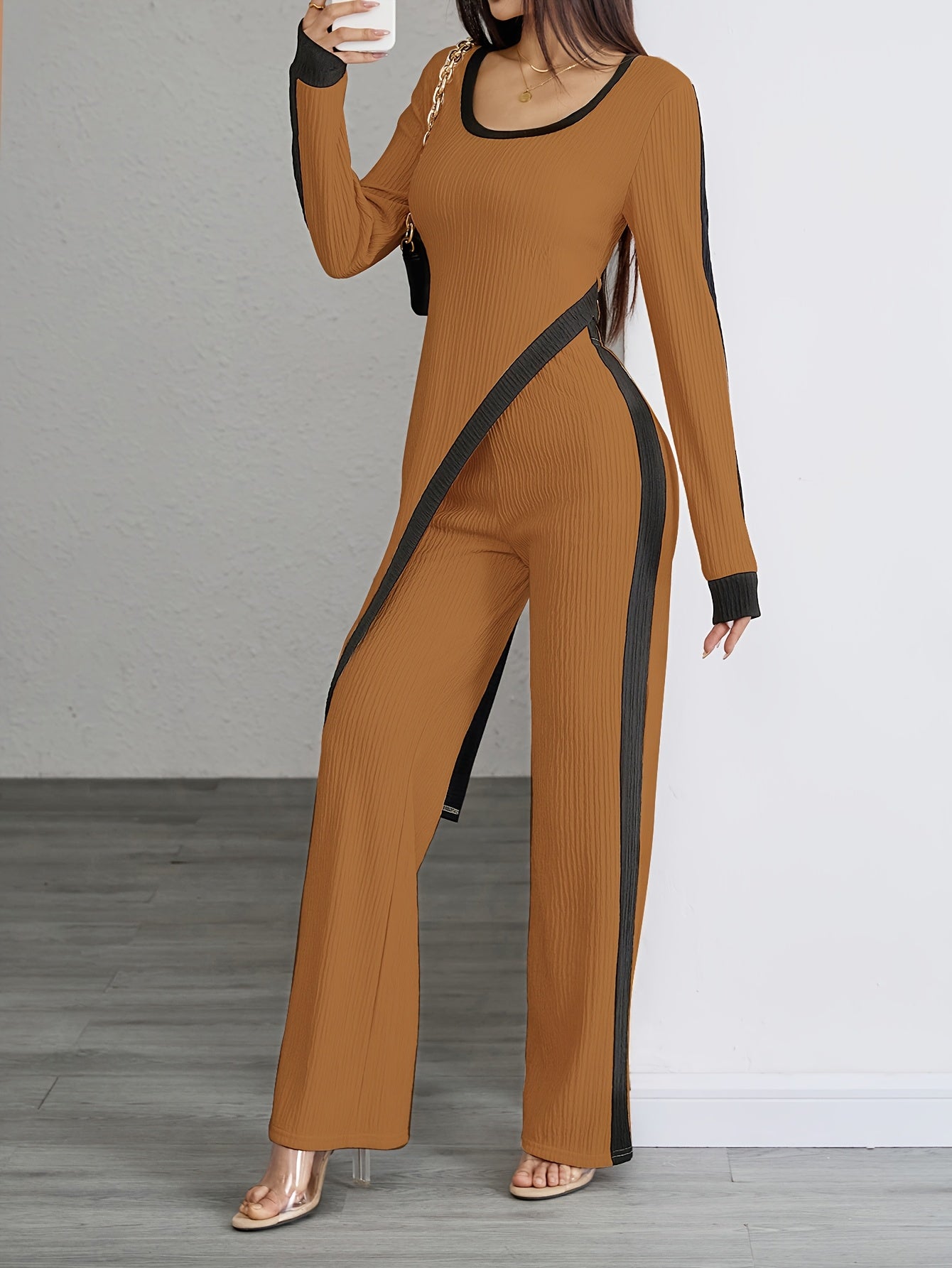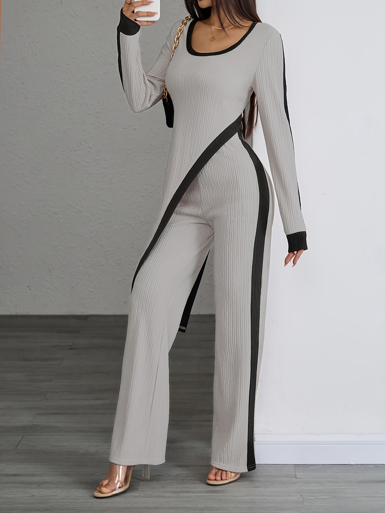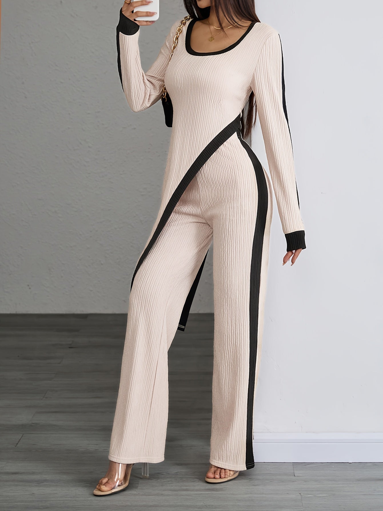Introducing the Women's Elegant Two-Piece Long Sleeve Jumpsuit in a stylish beige with striking black accents, perfect for elevating your wardrobe during the spring and fall seasons. This jumpsuit, crafted from a high-quality polyester blend, features a square neck and wide-leg pants, making it an ideal choice for both casual outings and chic occasions.