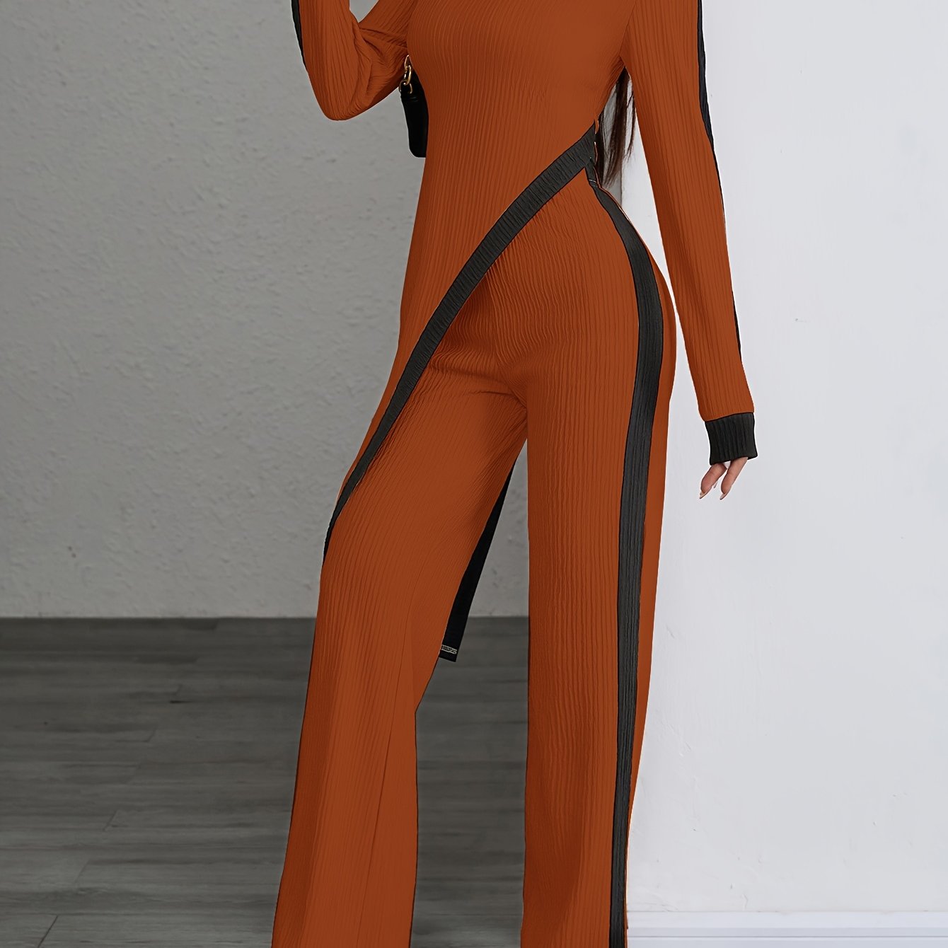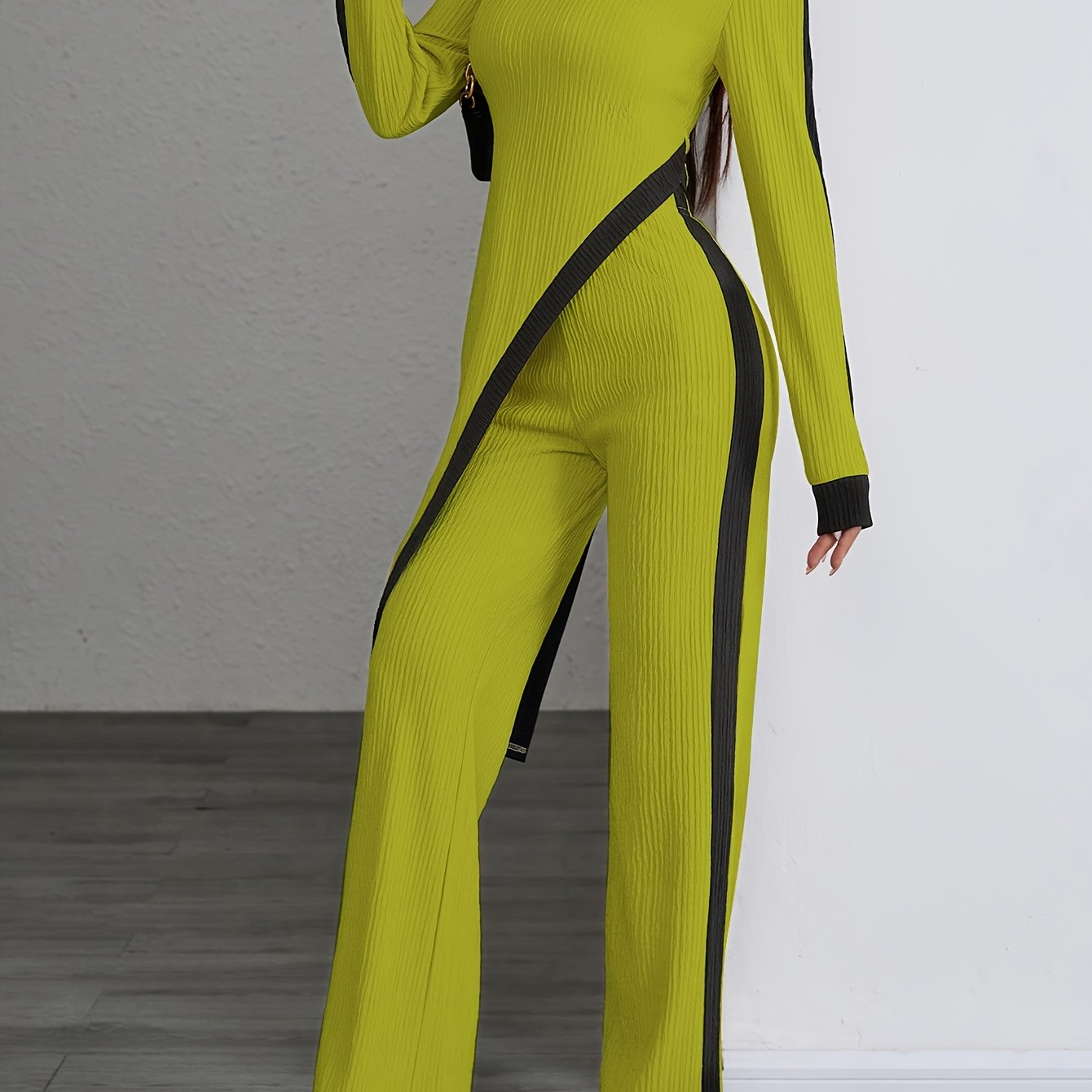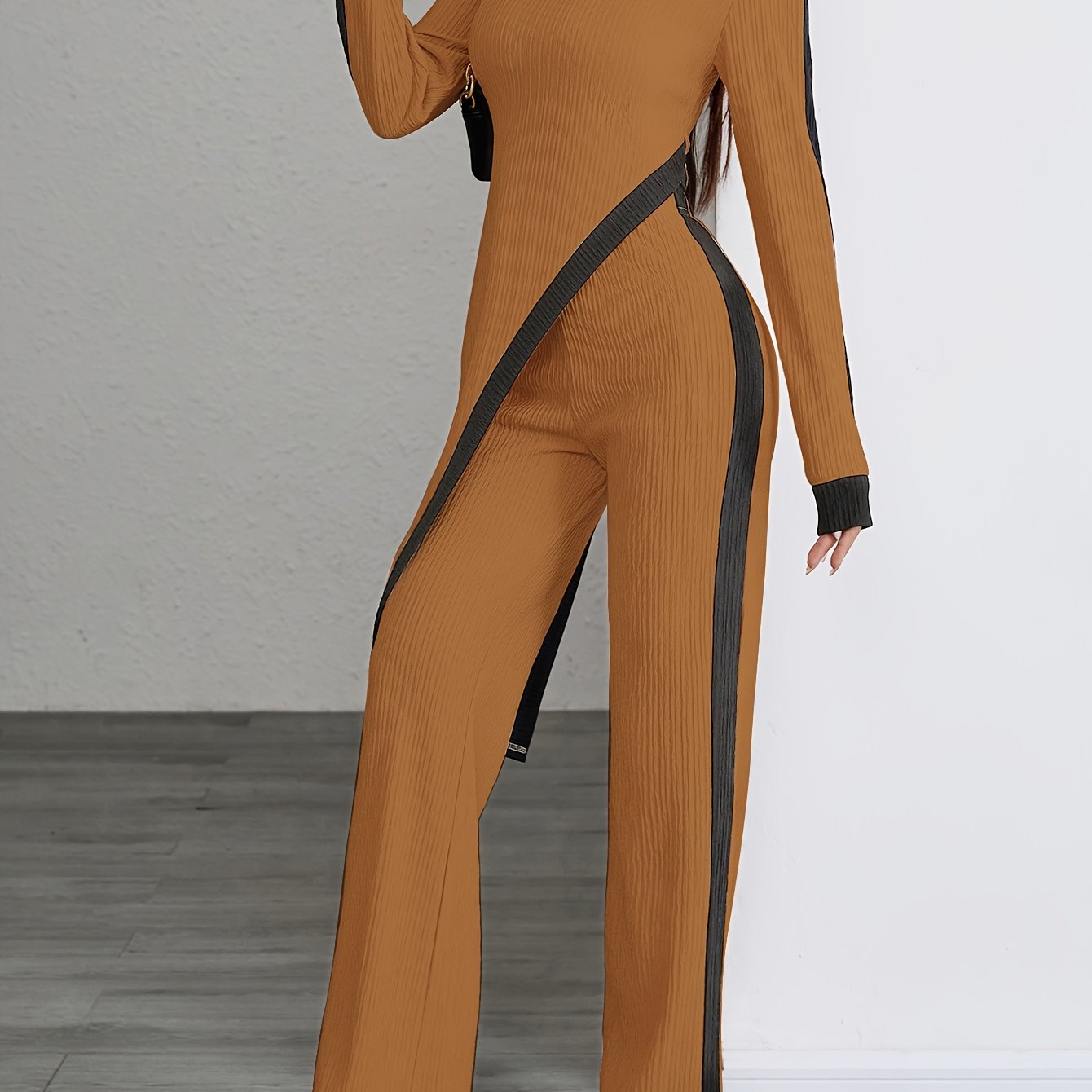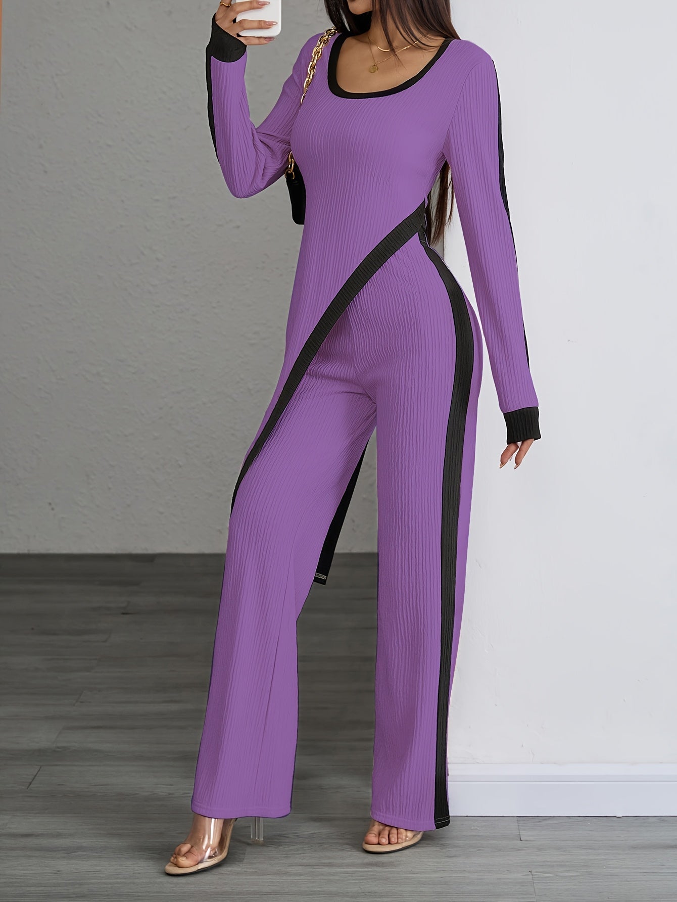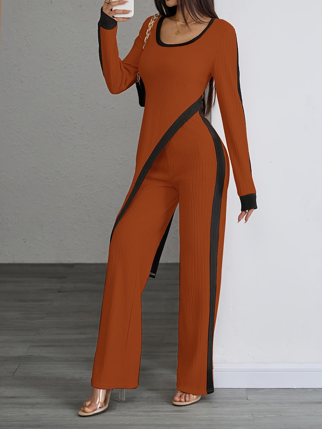 Introducing the Women's Elegant Two-Piece Long Sleeve Jumpsuit in a stylish beige with striking black accents, perfect for elevating your wardrobe during the spring and fall seasons. This jumpsuit, crafted from a high-quality polyester blend, features a square neck and wide-leg pants, making it an ideal choice for both casual outings and chic occasions.