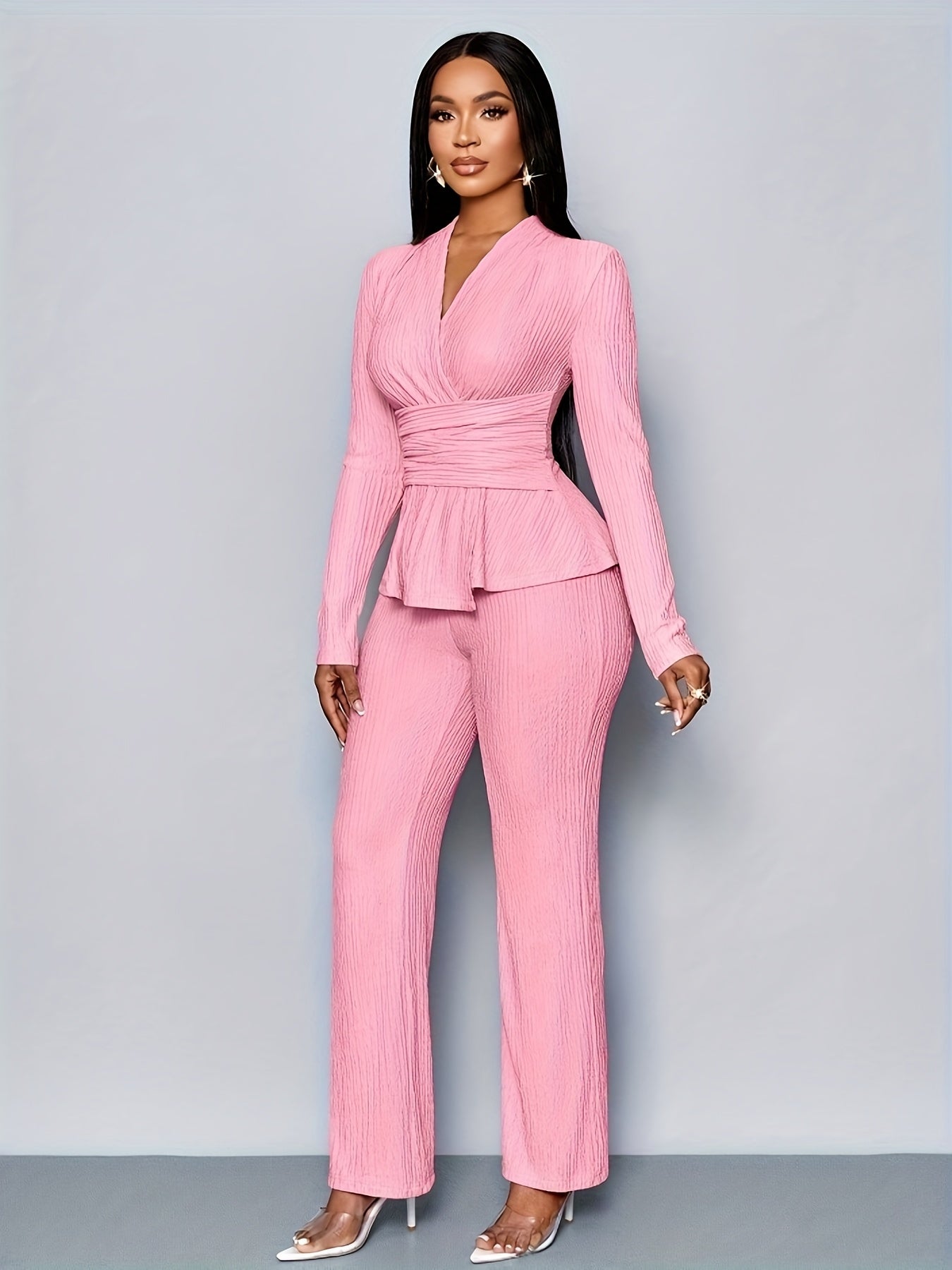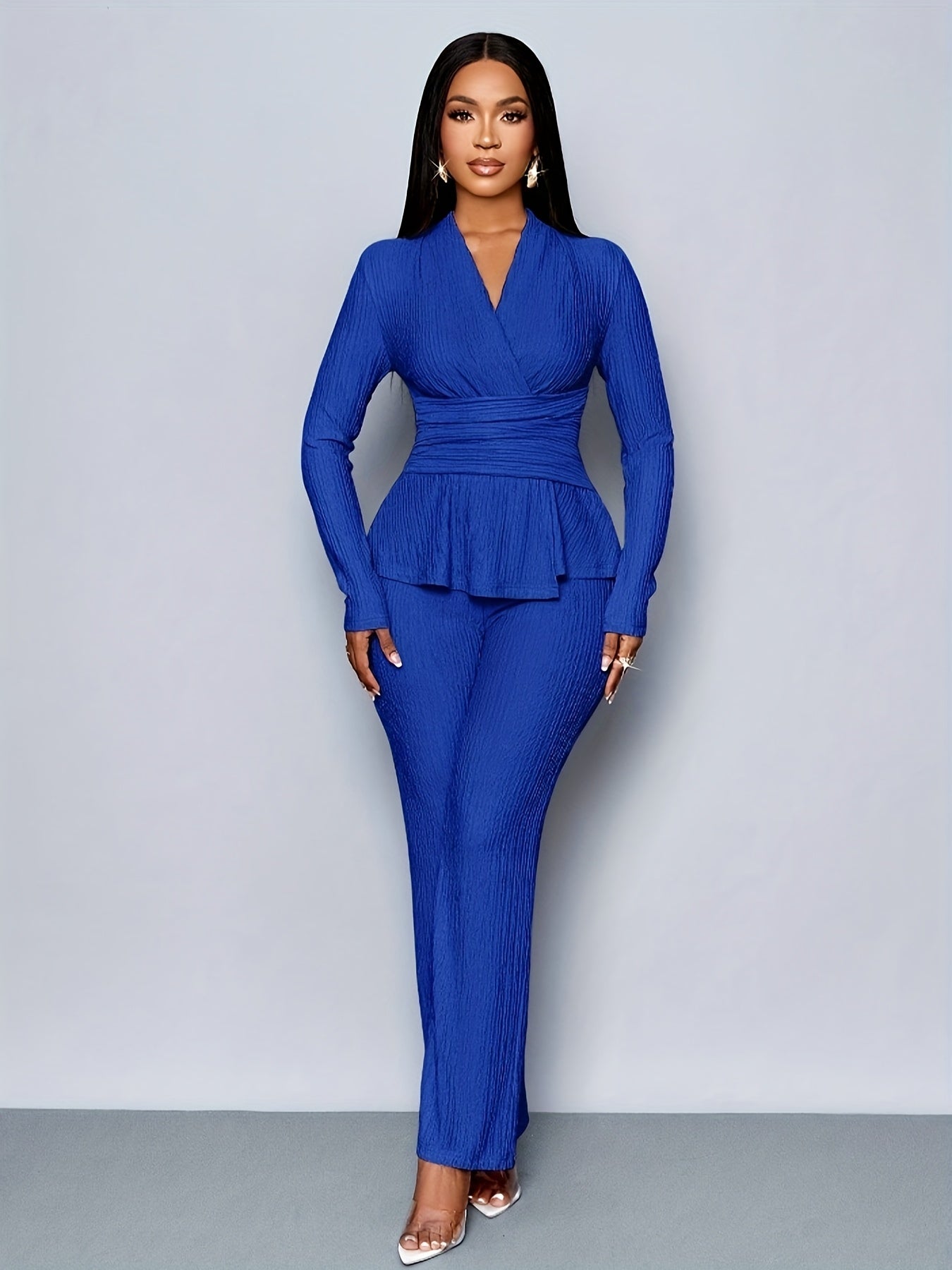 Elegant Women's V-Neck Long Sleeve Top & Wide Leg Pants Set