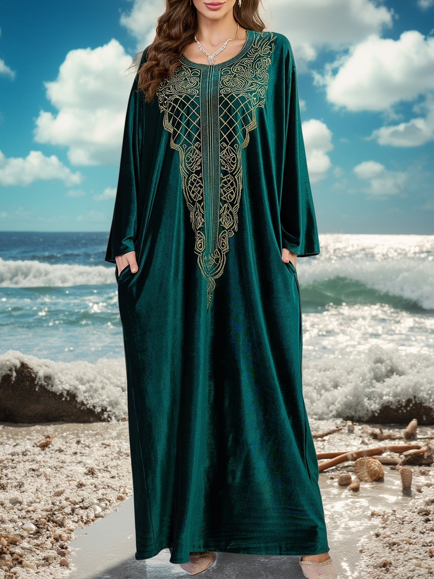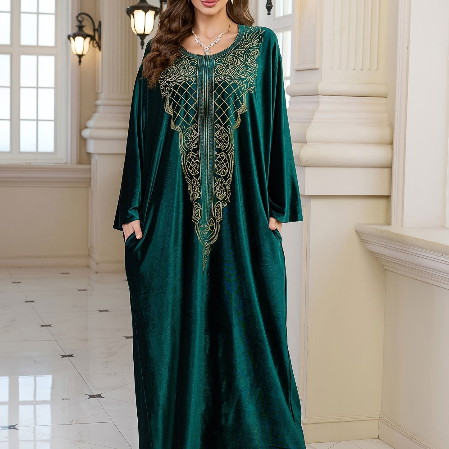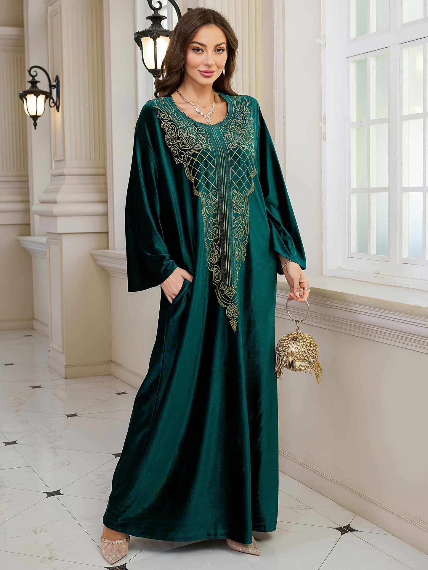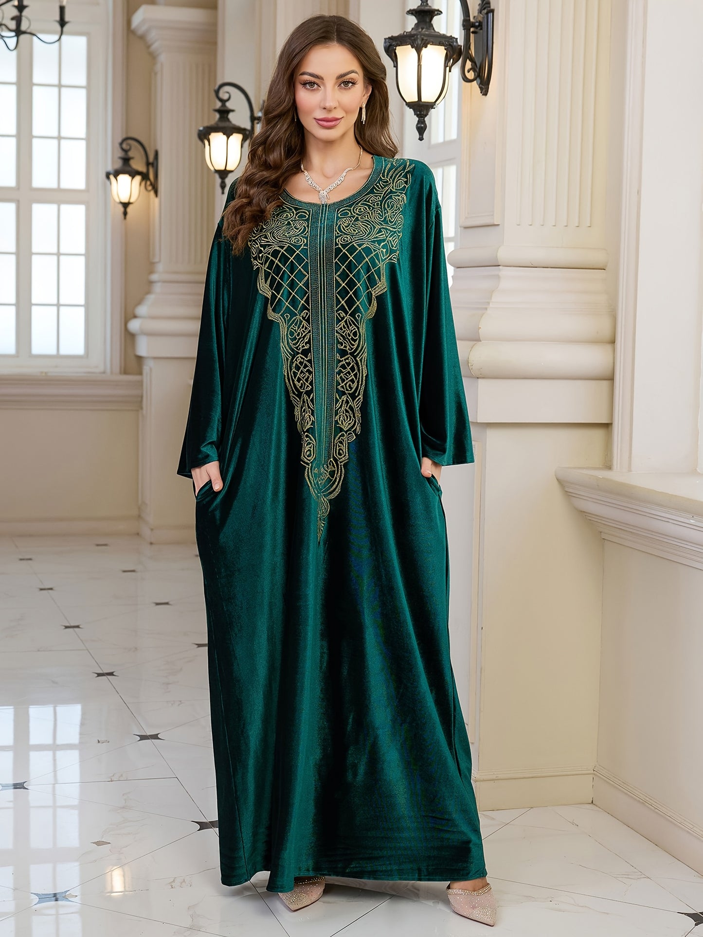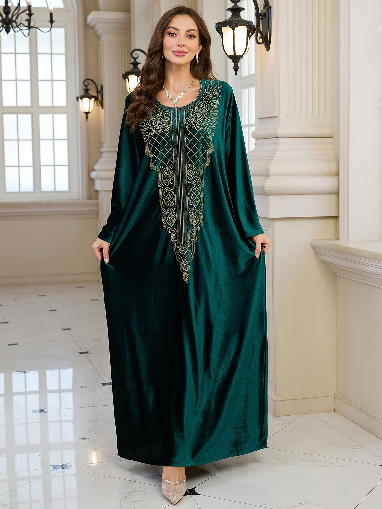EDOLYNSA Elegant Long Sleeve Kaftan Dress - Dark Green Embroidery