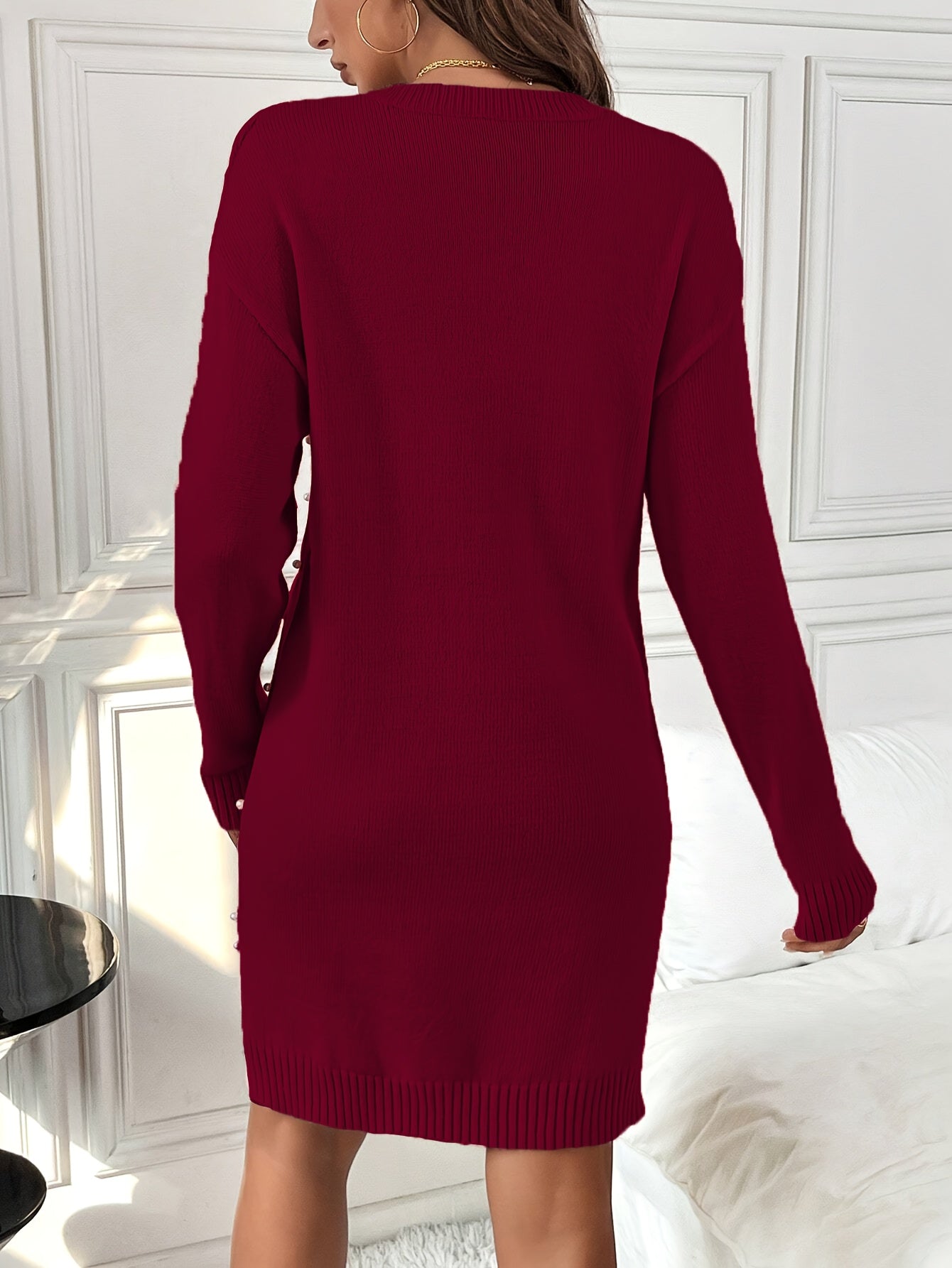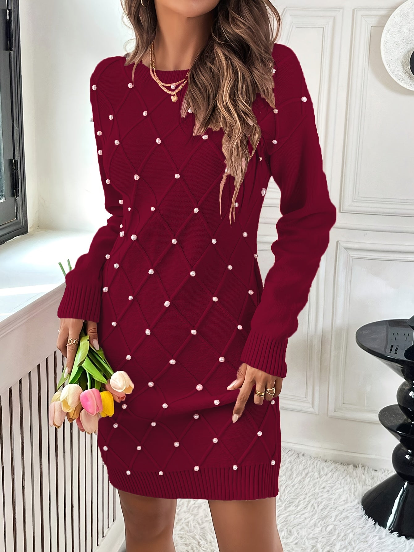 Experience the perfect blend of elegance and comfort with our Women's Elegant Beaded Sweater Dress. Crafted from 100% polyester, this knee-length knit dress features a crew neck and long sleeves, making it an ideal choice for the fall and winter seasons.